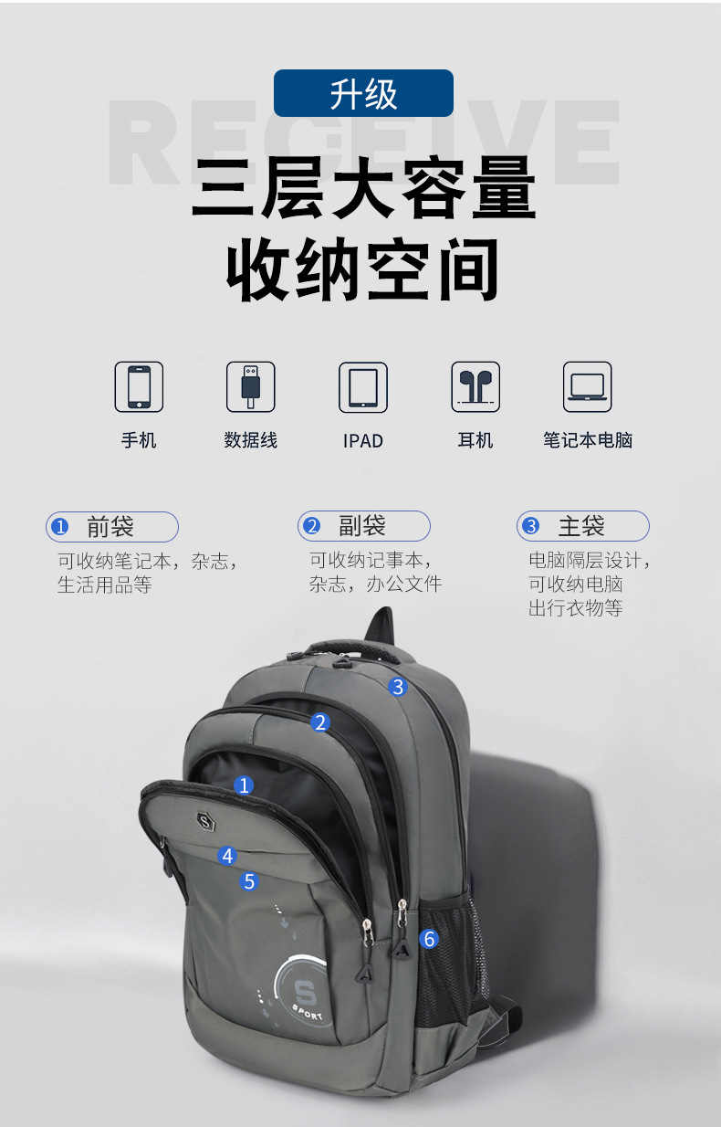 남자와 중학생을위한 2024 새로운 스타일 스쿨 백 남학생과 중학생을위한 남성 대용량 배낭 능선 보호