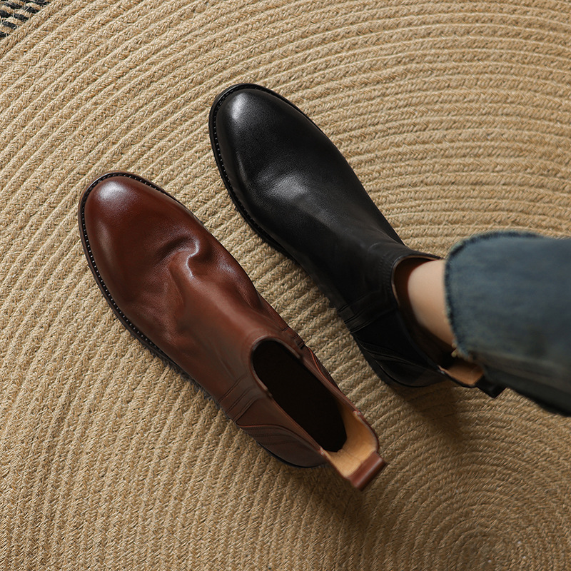 명관 4cm 프렌치 스타일 숏부츠 여성용 앵클부츠 두꺼운 굽 2025 가을 겨울 신상 천연가죽 미드힐 첼시부츠