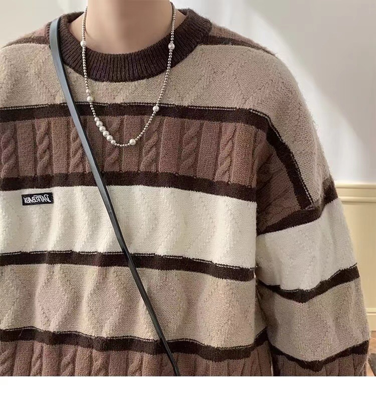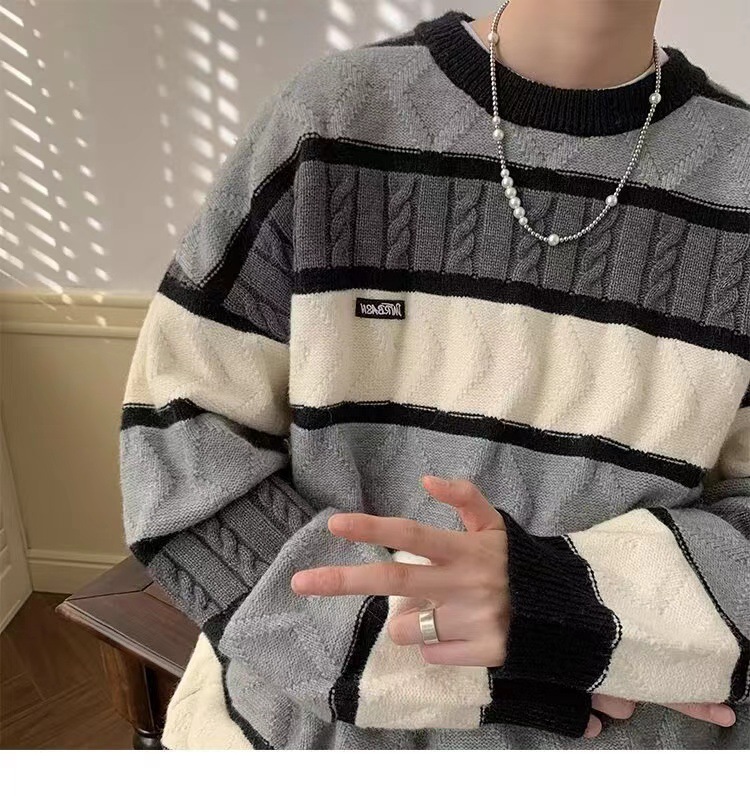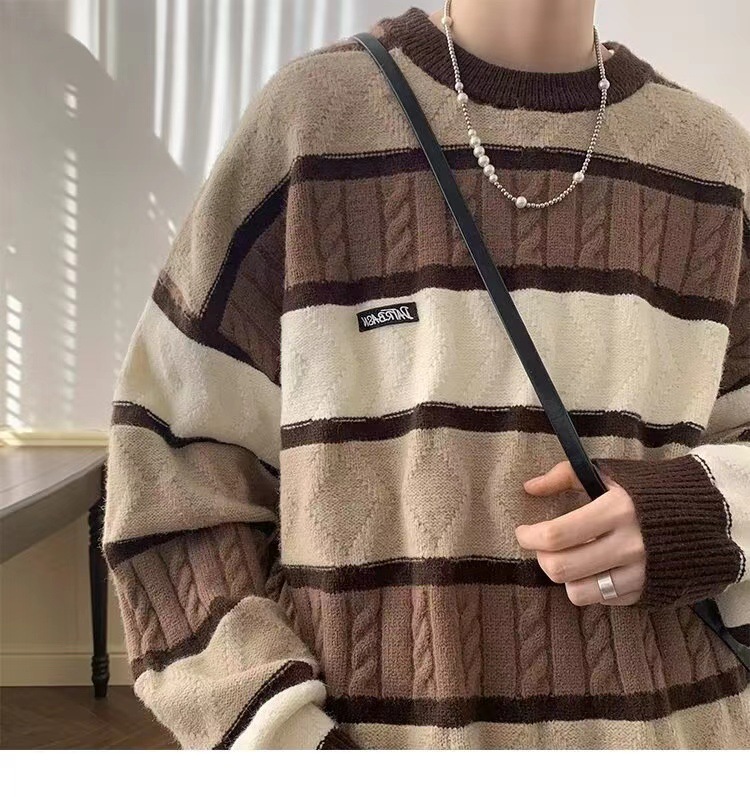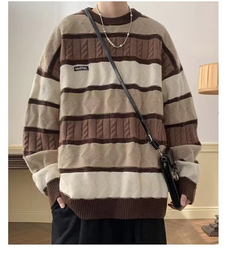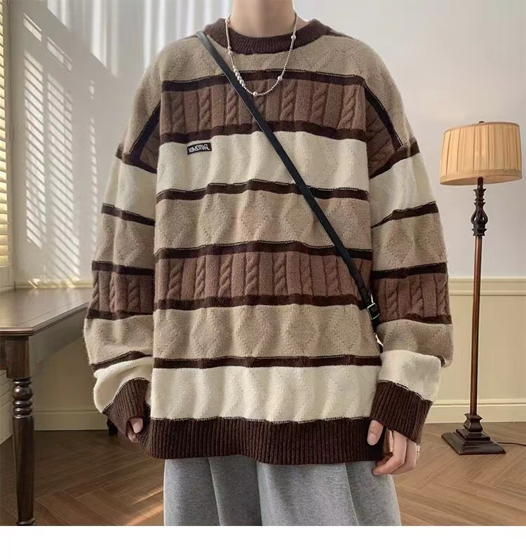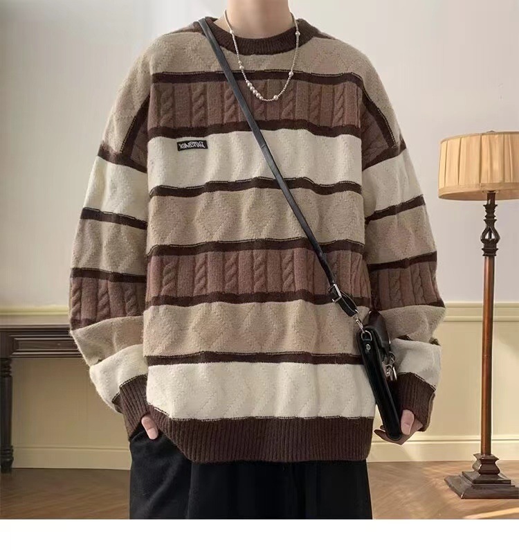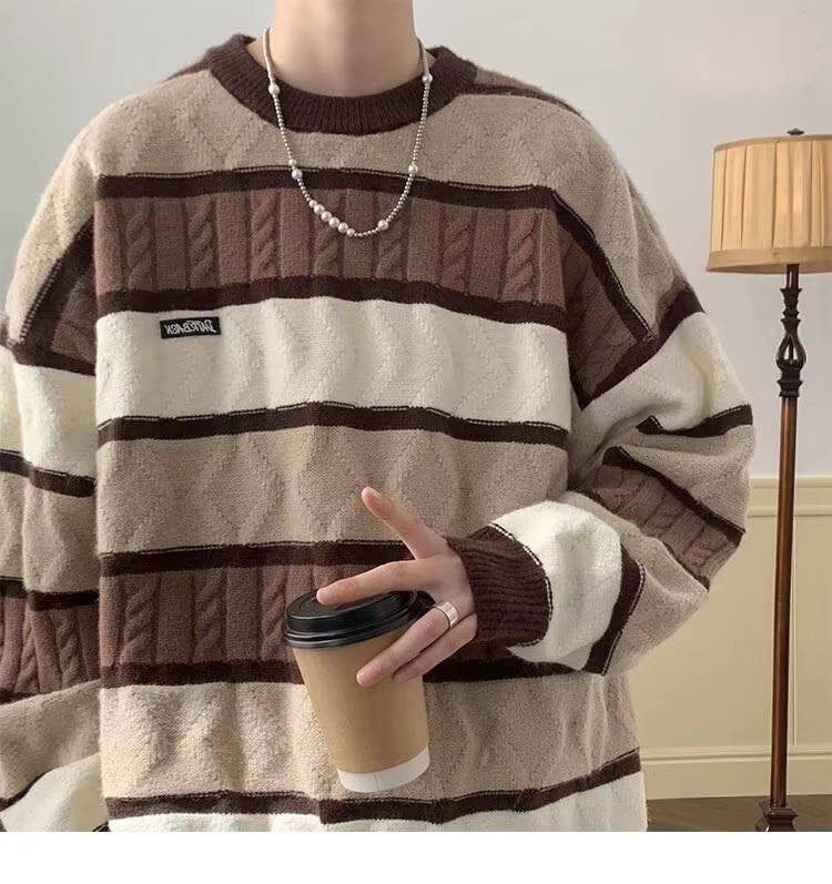 가을과 겨울 두꺼운 스웨터 남자 한국식 패셔너블 루즈 스트라이프 니트 스웨터 겨울 올 매치 홍콩 스타일 게으른 스웨터 재킷