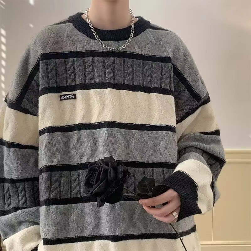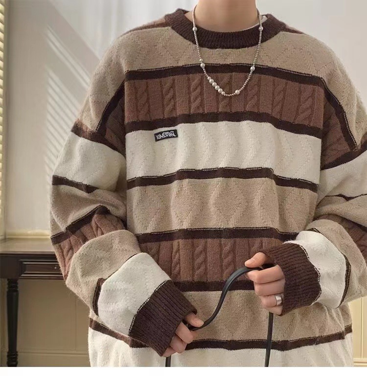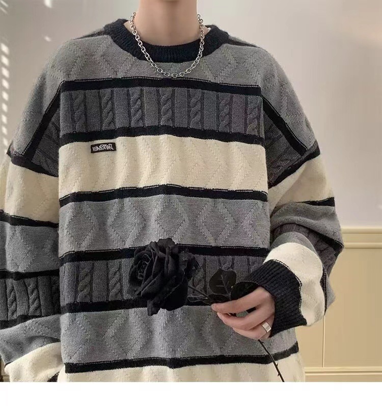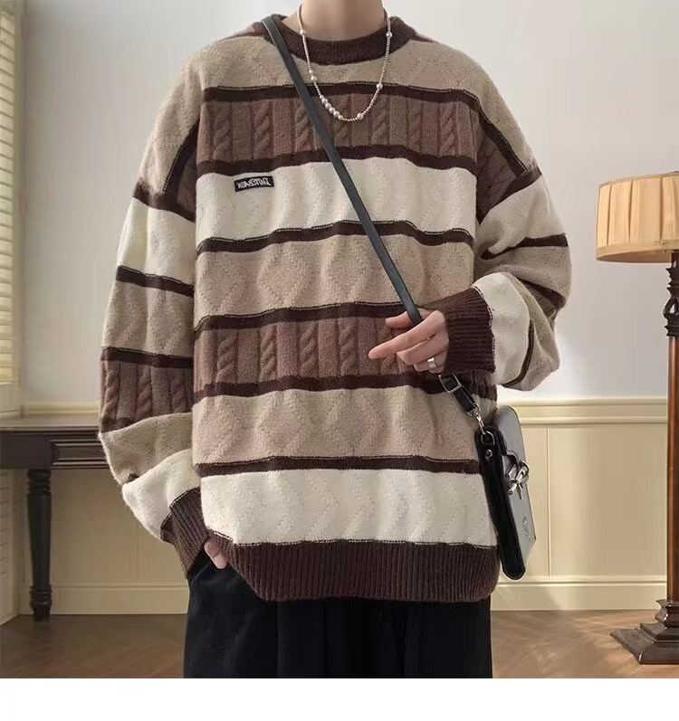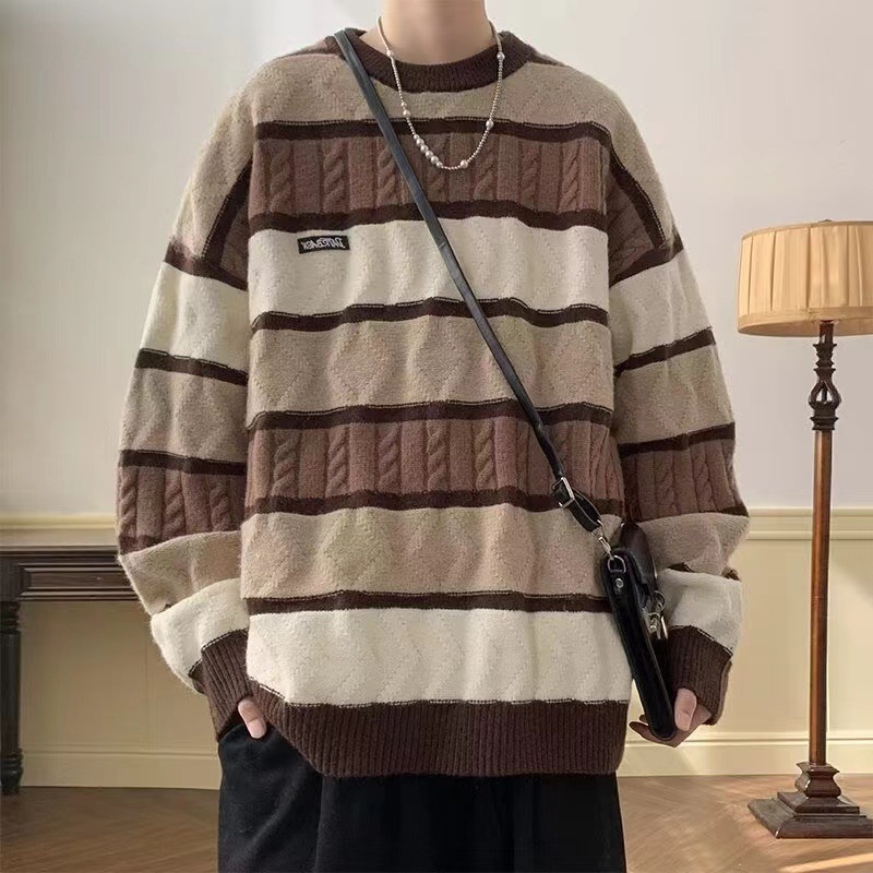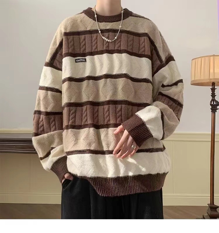 가을과 겨울 두꺼운 스웨터 남자 한국식 패셔너블 루즈 스트라이프 니트 스웨터 겨울 올 매치 홍콩 스타일 게으른 스웨터 재킷