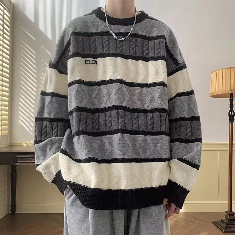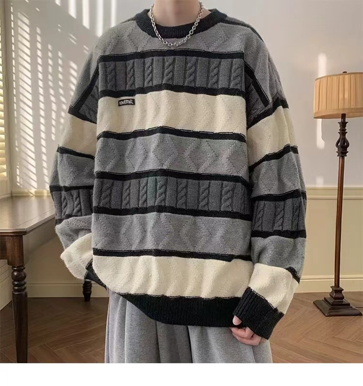 가을과 겨울 두꺼운 스웨터 남자 한국식 패셔너블 루즈 스트라이프 니트 스웨터 겨울 올 매치 홍콩 스타일 게으른 스웨터 재킷스토어 가기