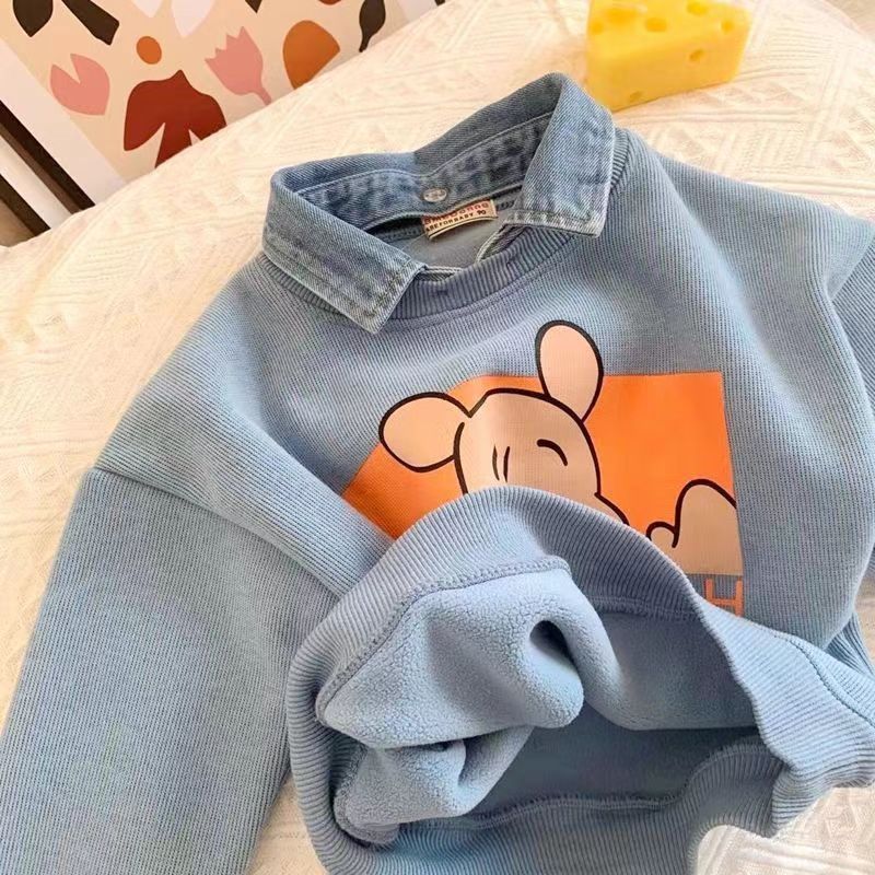 24 년 봄과 가을 새 소년 스웨터 스타일 캐주얼 어린이 느슨한 긴 소매 탑 아기 가짜 투피스 스웨터스토어 가기
