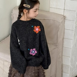 女童圆领套头毛衣2024秋冬新款儿童彩色提花刺绣秋冬宽松休闲上衣