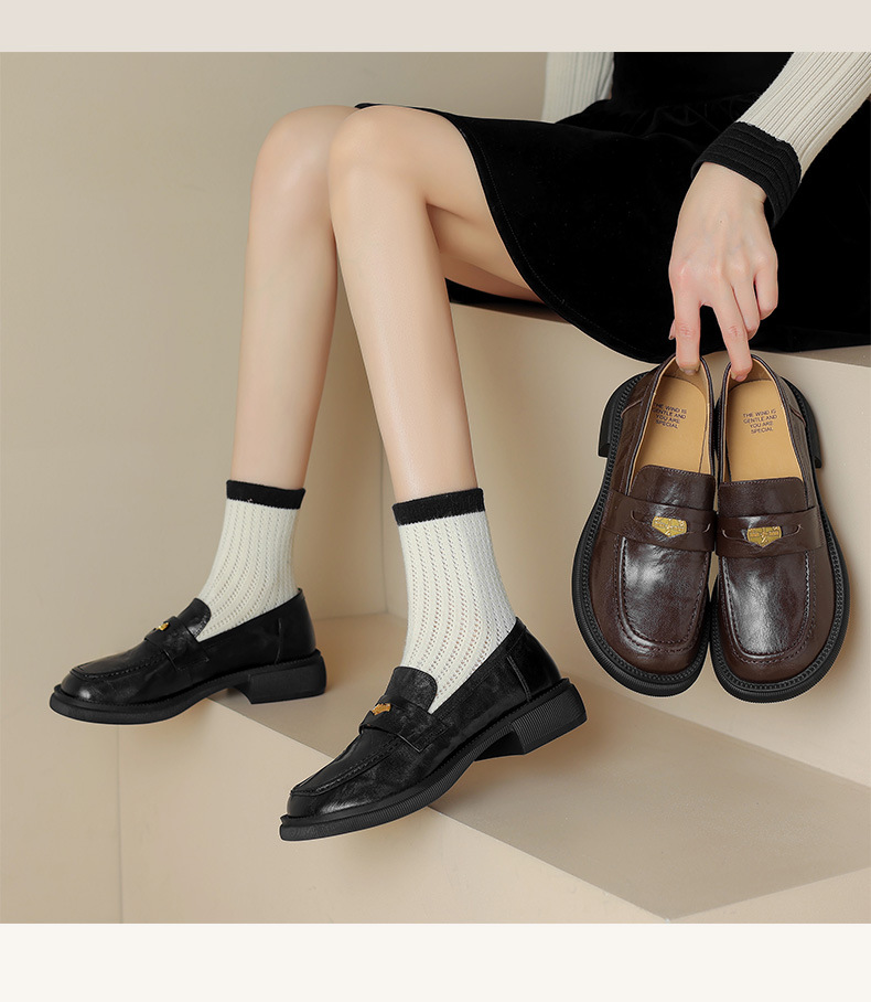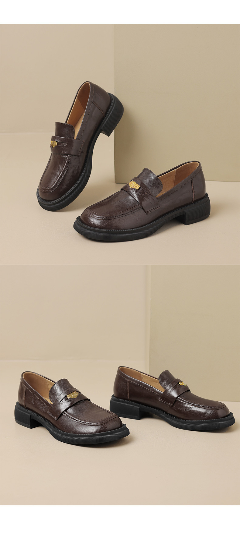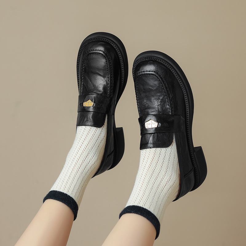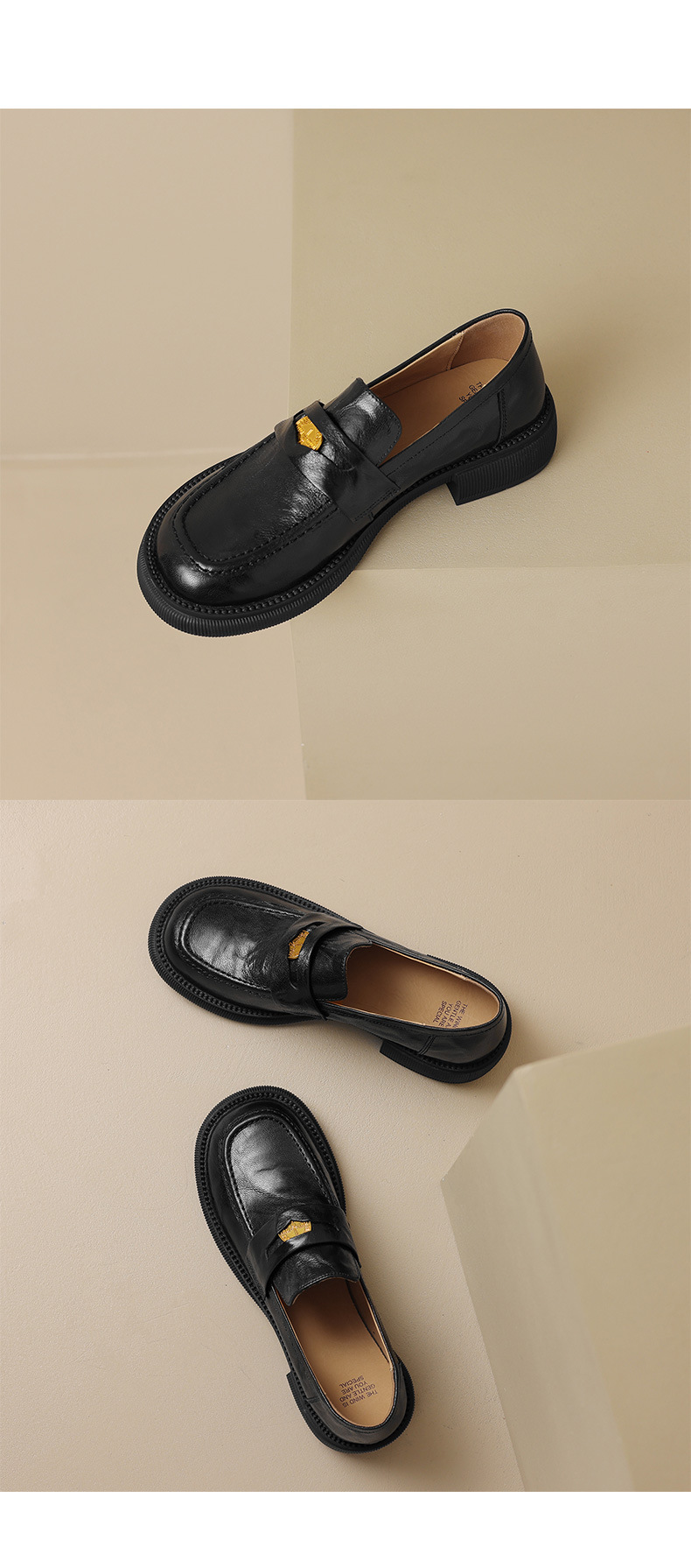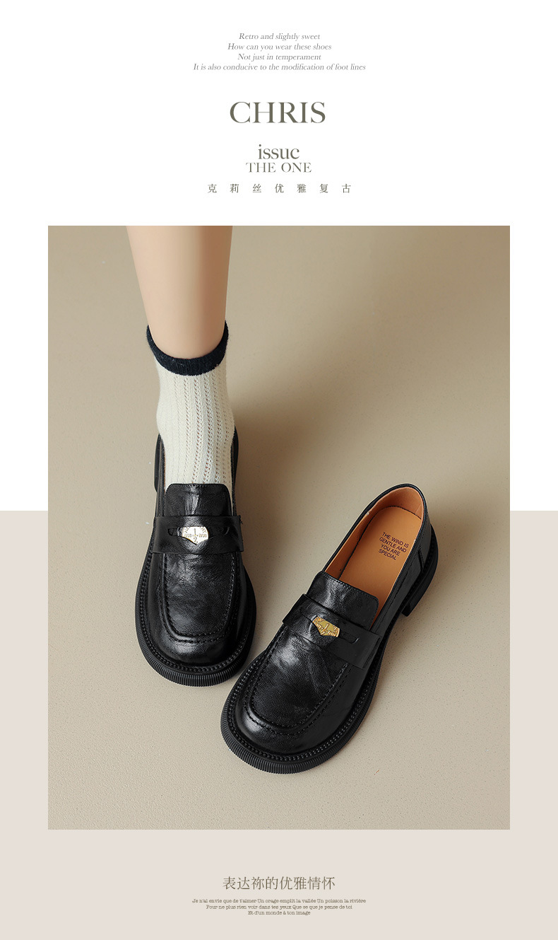 영국 스타일 양가죽 로퍼 여성 청키 힐 2024 봄과 가을 새로운 라운드 발가락 딥 입 싱글 레이어 신발 빈티지 골드 코인 가죽 신발스토어 가기