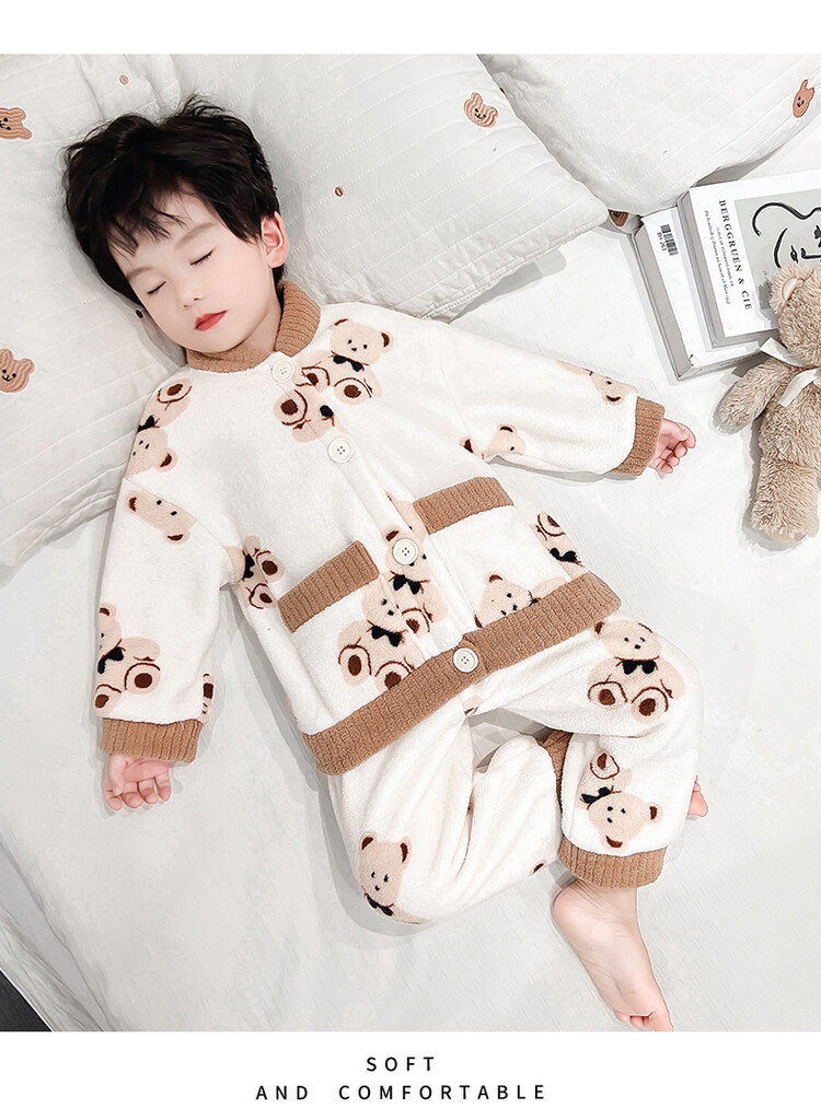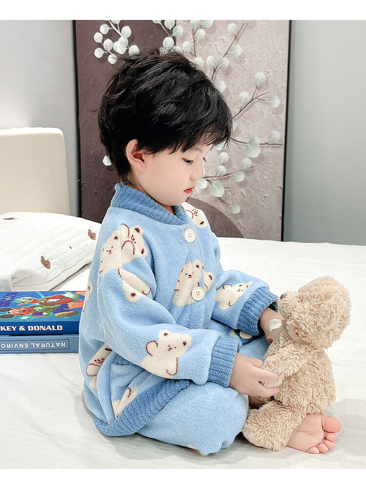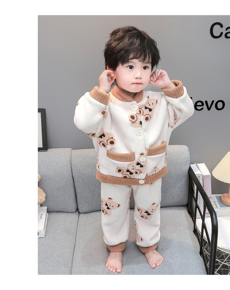 어린이 산호 양털 파자마 소년의 가을과 겨울 두꺼운 소년의 아기의 플란넬 홈 옷 만화 카디건 세트