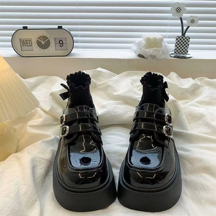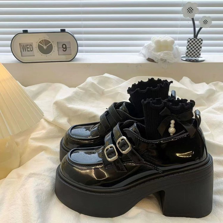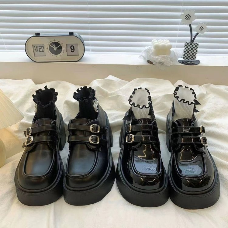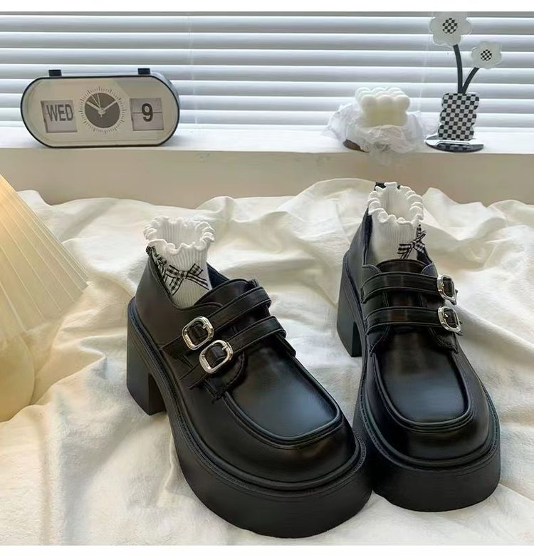 더블 버클 벨트 하이힐 두꺼운 힐 로퍼 여성 2024 가을 및 겨울 새로운 올 매치 영국 스타일 작은 가죽 신발스토어 가기