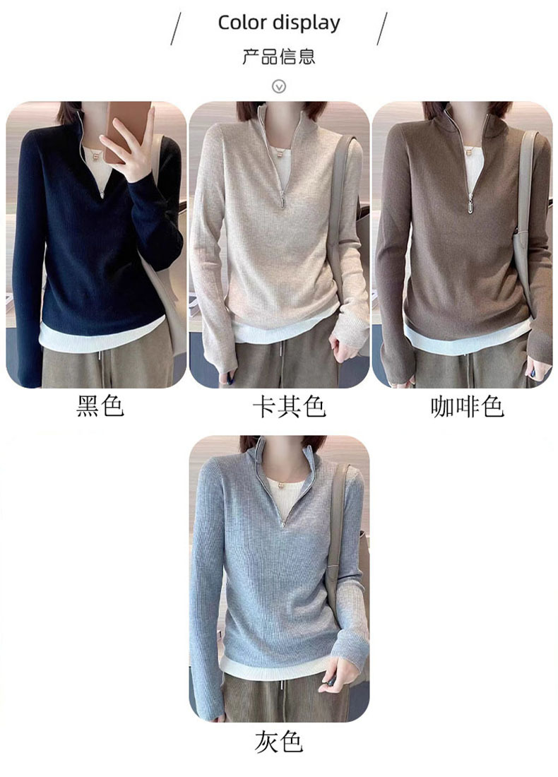 24 가을과 겨울 가짜 2 피스 스티칭 하프 지퍼 수직 칼라 모조 울 니트웨어 슬림 핏 풀오버 올 매치 긴팔 탑 여성스토어 가기