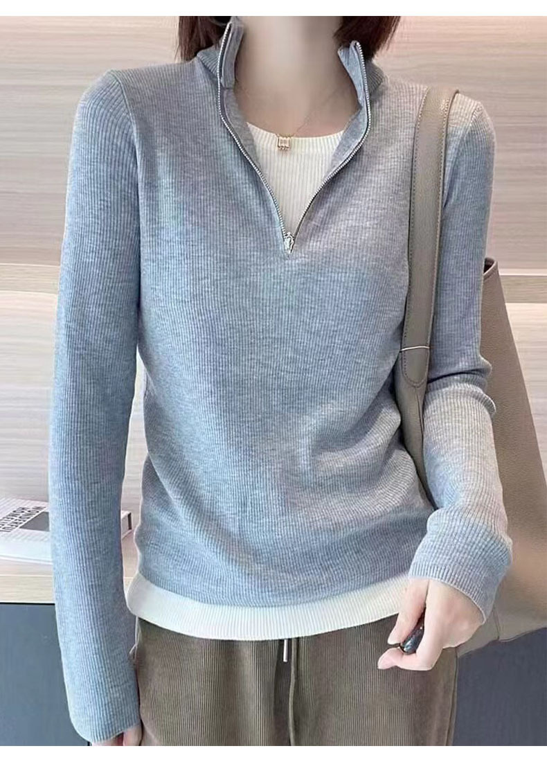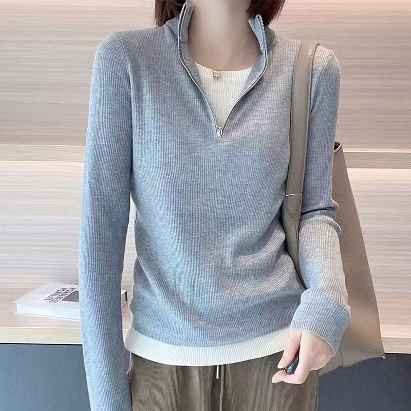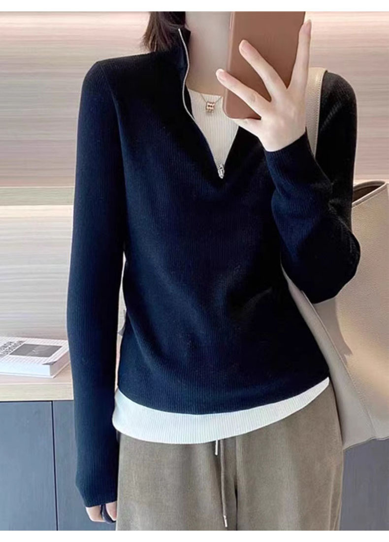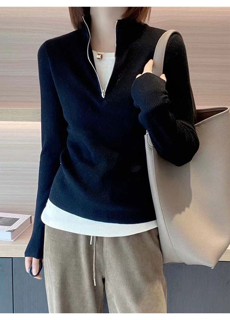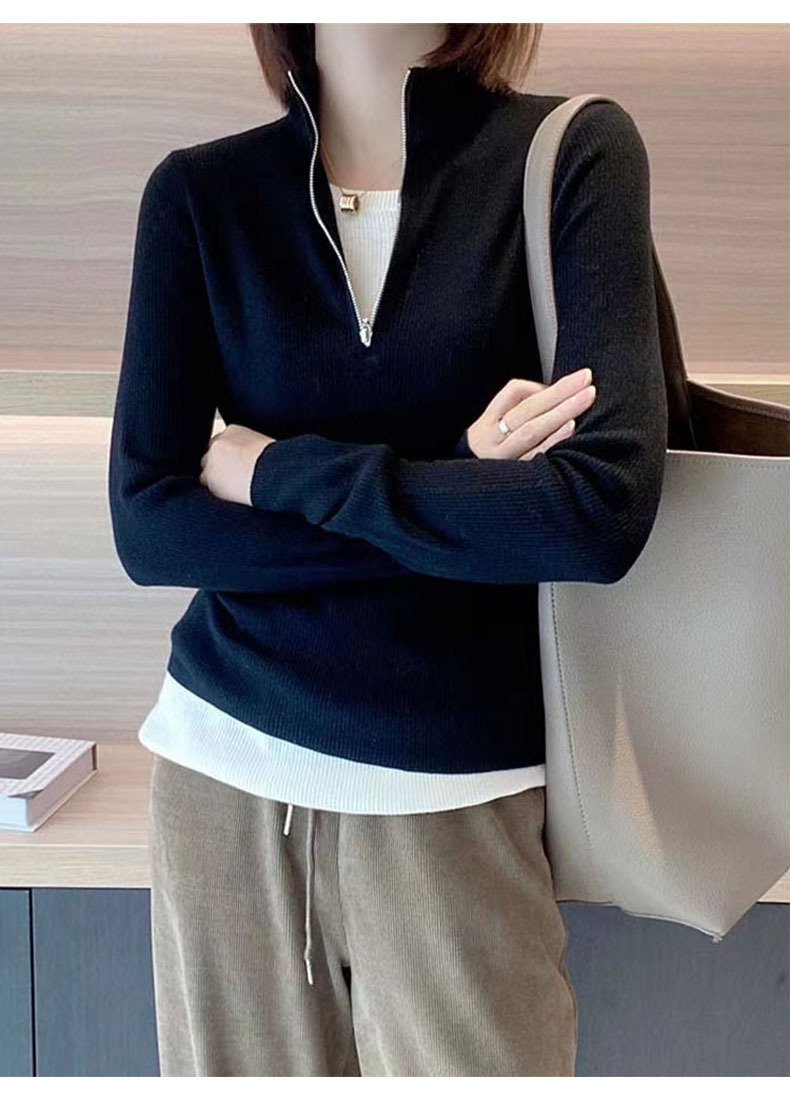 24 가을과 겨울 가짜 2 피스 스티칭 하프 지퍼 수직 칼라 모조 울 니트웨어 슬림 핏 풀오버 올 매치 긴팔 탑 여성