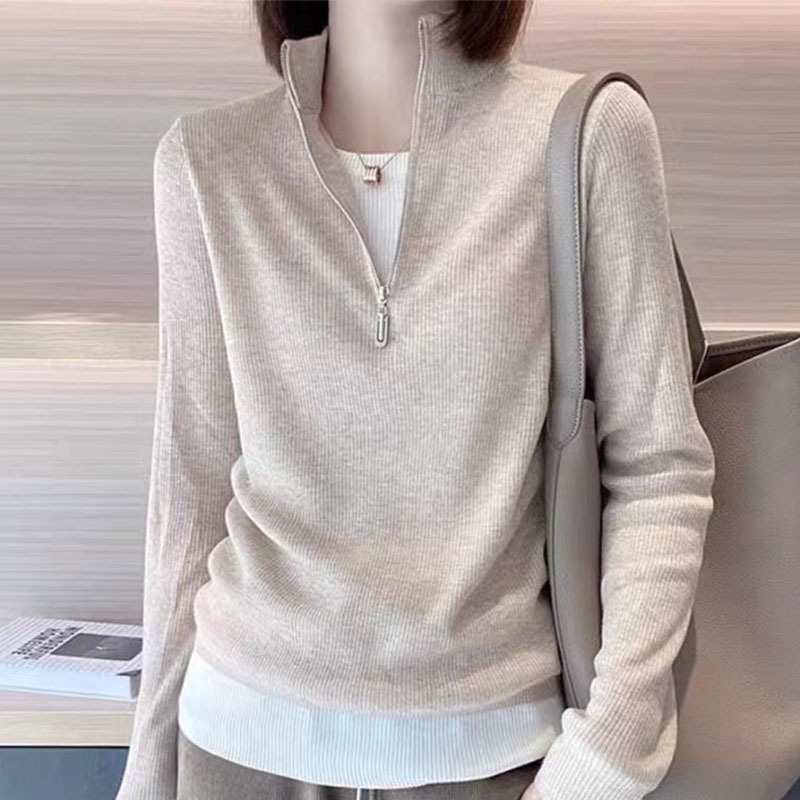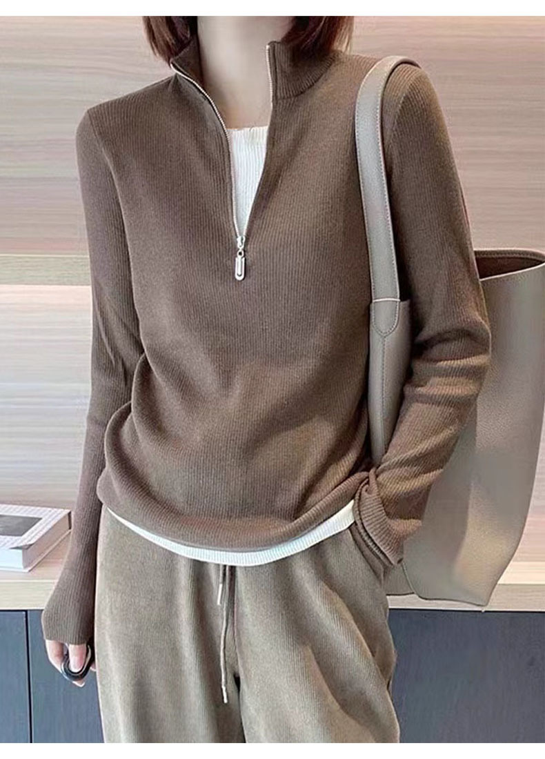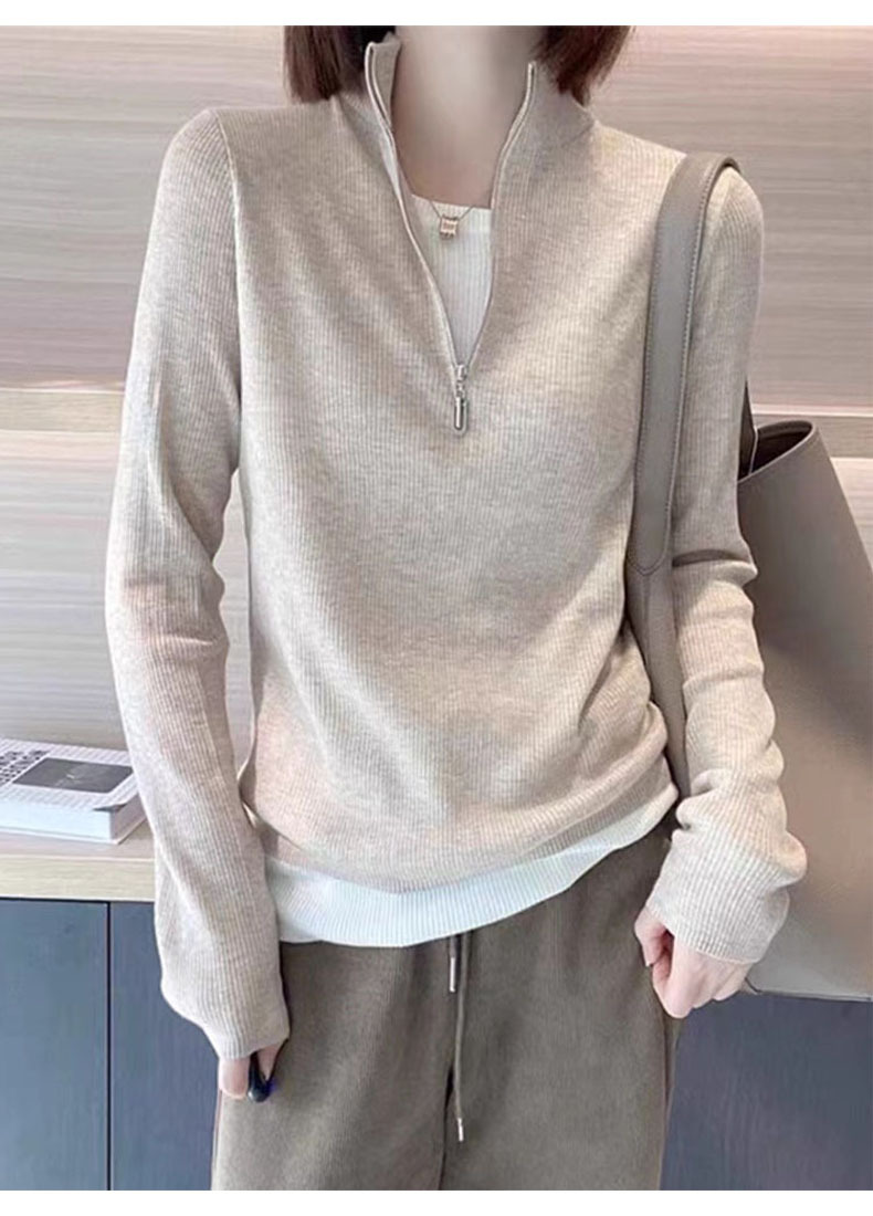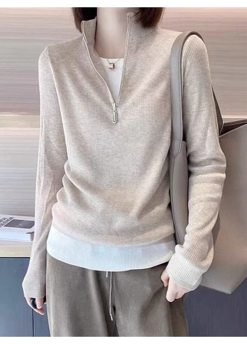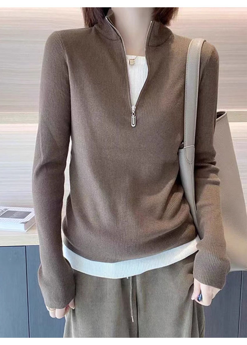24 가을과 겨울 가짜 2 피스 스티칭 하프 지퍼 수직 칼라 모조 울 니트웨어 슬림 핏 풀오버 올 매치 긴팔 탑 여성