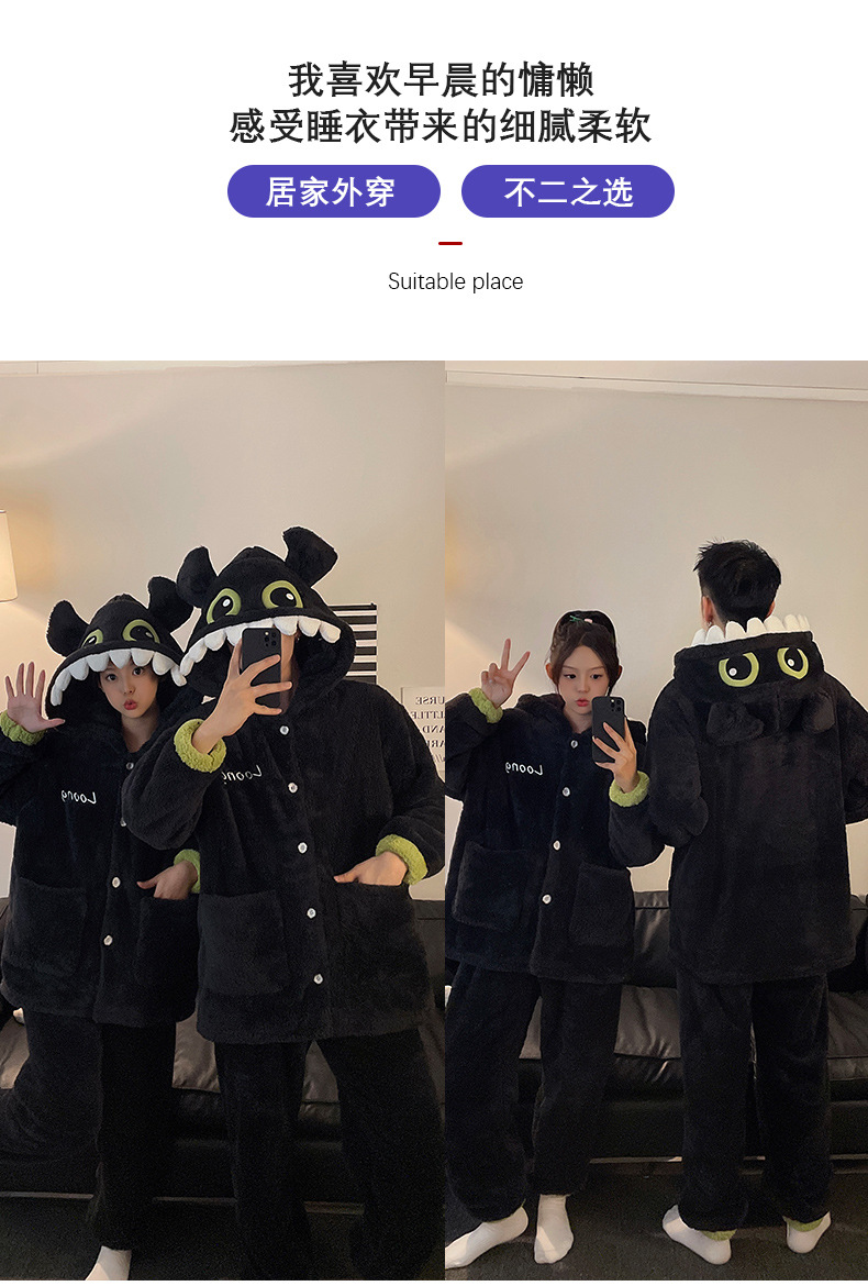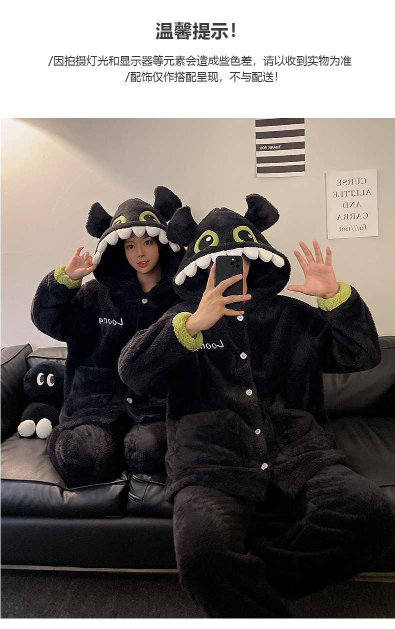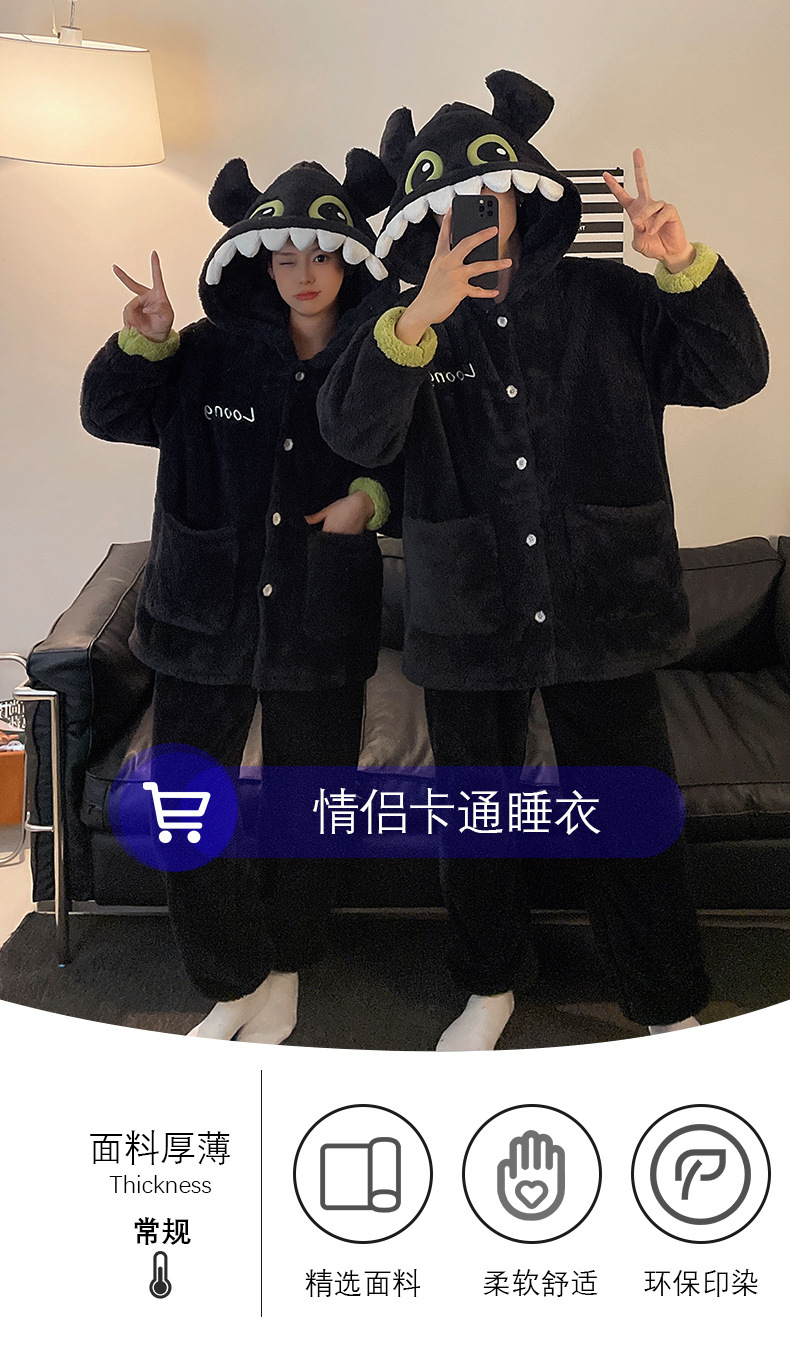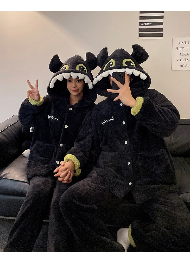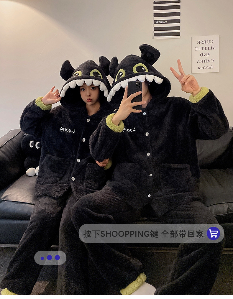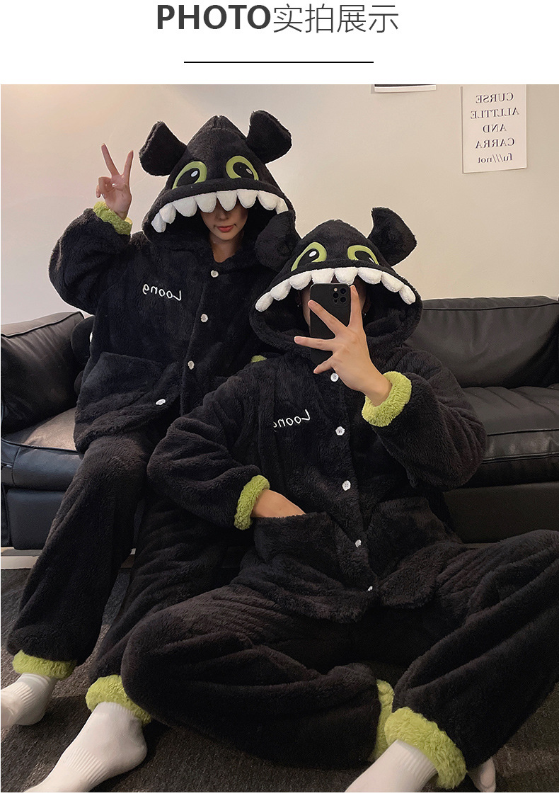 만화 작은 괴물 가을과 겨울 새로운 커플 산호 양털 잠옷 기모 두건드 여성 겉옷 홈 세트 남성스토어 가기