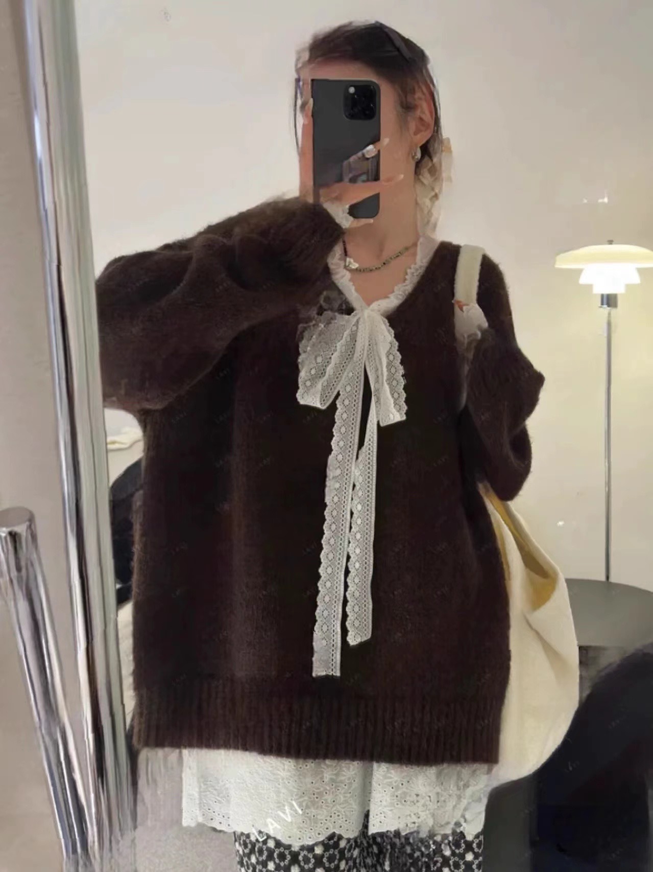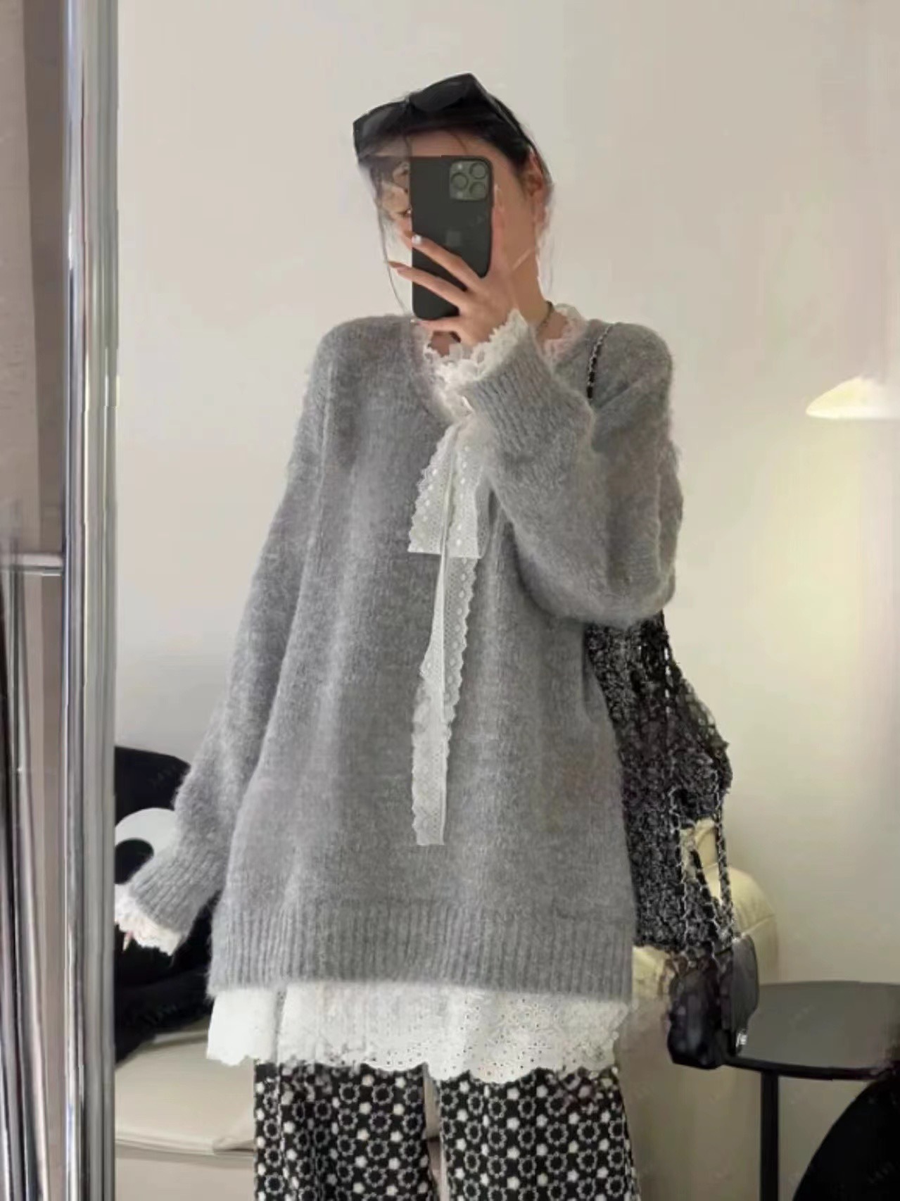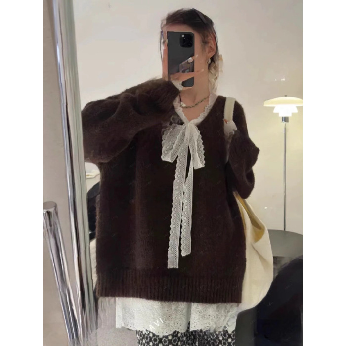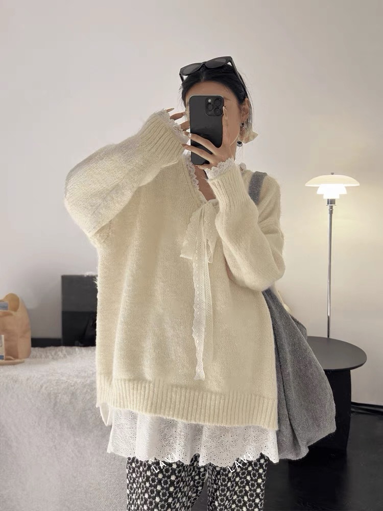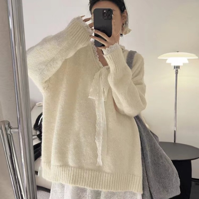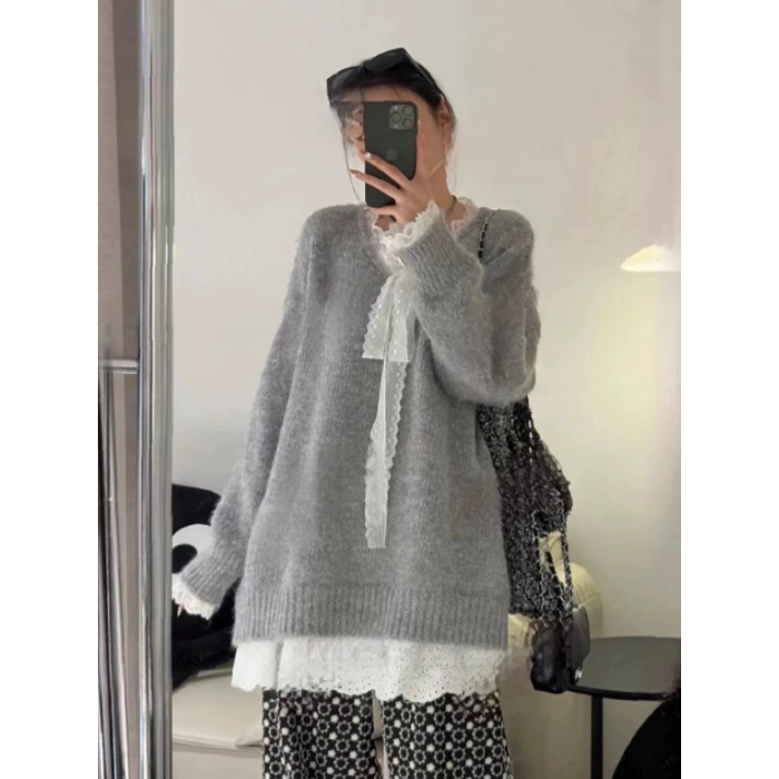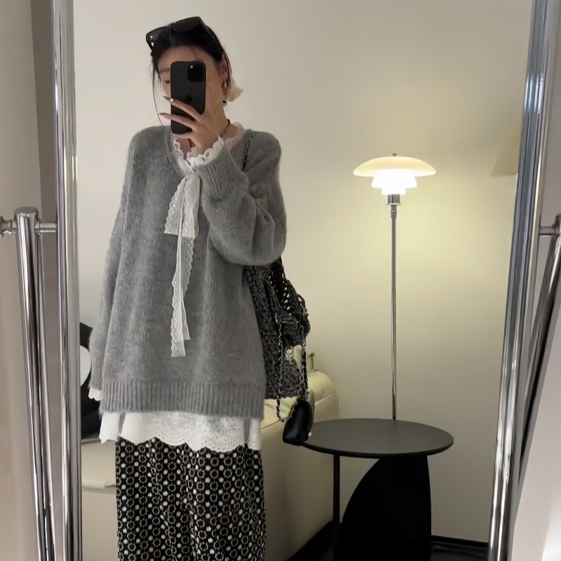 게으른 스타일 레이스 니트 스웨터 여성의 느슨한 올매치 톱 2024 가을 새로운 여성 의류 디자인 감각스토어 가기