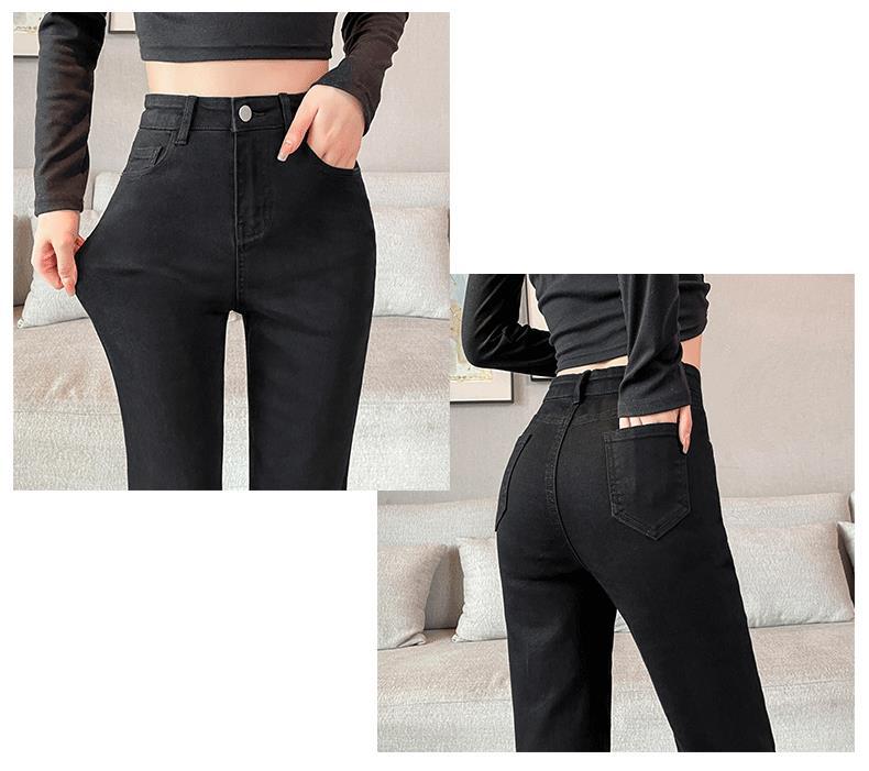 검은 높은 허리 기모 두꺼운 청바지 여성의 겨울 작은 좁은 직선 바지 가을 및 겨울 연기 튜브 바지스토어 가기