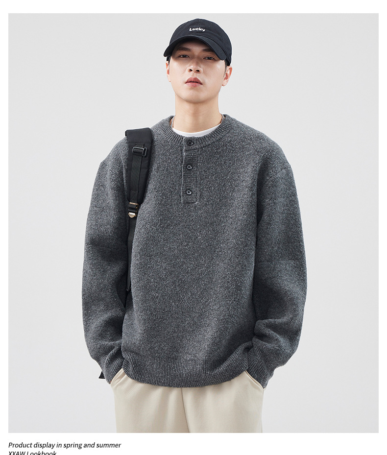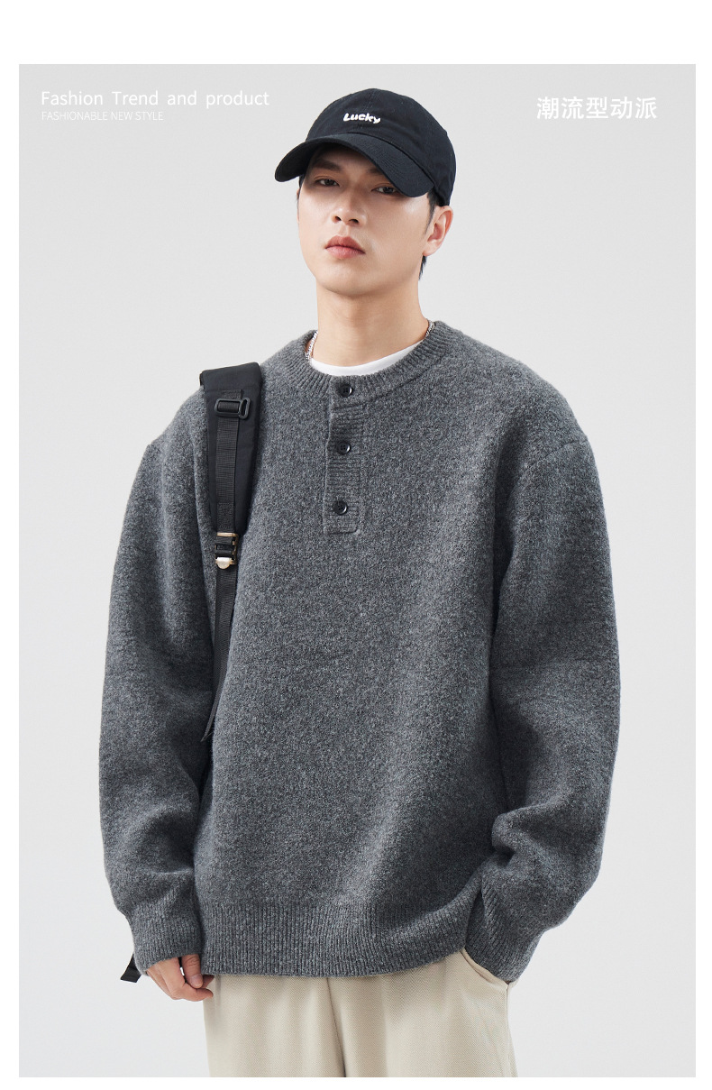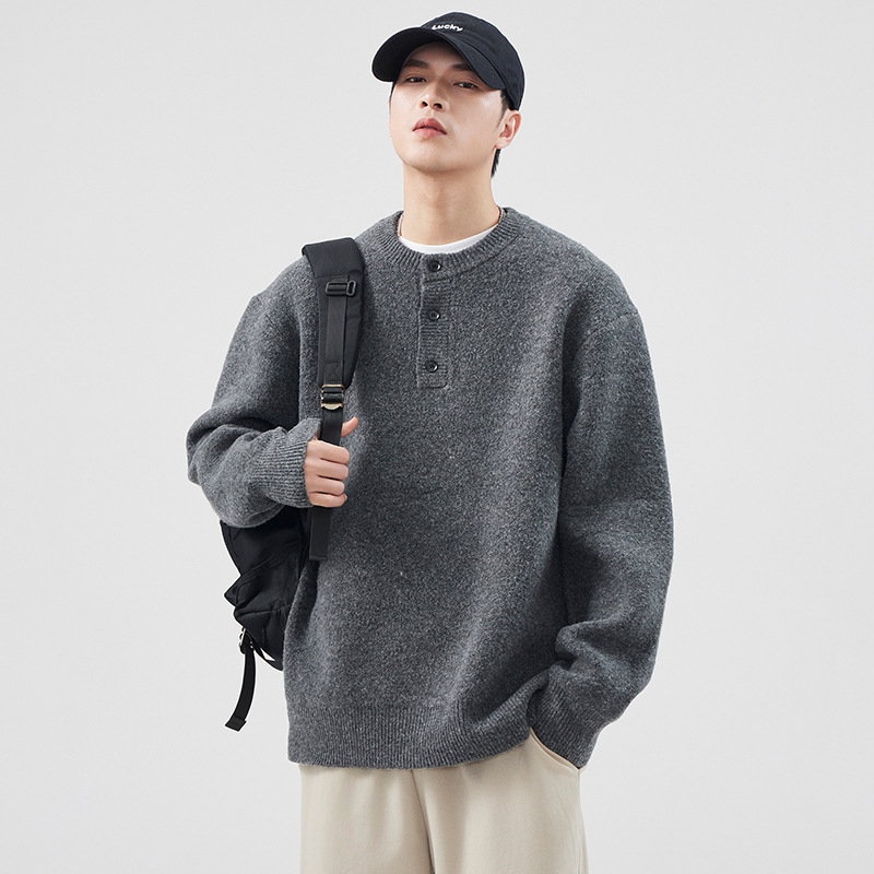헨리 칼라 스웨터 코트 남자의 2024 새로운 가을과 겨울 느슨한 따뜻한 게으른 스타일 단색 회색 스웨터