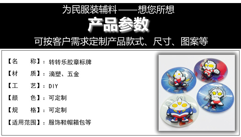 패션 선택 의류 액세서리 귀여운 Ultraman 턴 음악 컬러 인쇄 드롭 플라스틱 부드러운 고무 라운드 패션 회전 사인스토어 가기