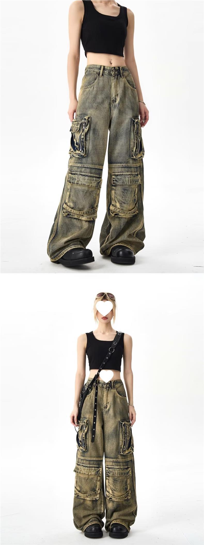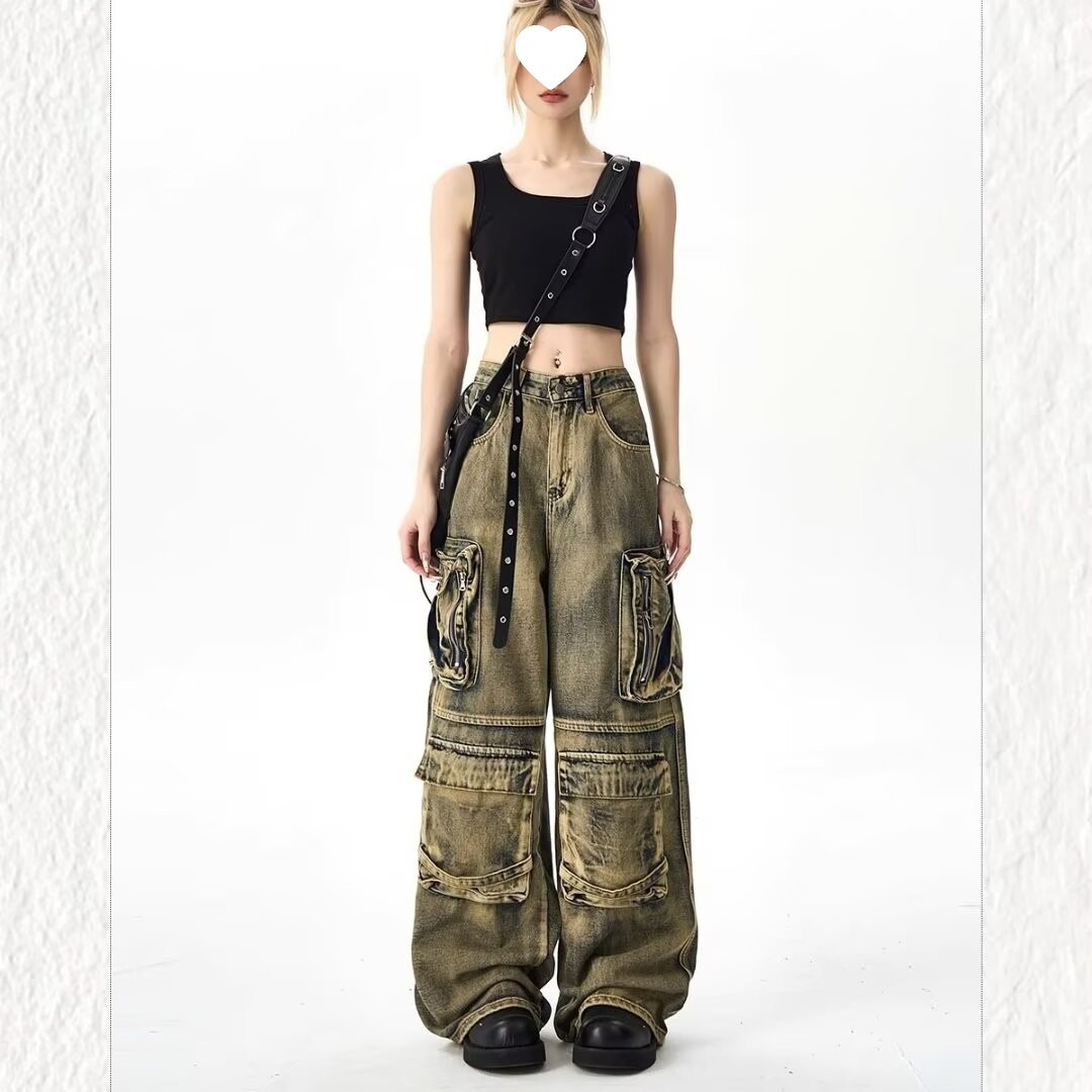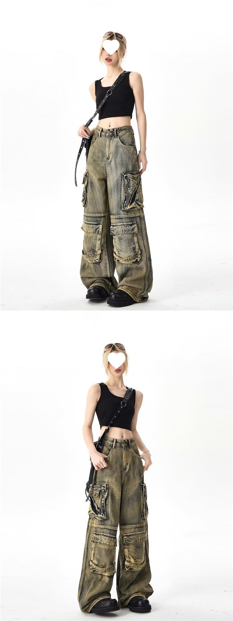 대외 무역 미국 스타일 빈티지 오래 된 대형 포켓 툴링 청바지 남성과 여성의 느슨한 스트레이트 와이드 다리 바지