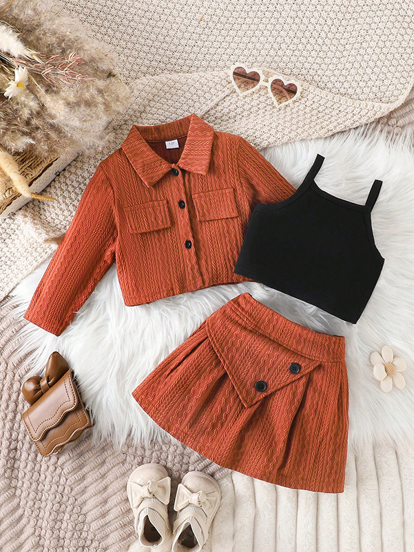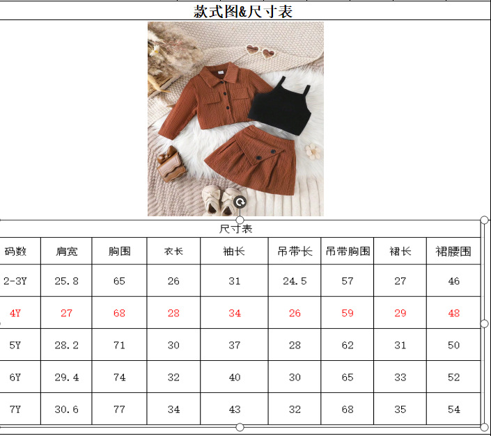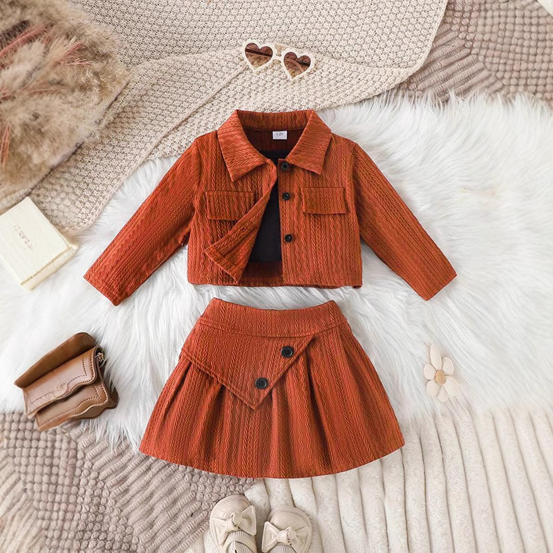 2024 가을과 겨울 소녀 긴 소매 니트 코트 캐미솔 장식 포켓 스커트를위한 국경 간 아동복 유럽과 미국 세트스토어 가기