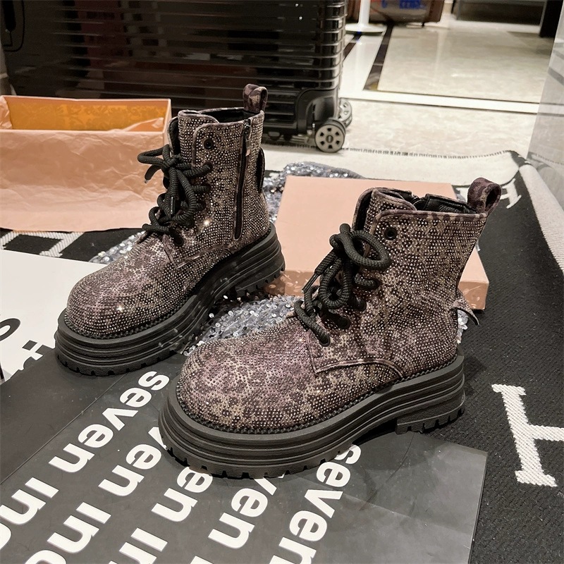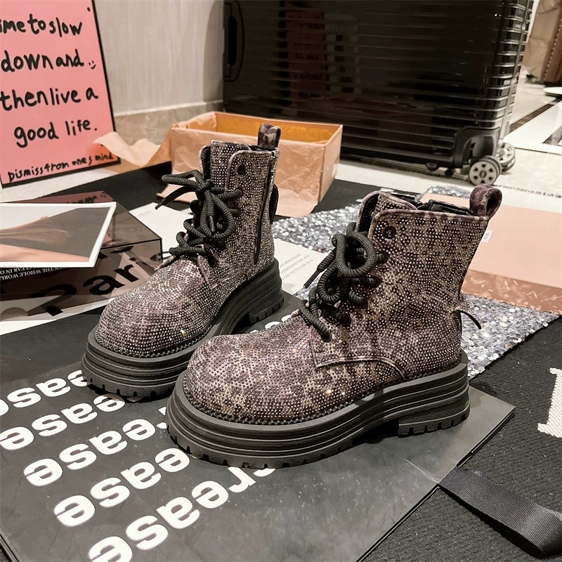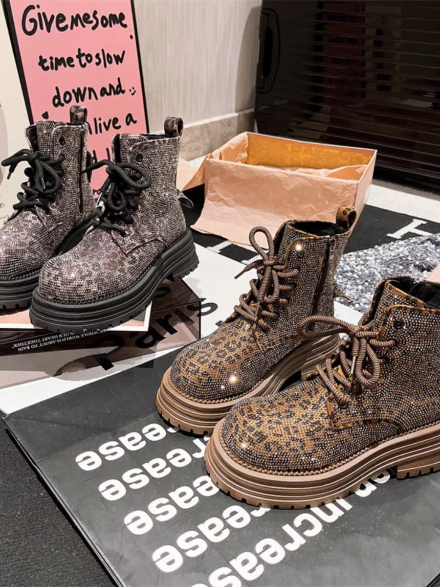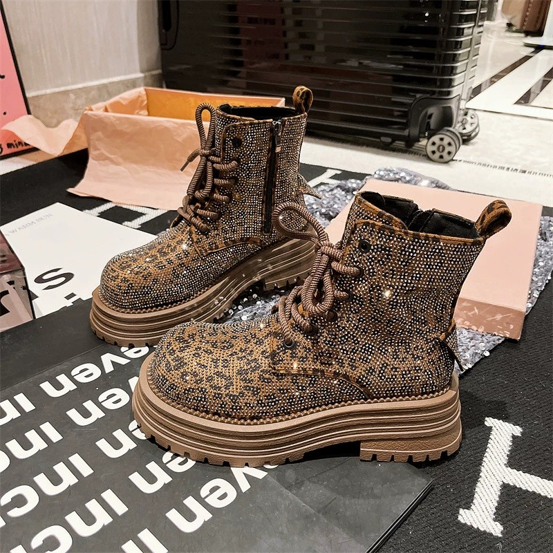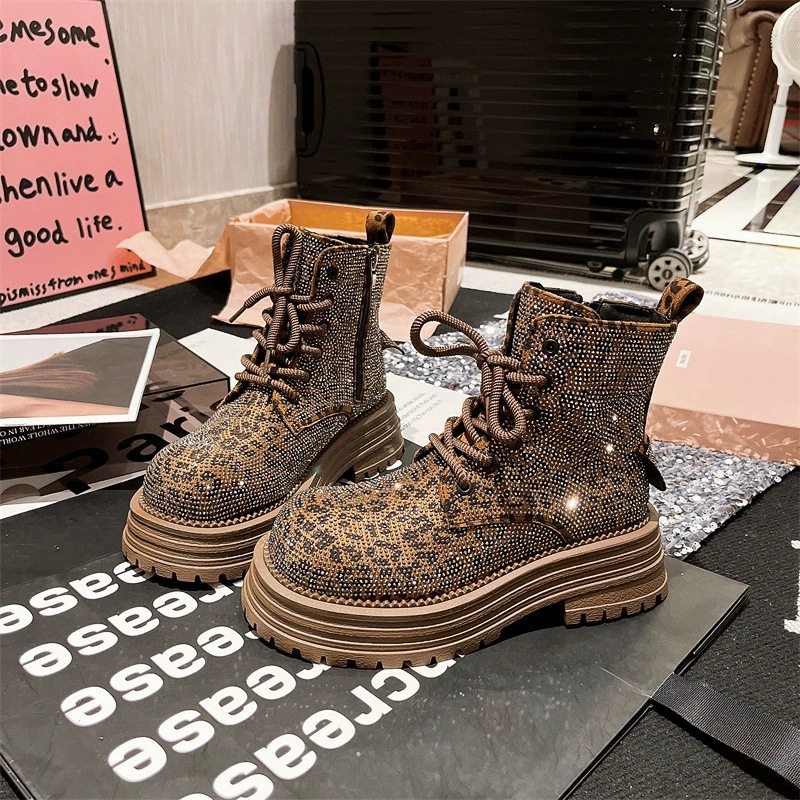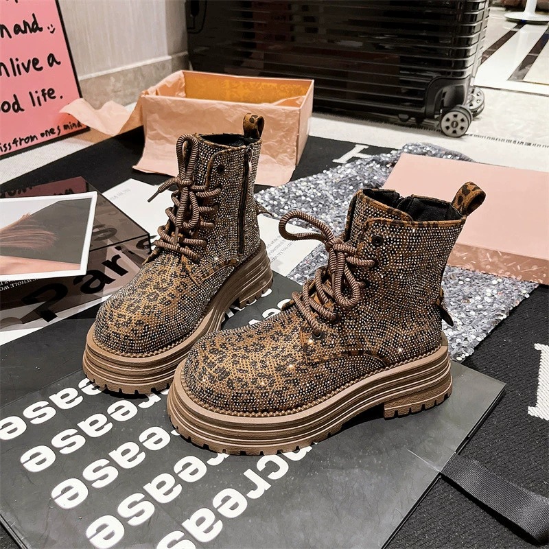 라인스톤 마틴 부츠 여성 2024 뉴 레오파드 무늬 풀 다이아몬드 럭셔리 레이스 업 쇼트 부츠 라운드 발가락 두꺼운 하단 플랫폼 모토 부츠 여성