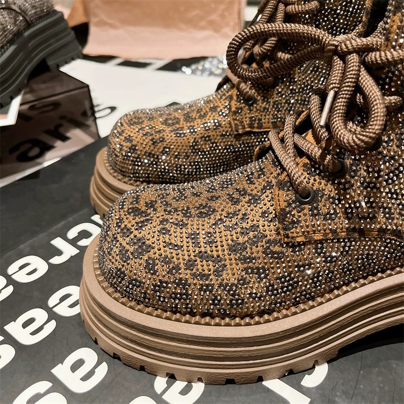 라인스톤 마틴 부츠 여성 2024 뉴 레오파드 무늬 풀 다이아몬드 럭셔리 레이스 업 쇼트 부츠 라운드 발가락 두꺼운 하단 플랫폼 모토 부츠 여성스토어 가기