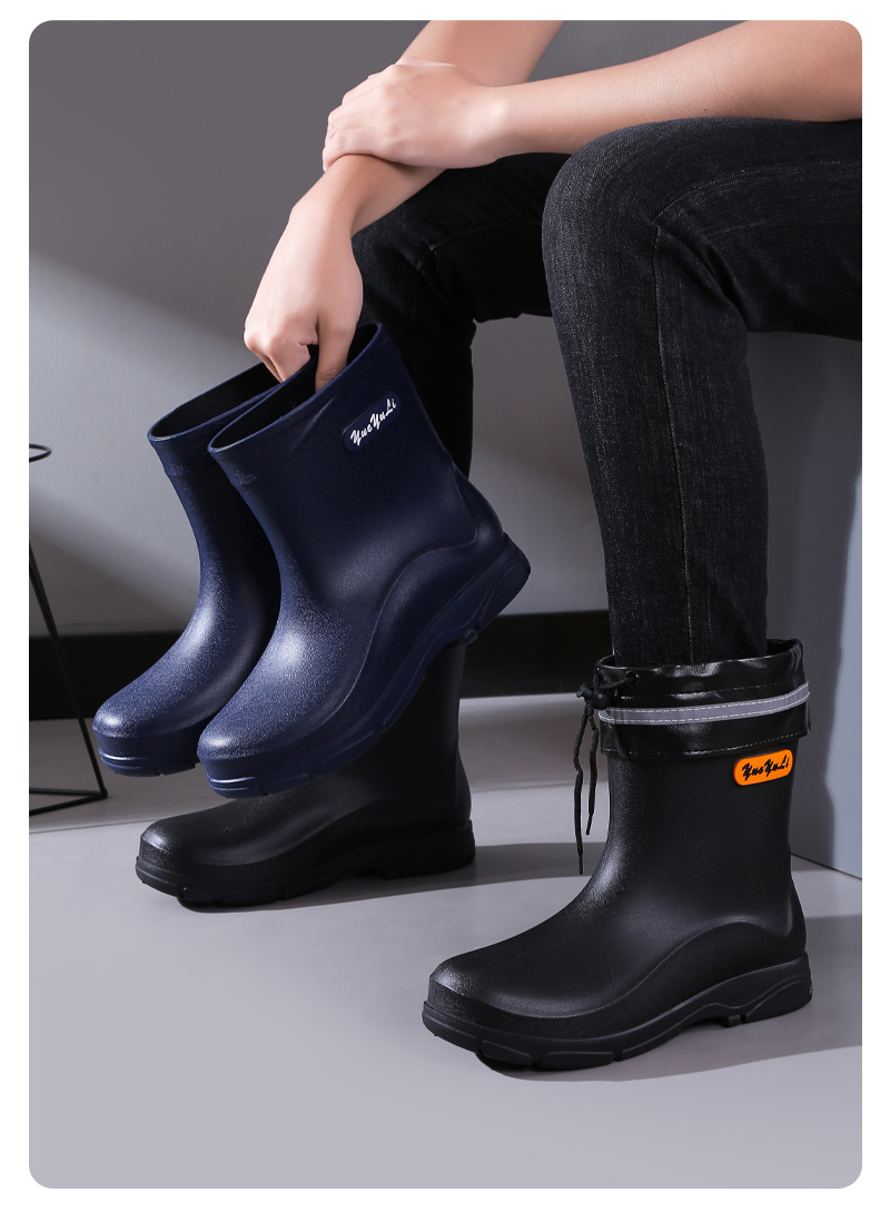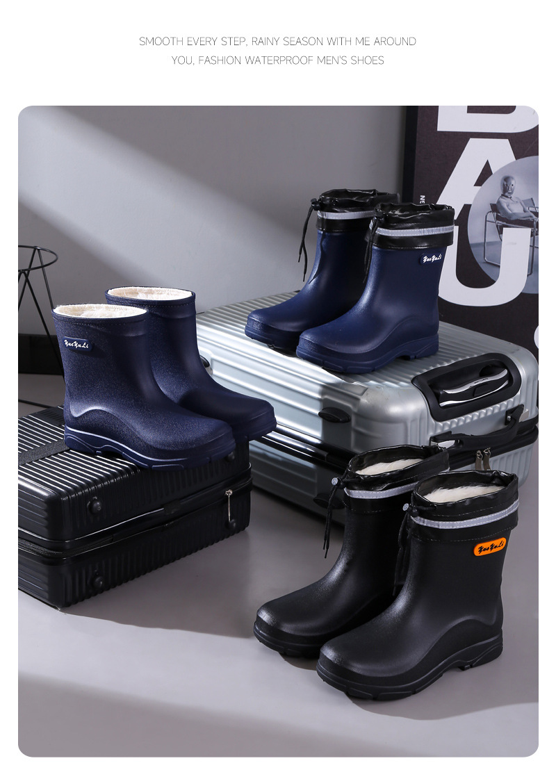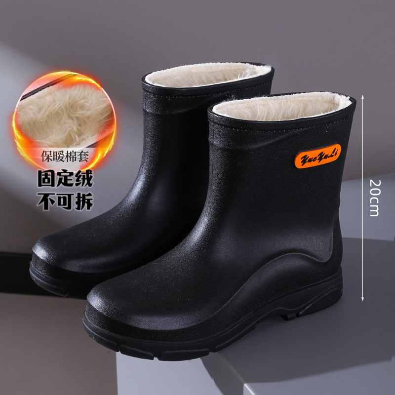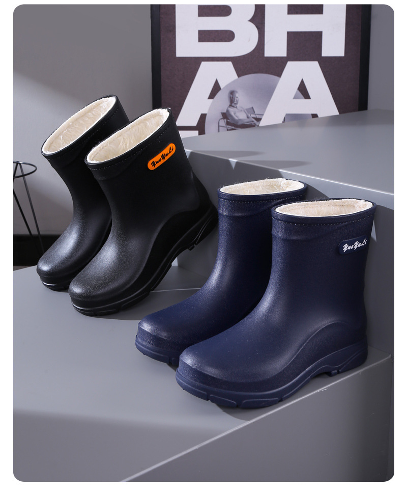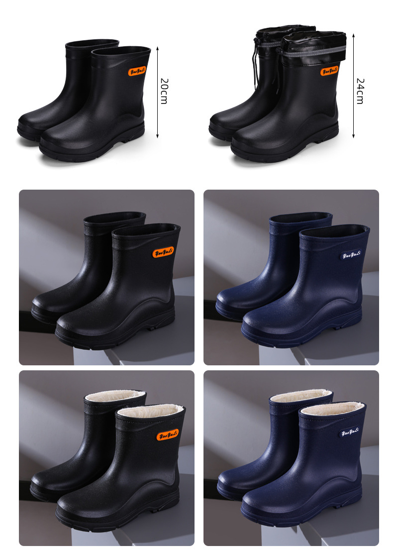 2024 새로운 기모 검은 패션 물 신발 도매 남성 방수 미끄럼 방지 세차 낚시 짧은 튜브 PVC 장화스토어 가기
