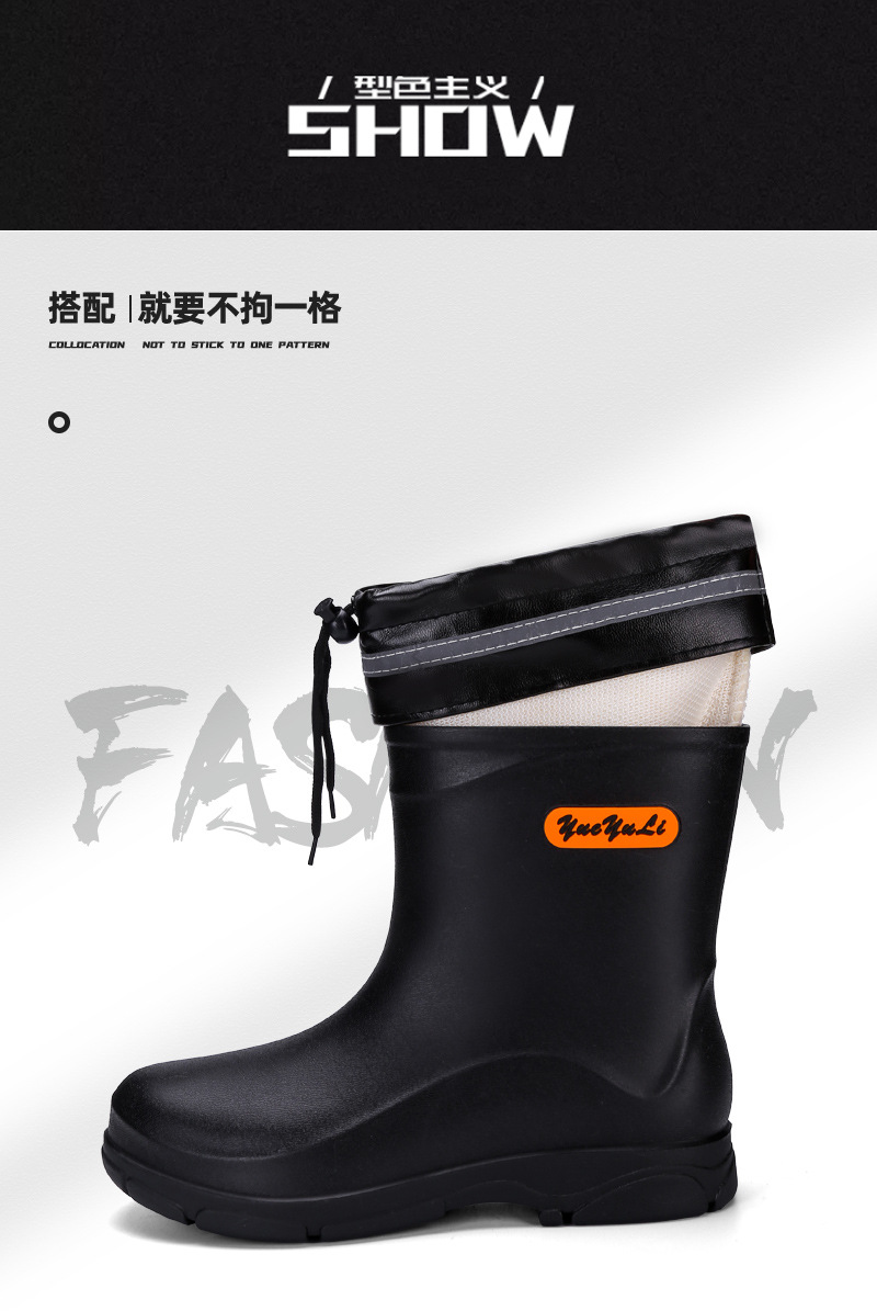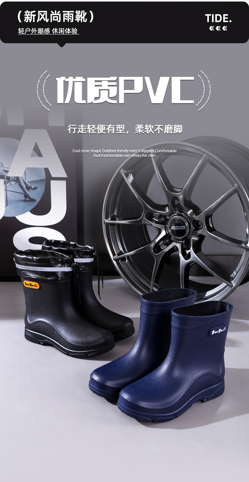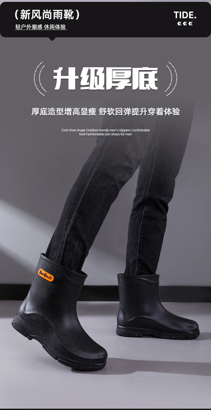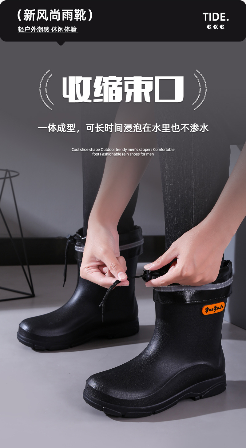 2024 새로운 기모 검은 패션 물 신발 도매 남성 방수 미끄럼 방지 세차 낚시 짧은 튜브 PVC 장화스토어 가기