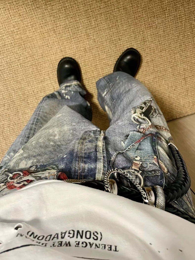 돈 은퇴 24SS AC 스타일 3D 글꼴 느슨한 캐주얼 스트레이트 다리 바지 데님 인쇄 된 물 세척 바지 잉크젯 남성