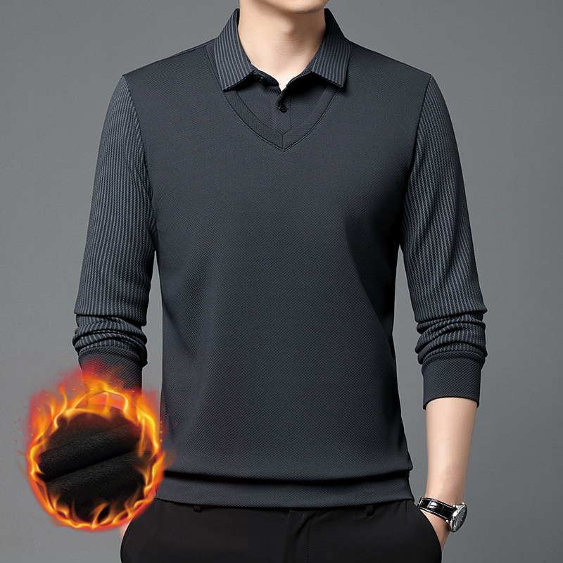 중년 및 노인 가을 및 겨울 가짜 투피스 스트라이프 셔츠 스티칭 기모 V 넥 기모 니트 스웨터베이스 아빠 스웨터