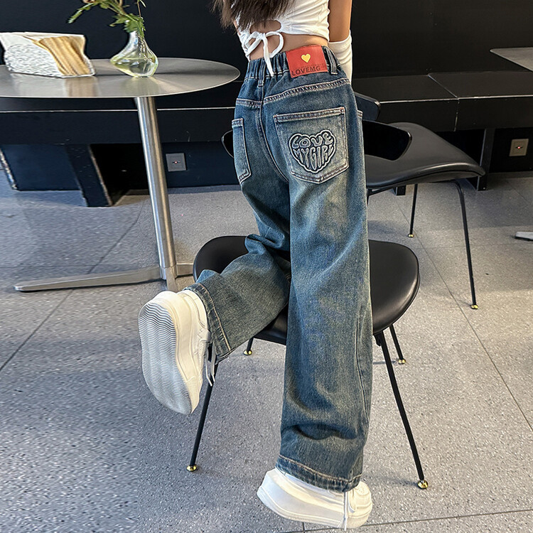 소녀 가을 청바지 2024 새로운 세련된 소녀 봄과 가을 유행 직선 바지 어린이 넓은 다리 바지스토어 가기