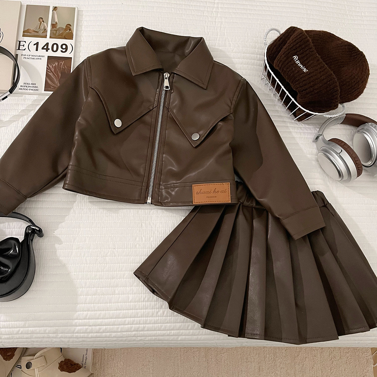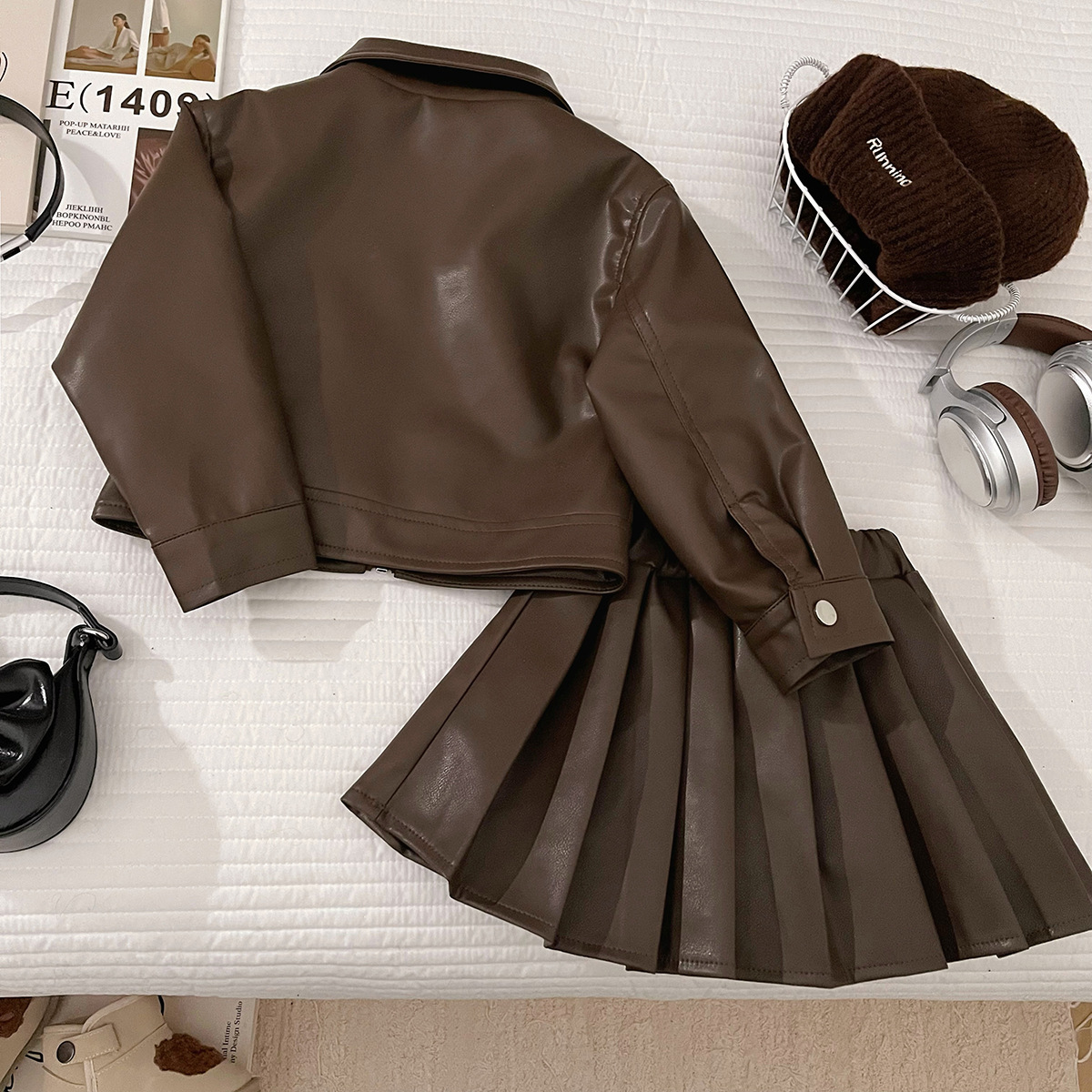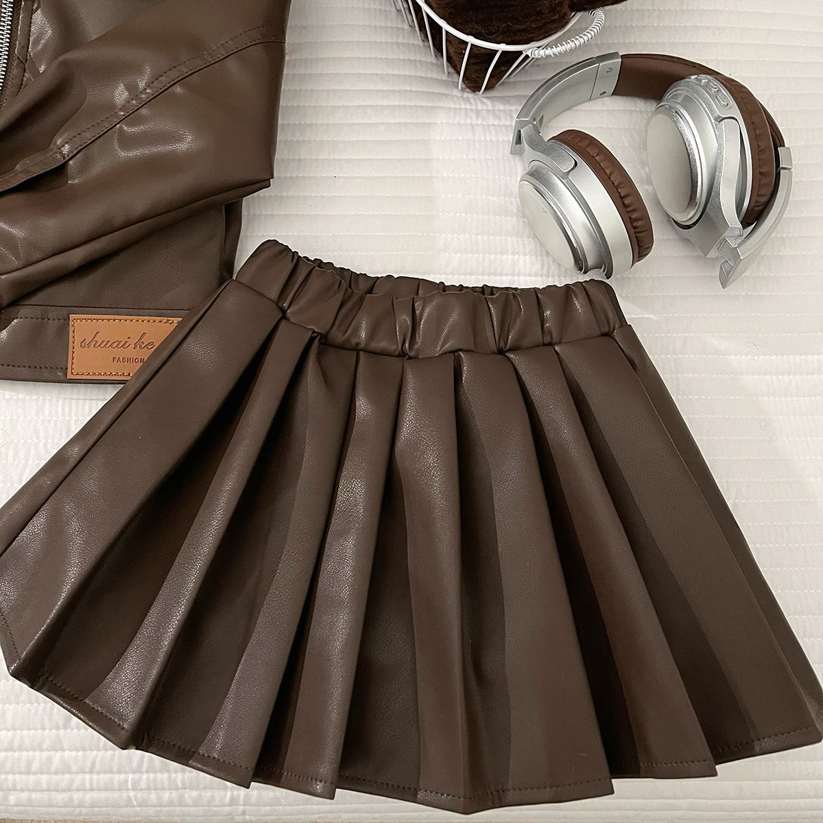 소녀의 가을 PU 가죽 세트 소녀의 한국 스타일 유행 베어러 옷 어린이 가죽 재킷 주름 치마 투피스 세트