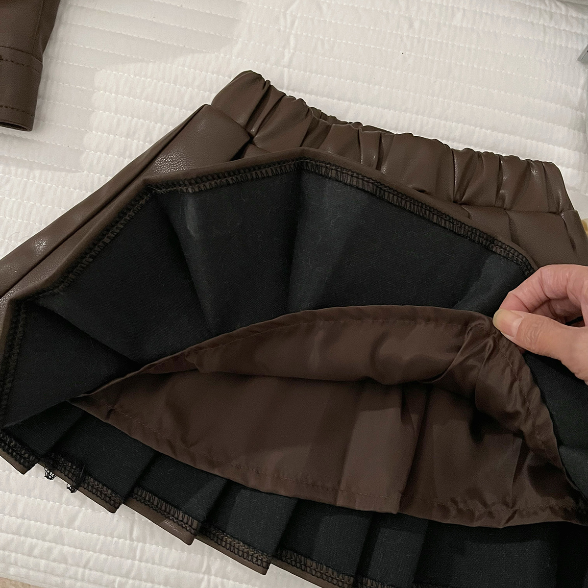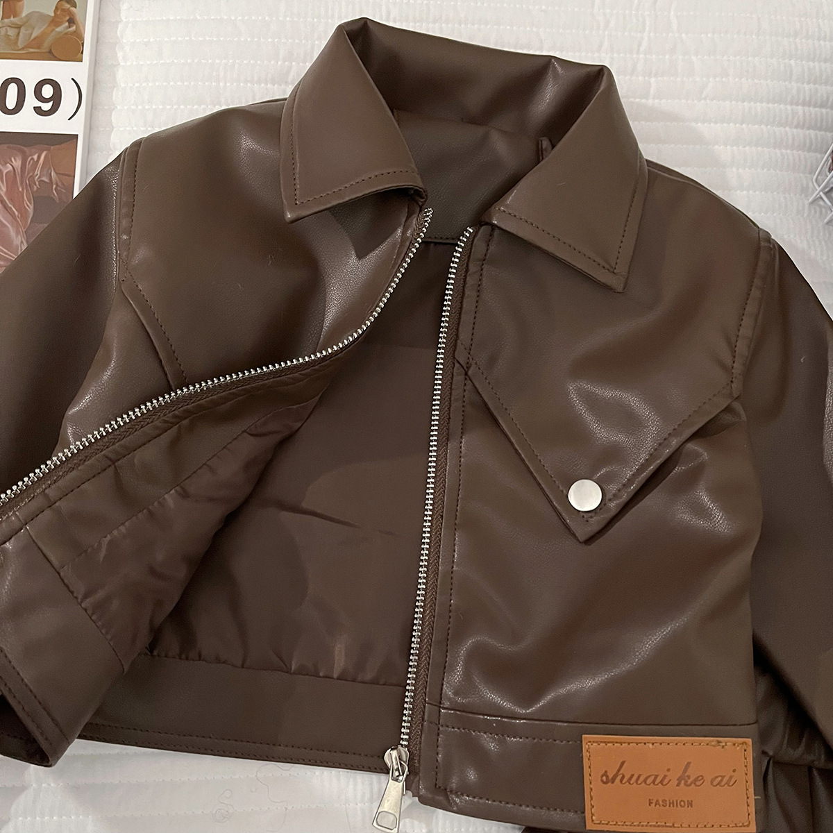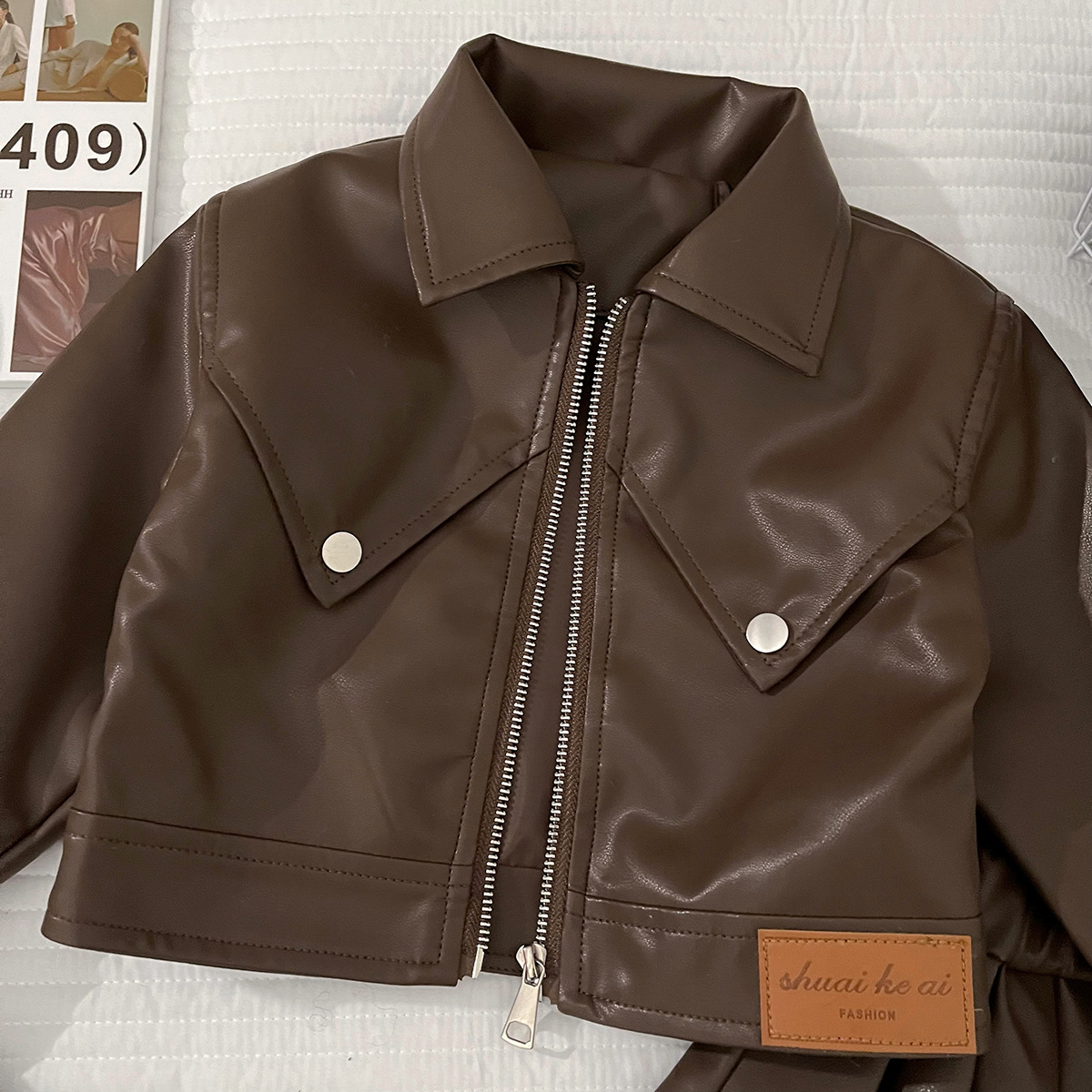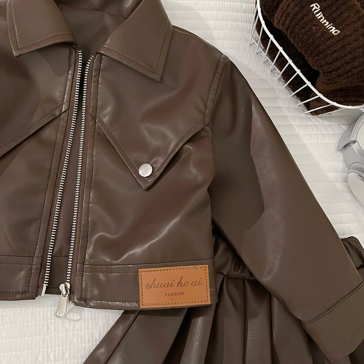 소녀의 가을 PU 가죽 세트 소녀의 한국 스타일 유행 베어러 옷 어린이 가죽 재킷 주름 치마 투피스 세트스토어 가기
