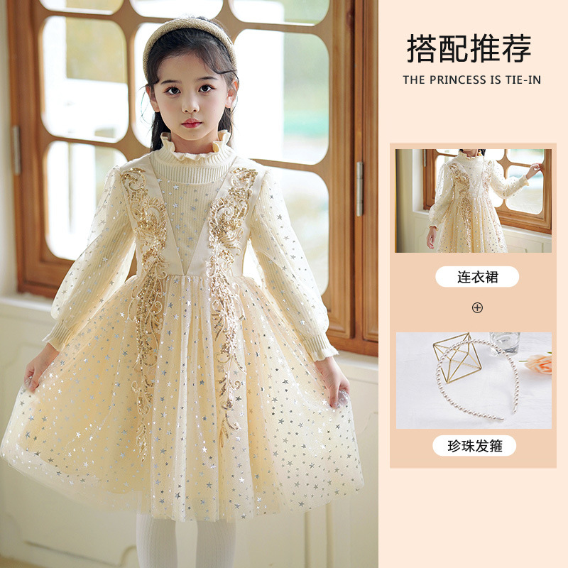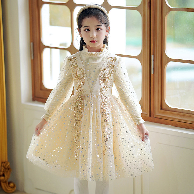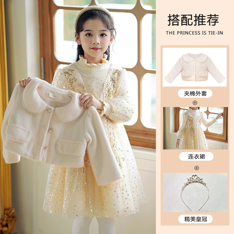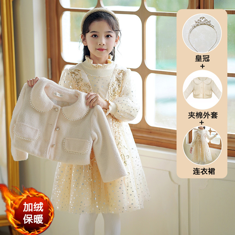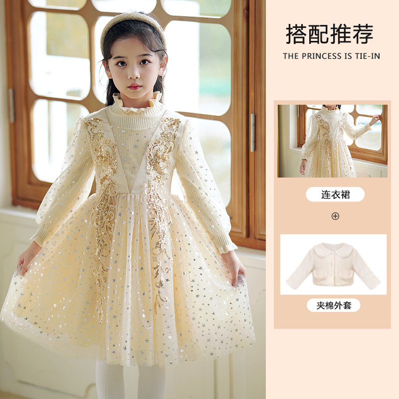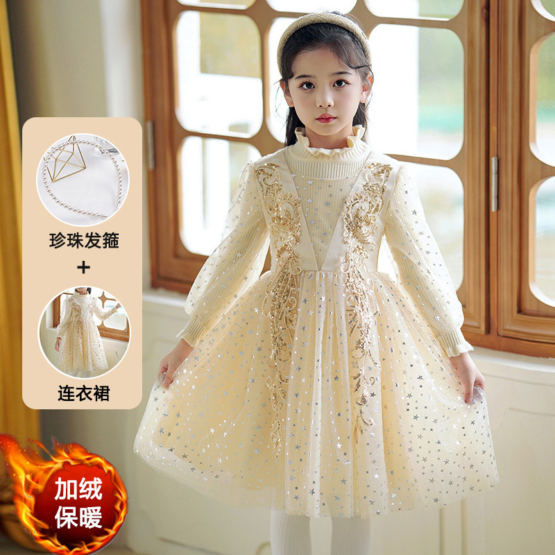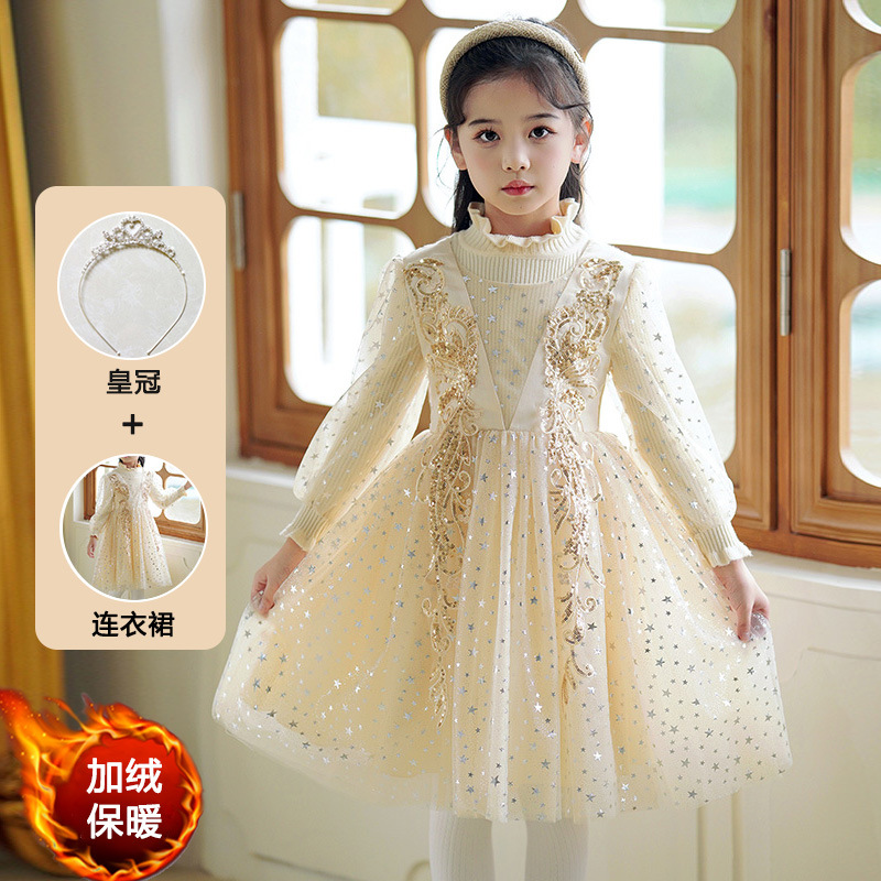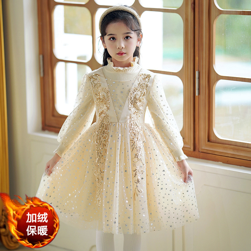 여자 공주 치마 2024 새로운 가을과 겨울 기모 울 긴 소매 스타일 생일 푹신한 베일 스커트 어린이 원피스스토어 가기