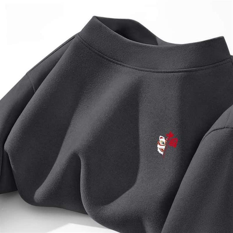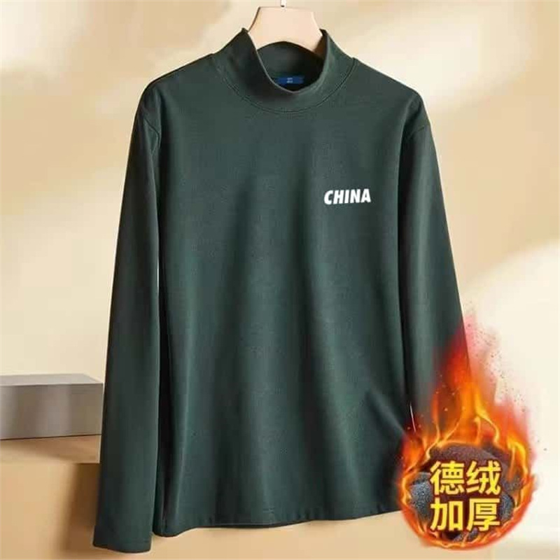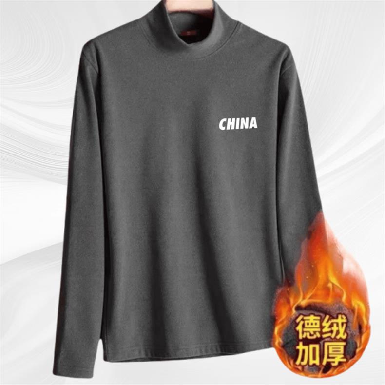 가을과 겨울 티셔츠 남성용 기모 겉옷 세미 하이 칼라 긴팔 티셔츠 내복 중년베이스 셔츠 독일 벨벳 따뜻한 셔츠 인쇄