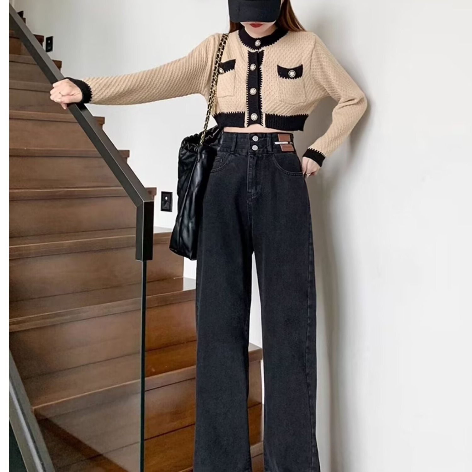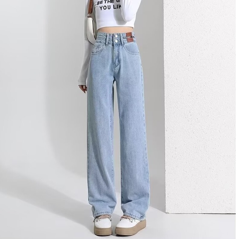 높은 허리 넓은 다리 좁은 청바지 여성의 2024 년 봄과 가을 스트레이트 느슨한 배 모양의 레트로 키 큰 바지스토어 가기