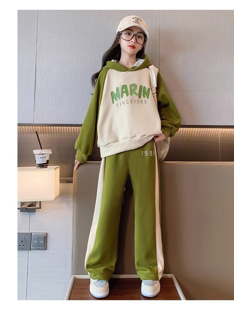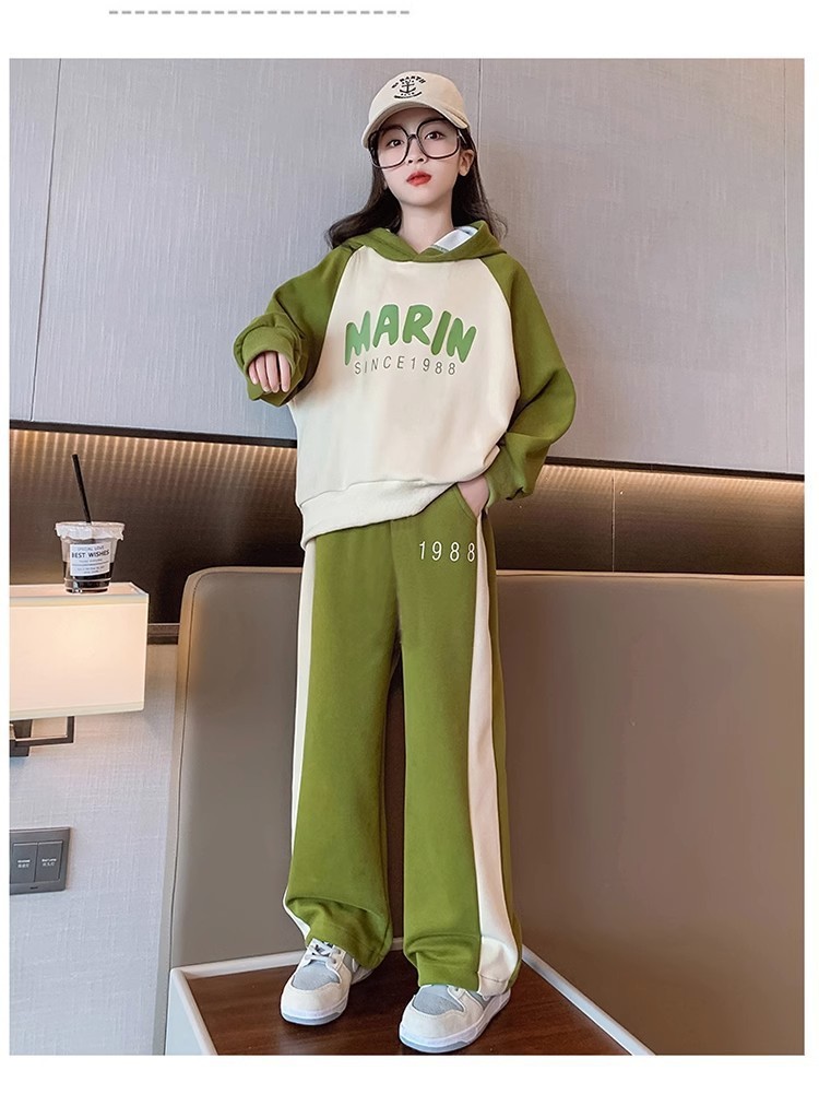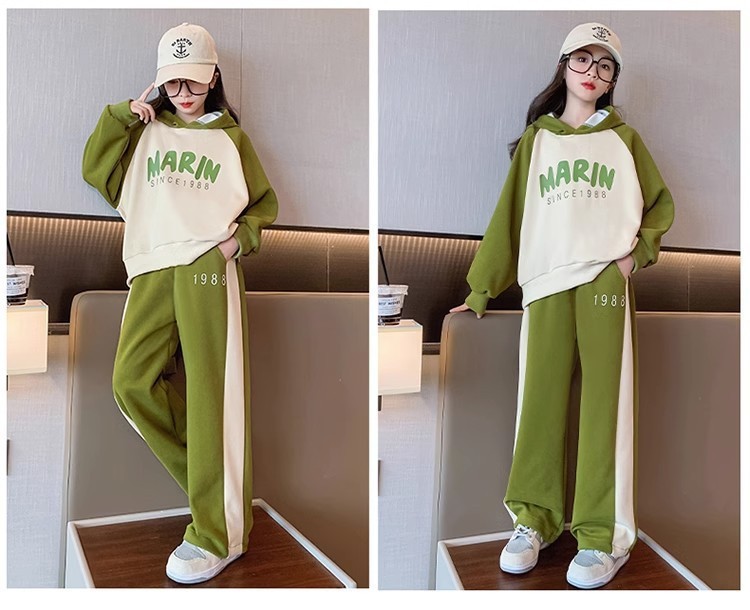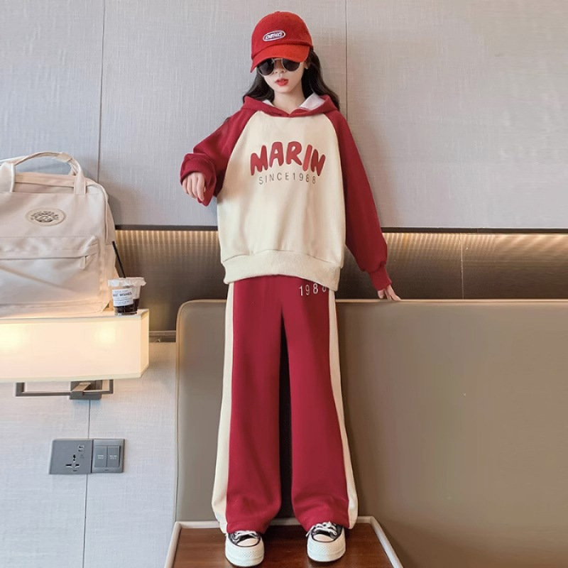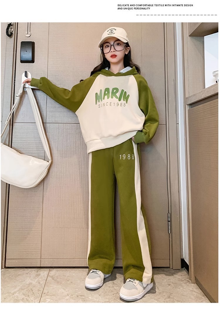 어린이 의류 소녀 캐주얼 세트 봄과 가을 2024 새로운 긴팔 후드 스트레이트 바지 투피스 세트