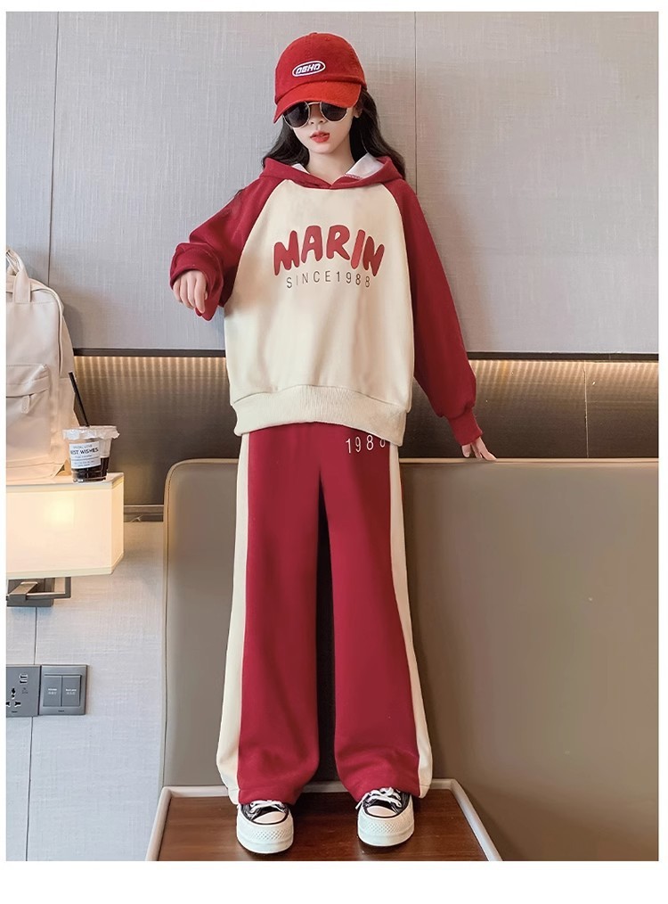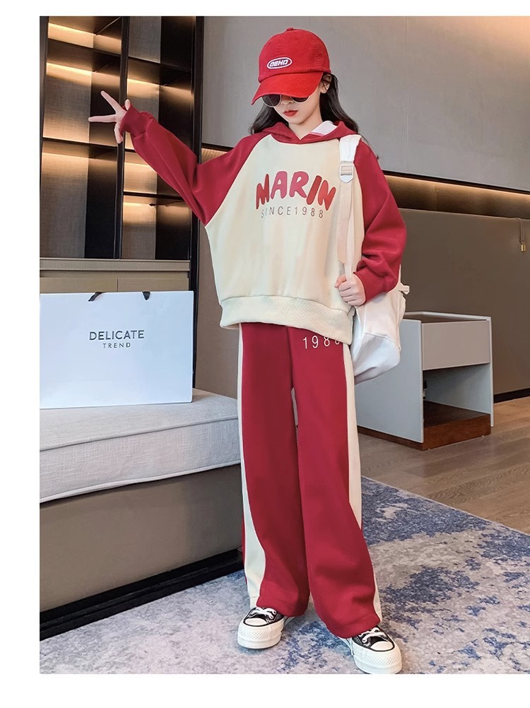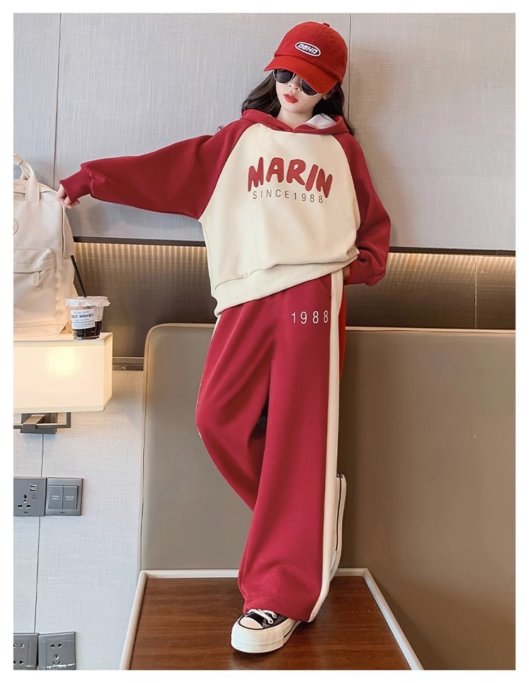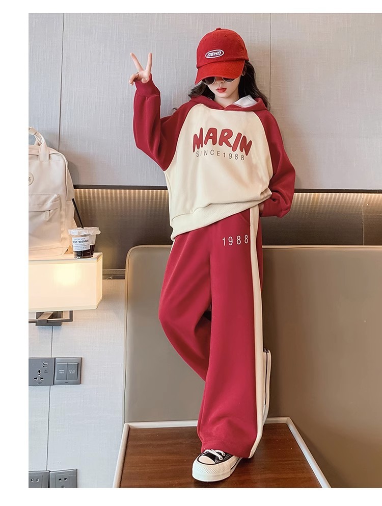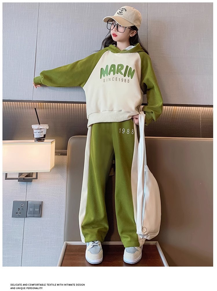어린이 의류 소녀 캐주얼 세트 봄과 가을 2024 새로운 긴팔 후드 스트레이트 바지 투피스 세트