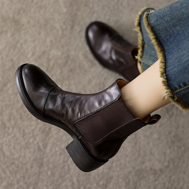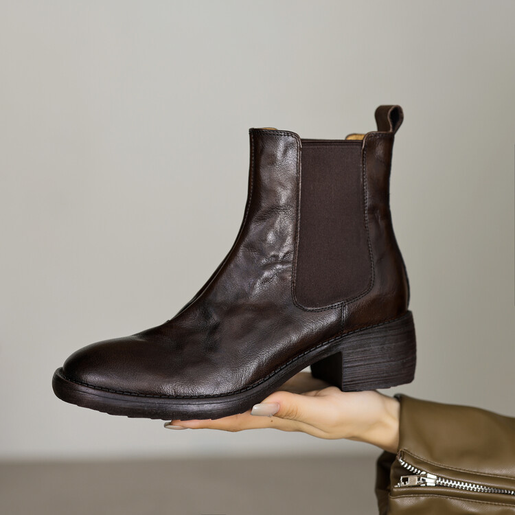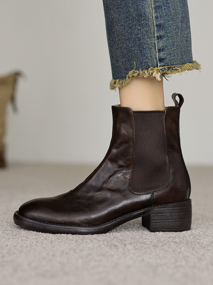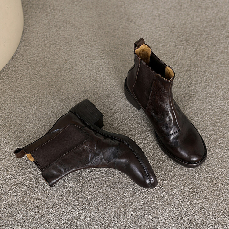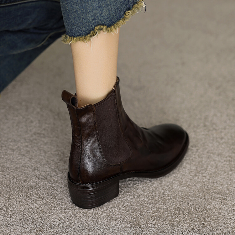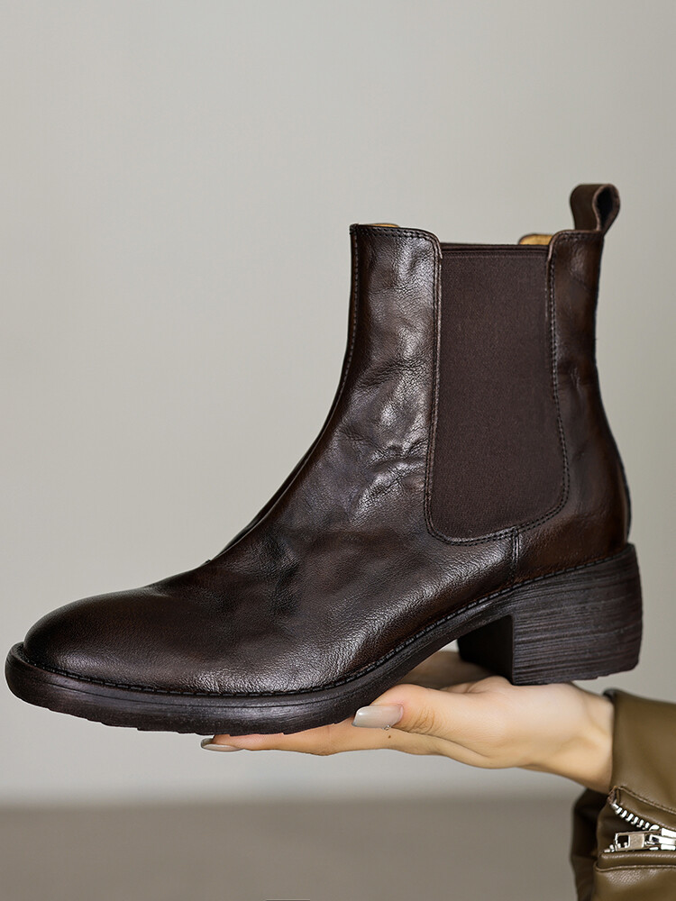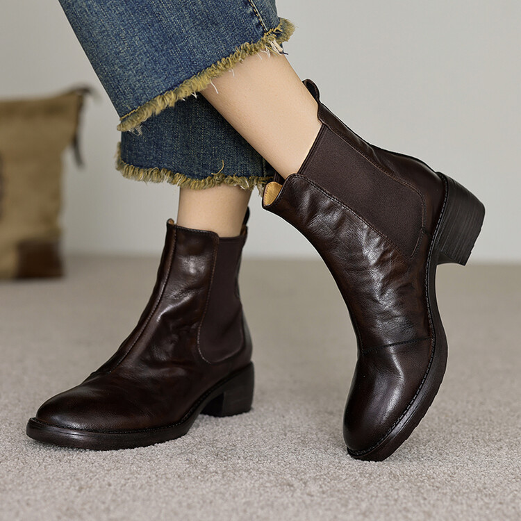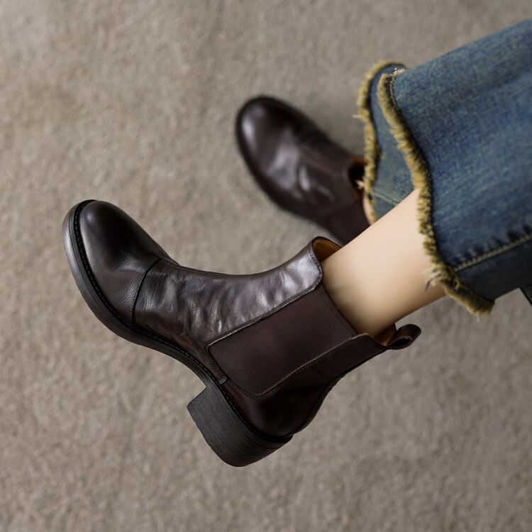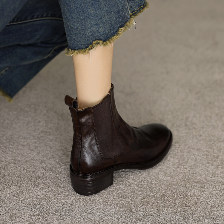 빈티지 카우보이 영국 스타일 라운드 헤드 첼시 부츠 여자 가을 겨울 다크 브라운 청키 힐 마틴 부츠 봄과 가을 싱글 부츠