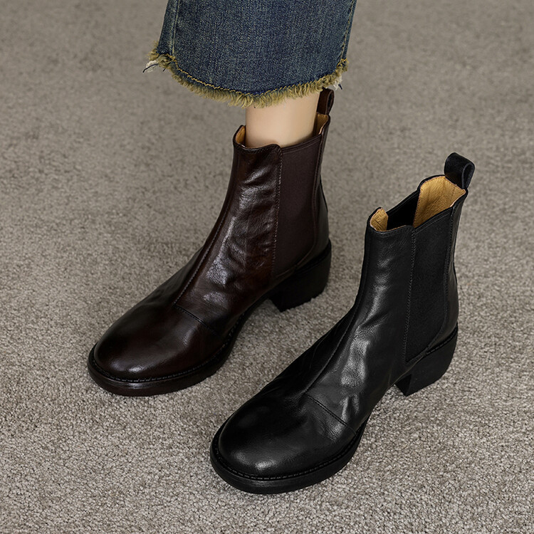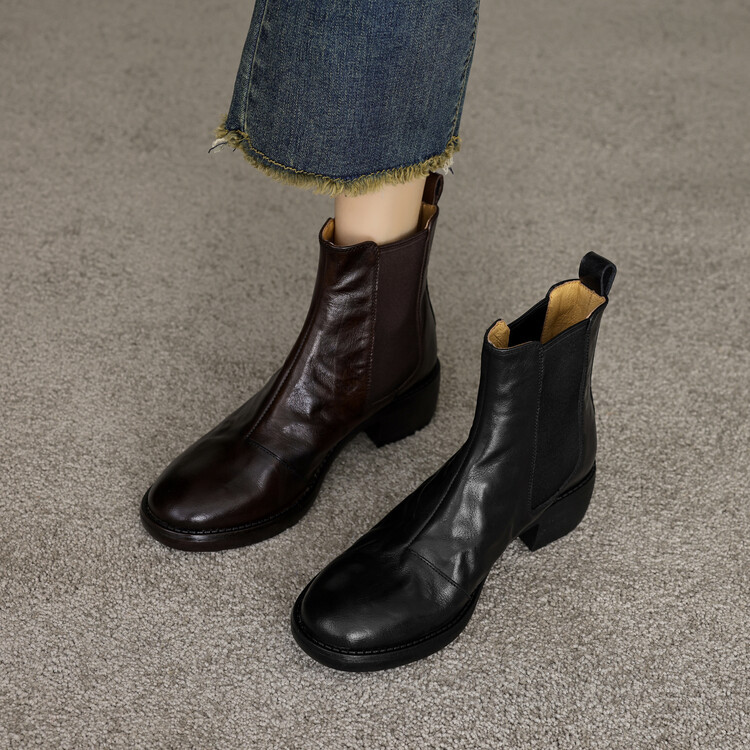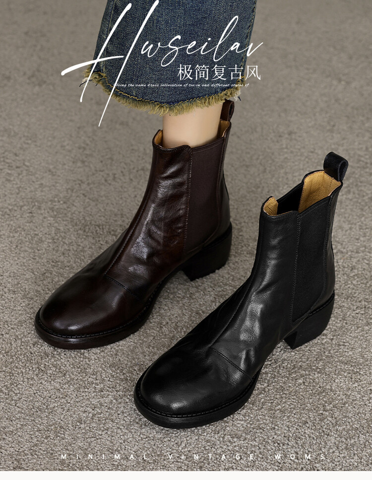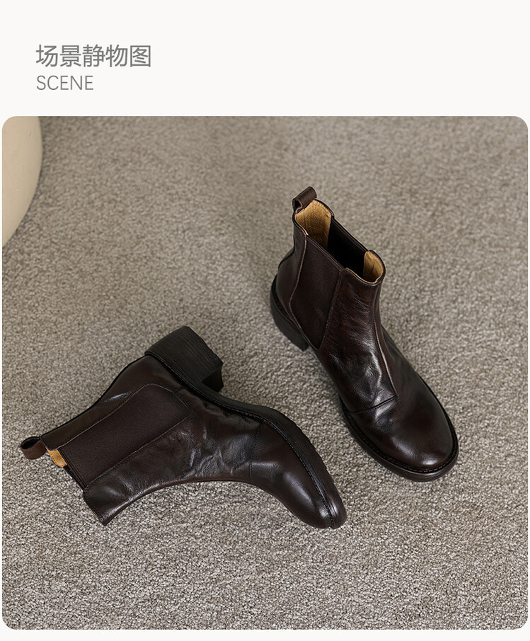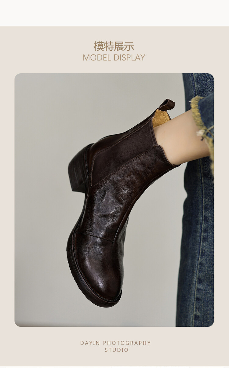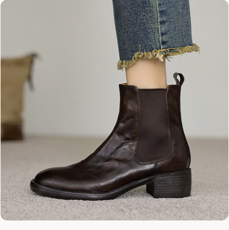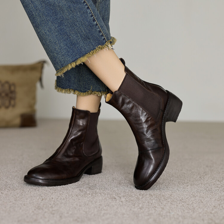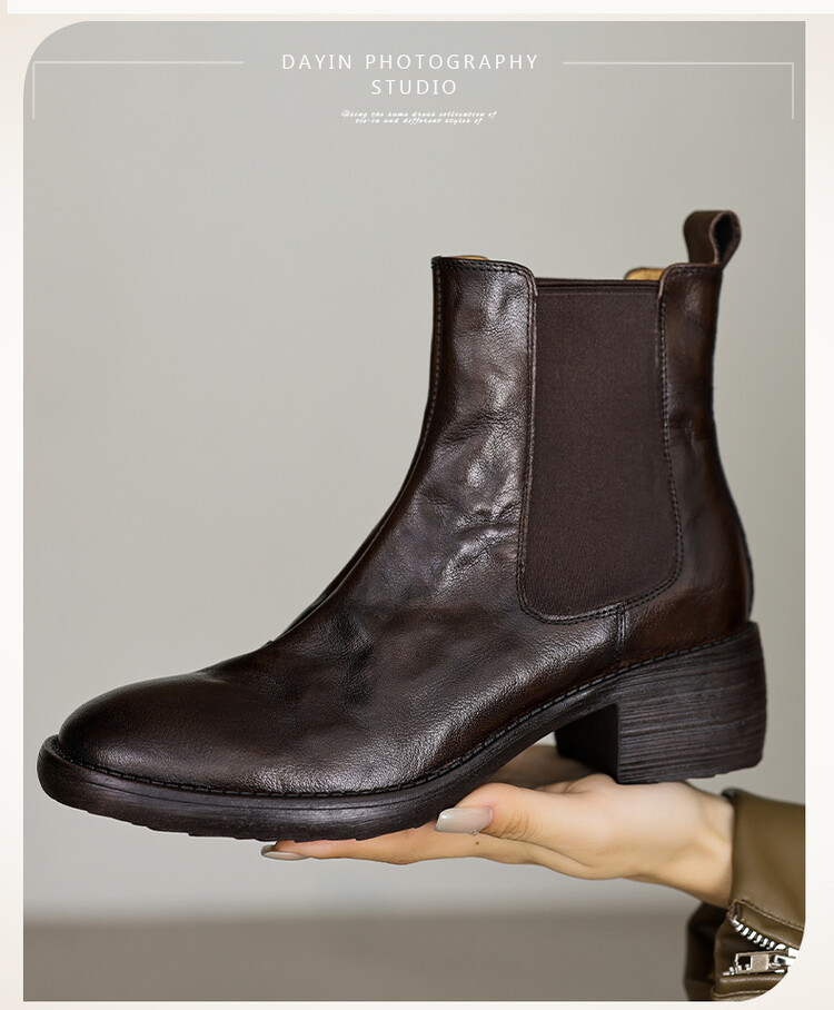 빈티지 카우보이 영국 스타일 라운드 헤드 첼시 부츠 여자 가을 겨울 다크 브라운 청키 힐 마틴 부츠 봄과 가을 싱글 부츠스토어 가기