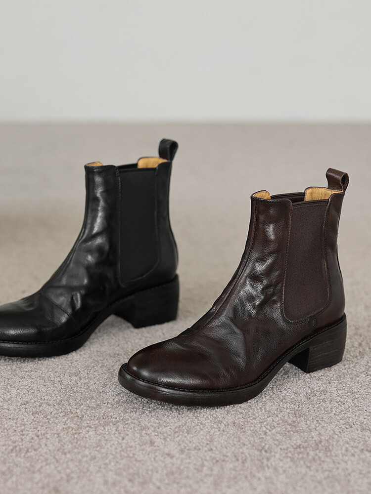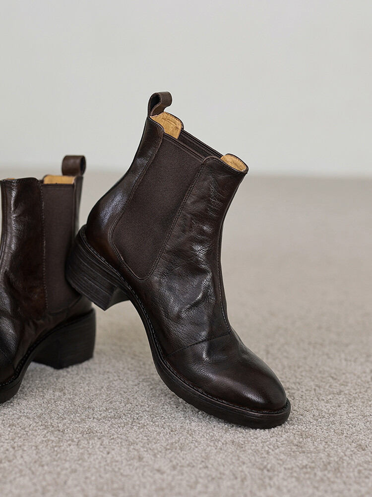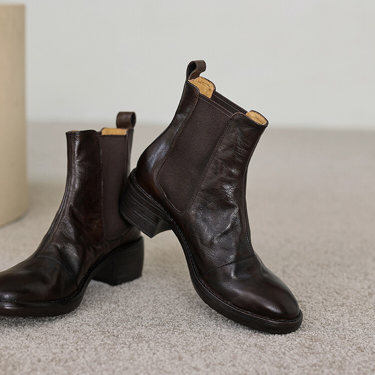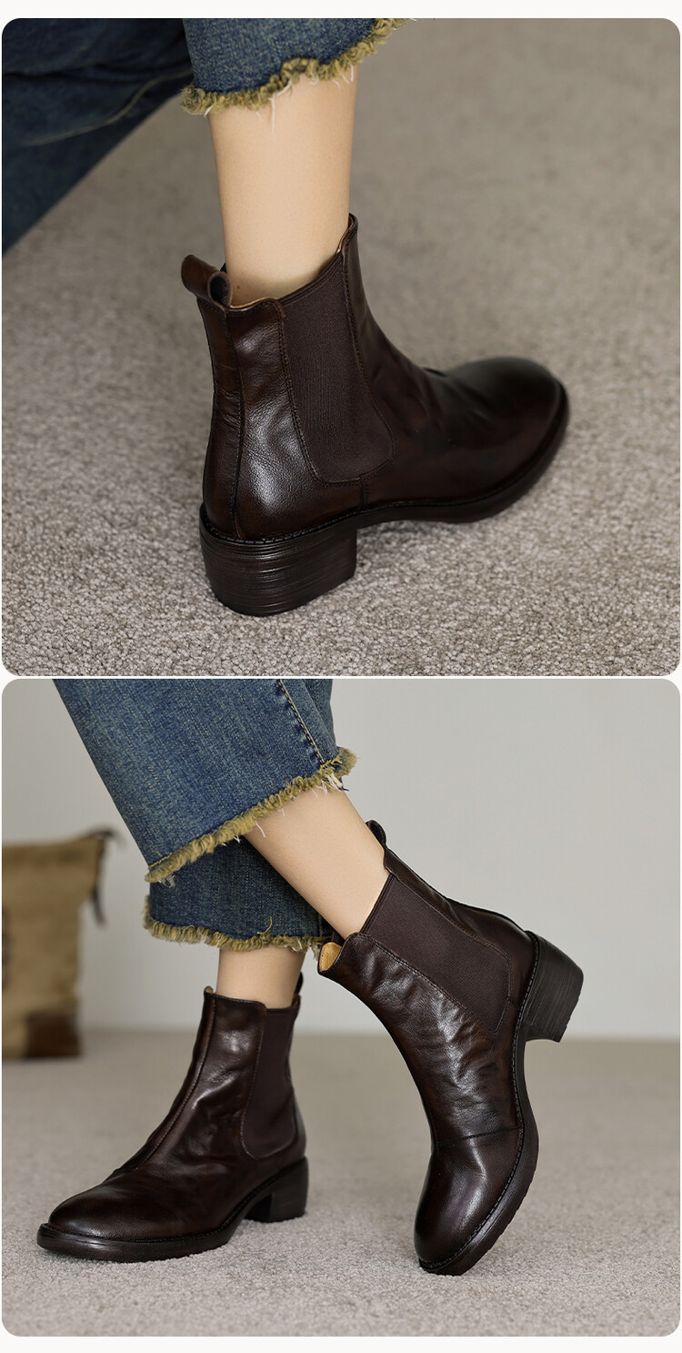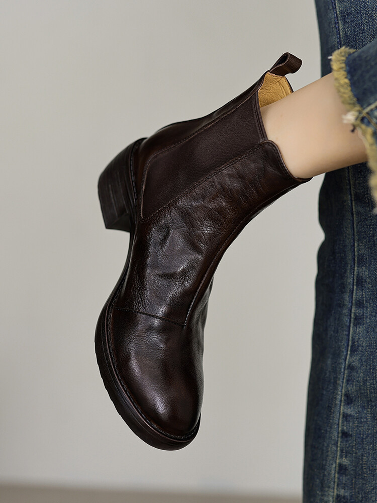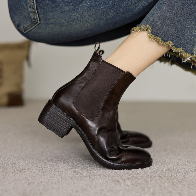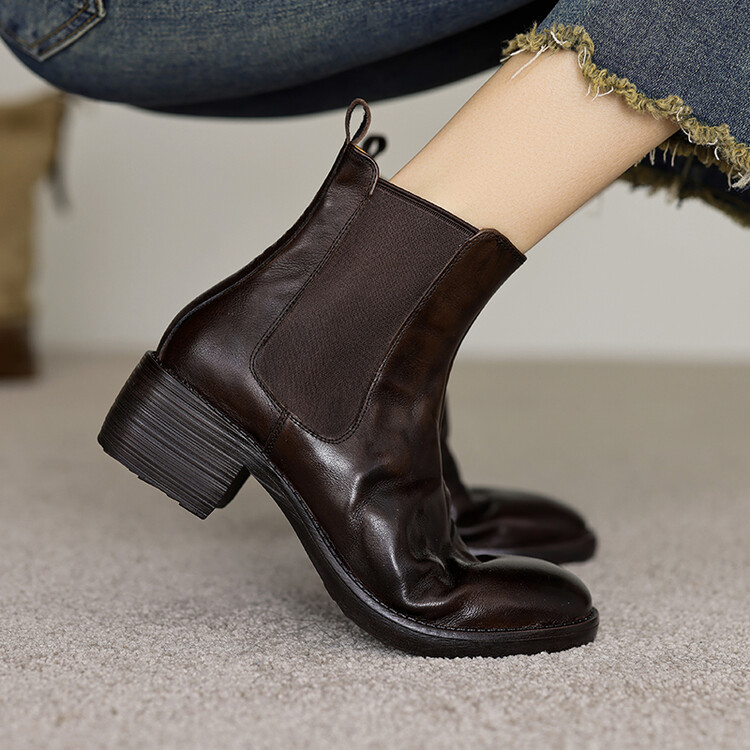 빈티지 카우보이 영국 스타일 라운드 헤드 첼시 부츠 여자 가을 겨울 다크 브라운 청키 힐 마틴 부츠 봄과 가을 싱글 부츠스토어 가기