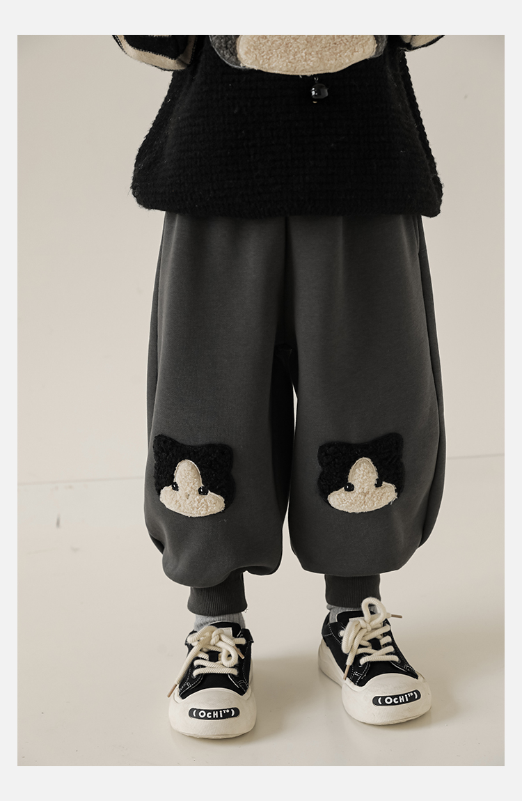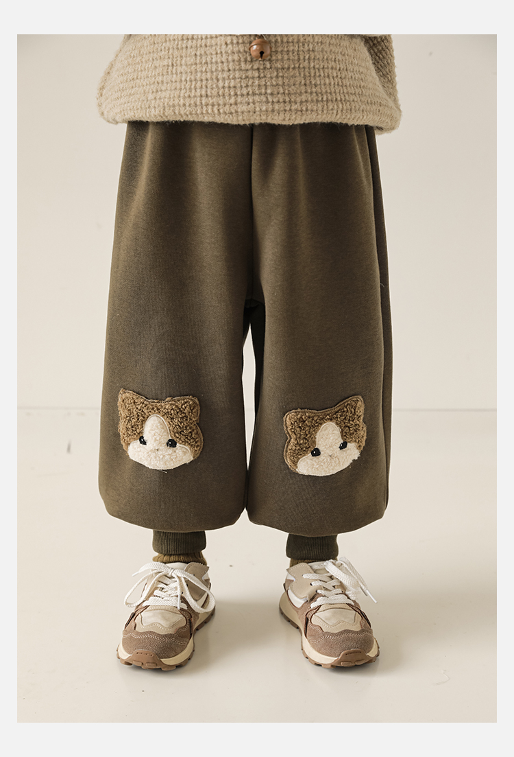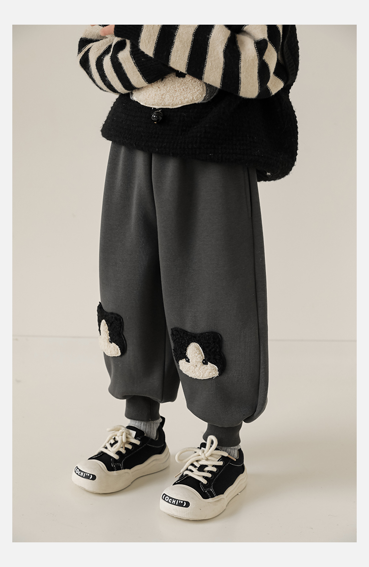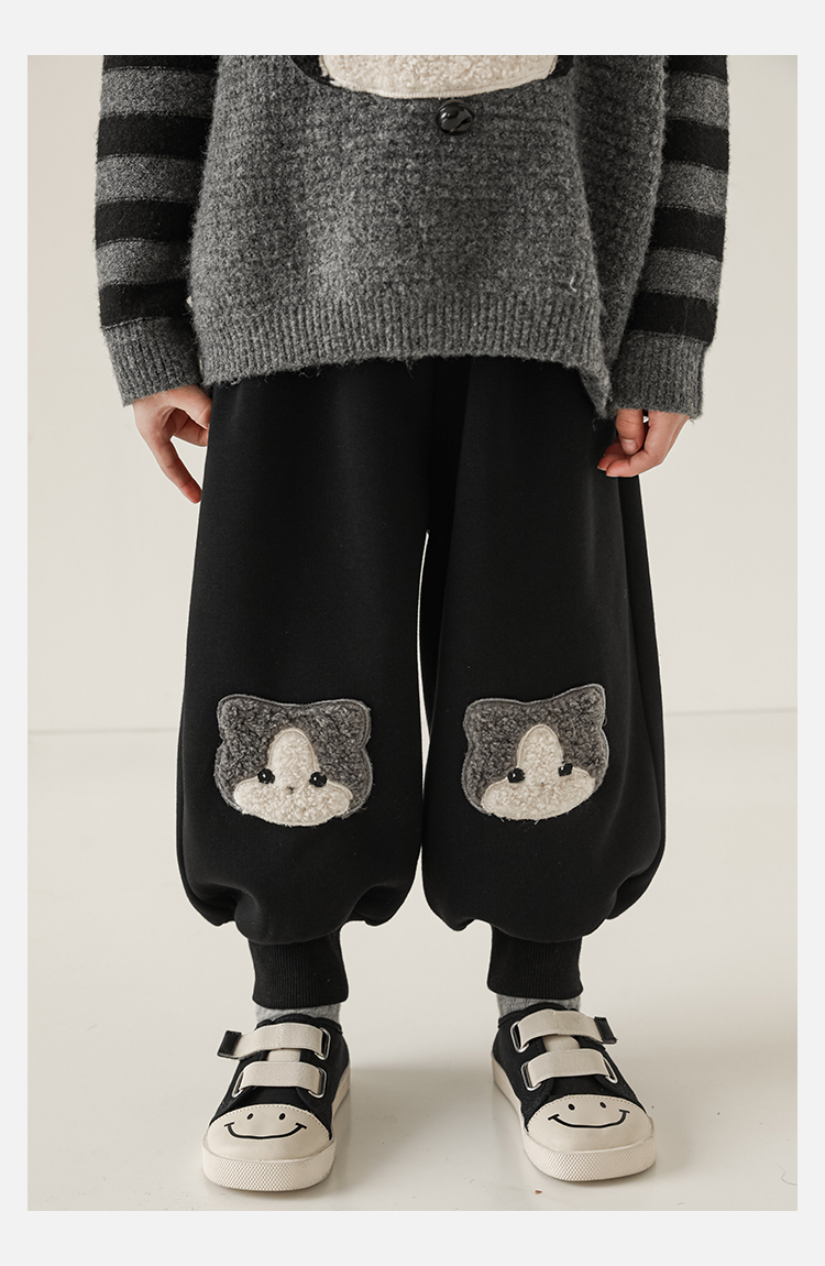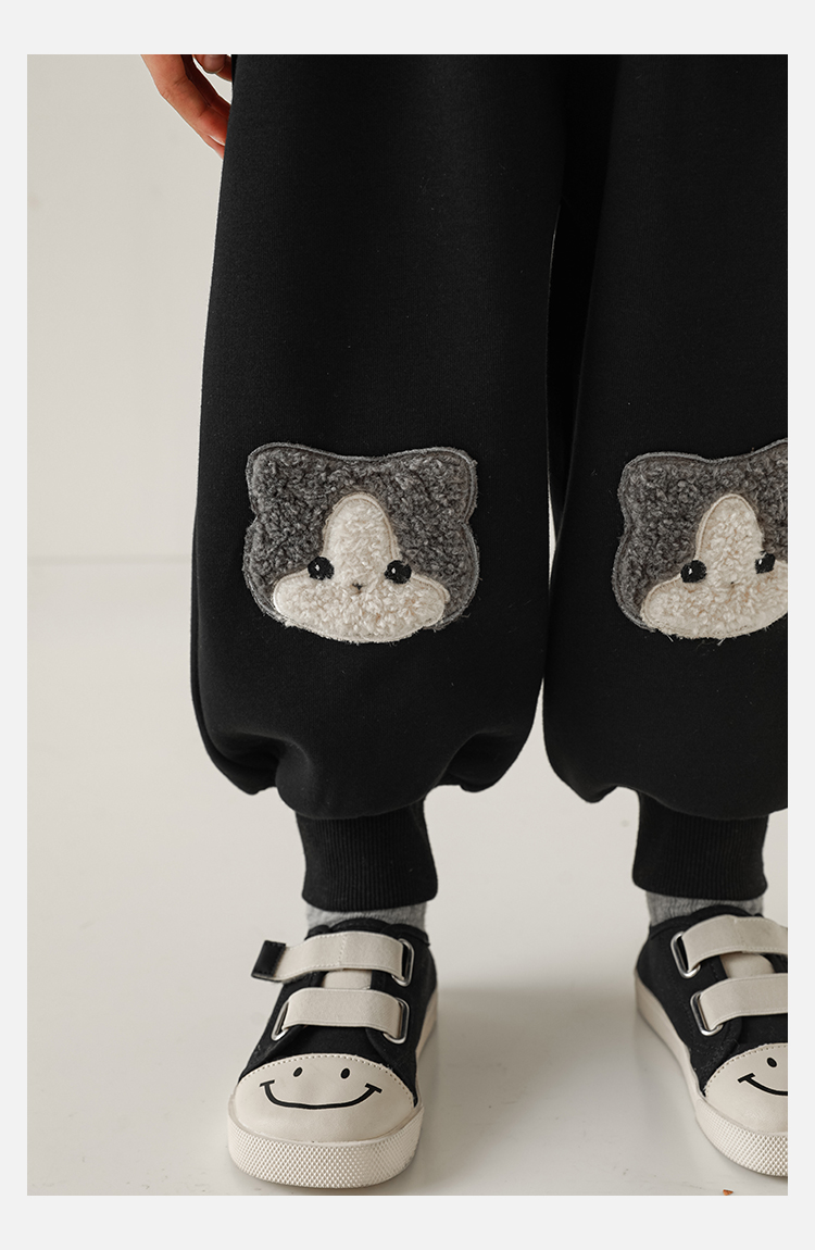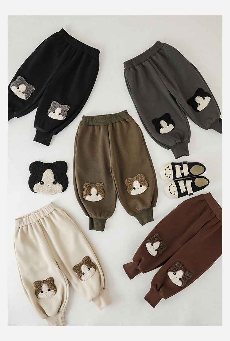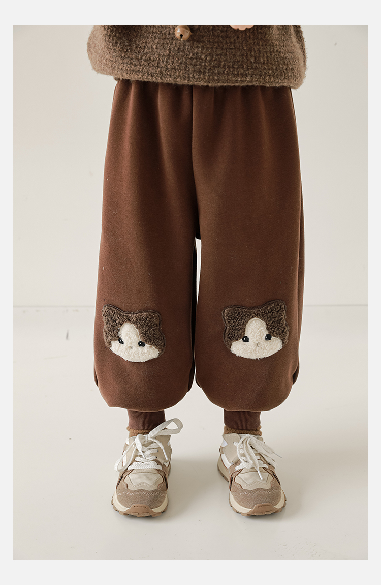 Wurib 소년 새끼 고양이 패치 로고 기모 두꺼운 발가락 캐주얼 바지 겨울 어린이 느슨한 바지 조수