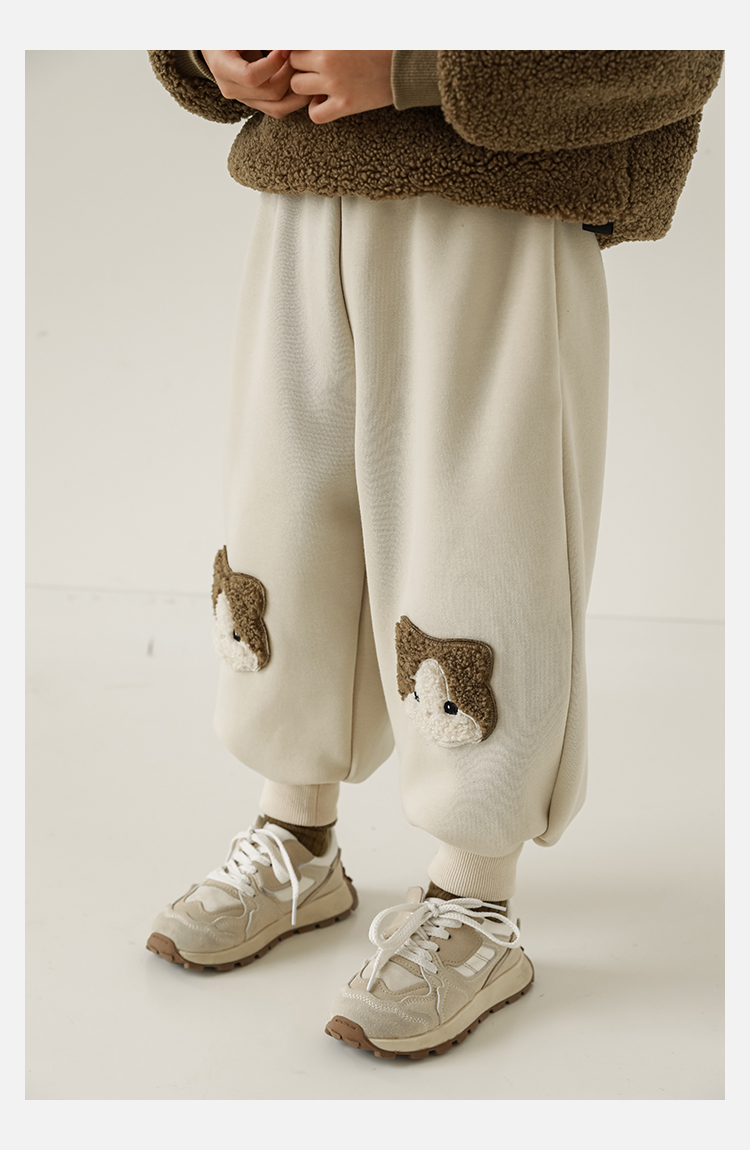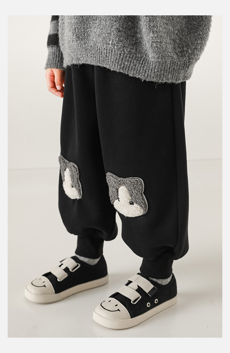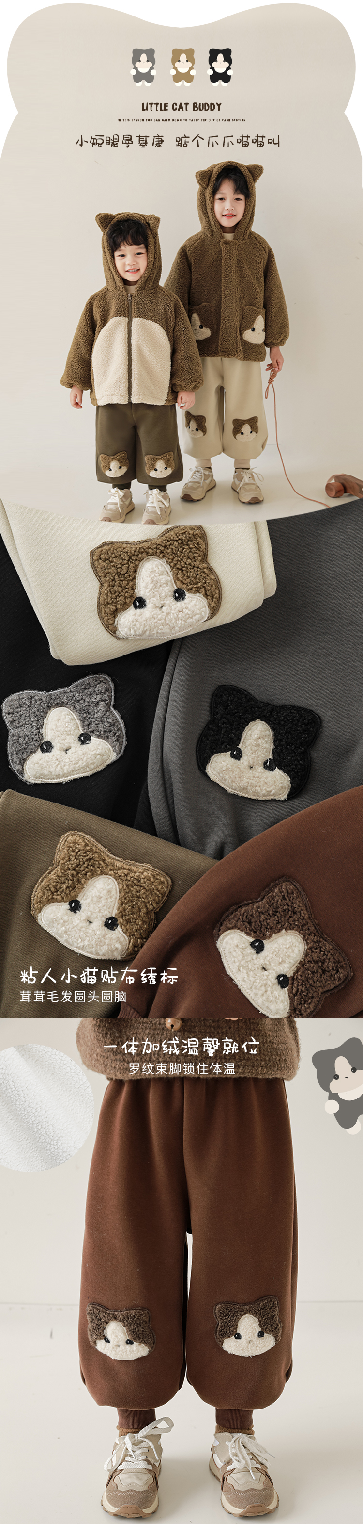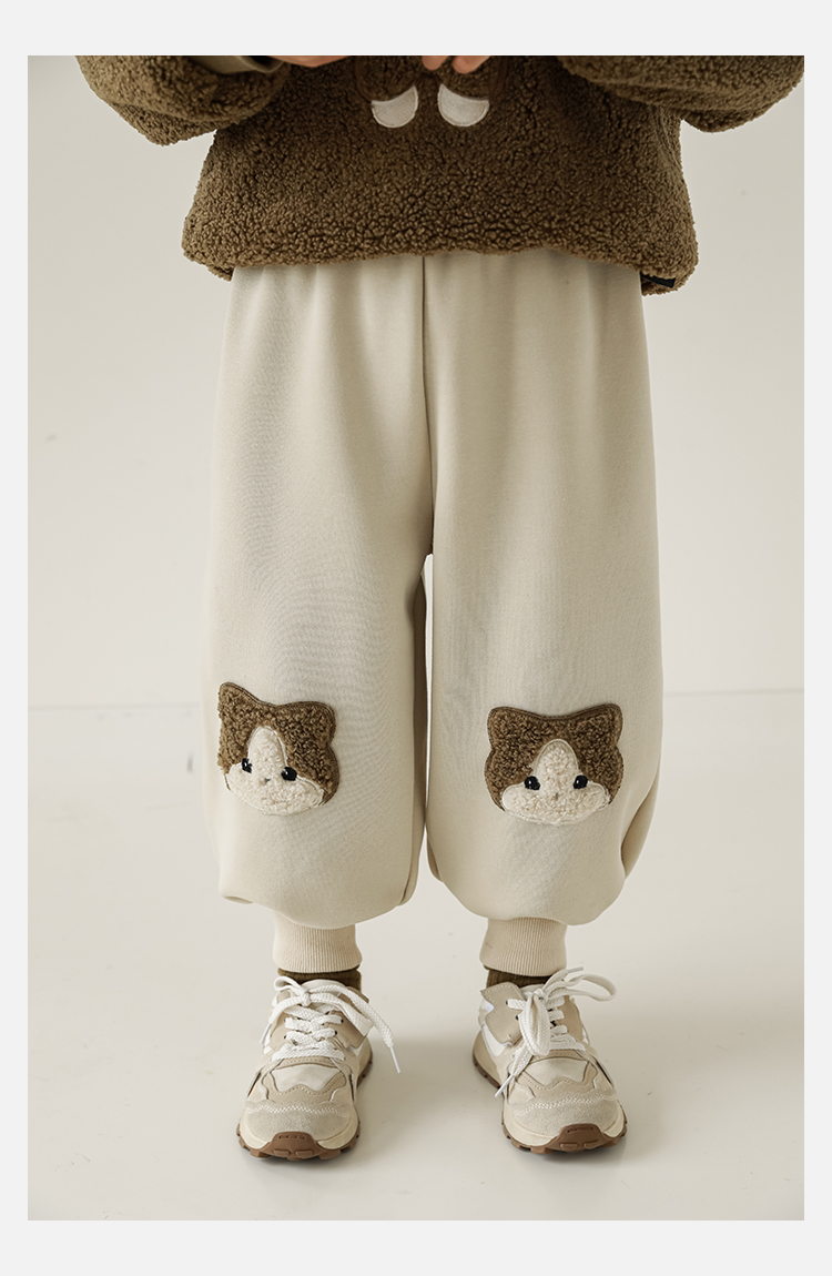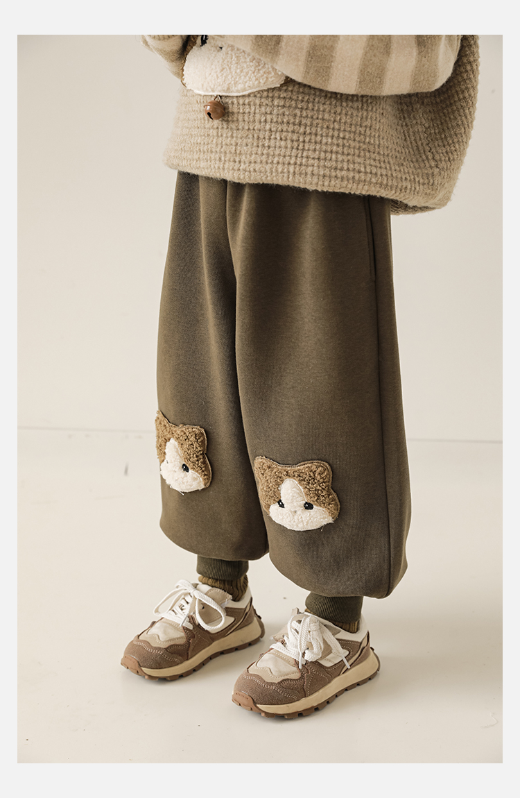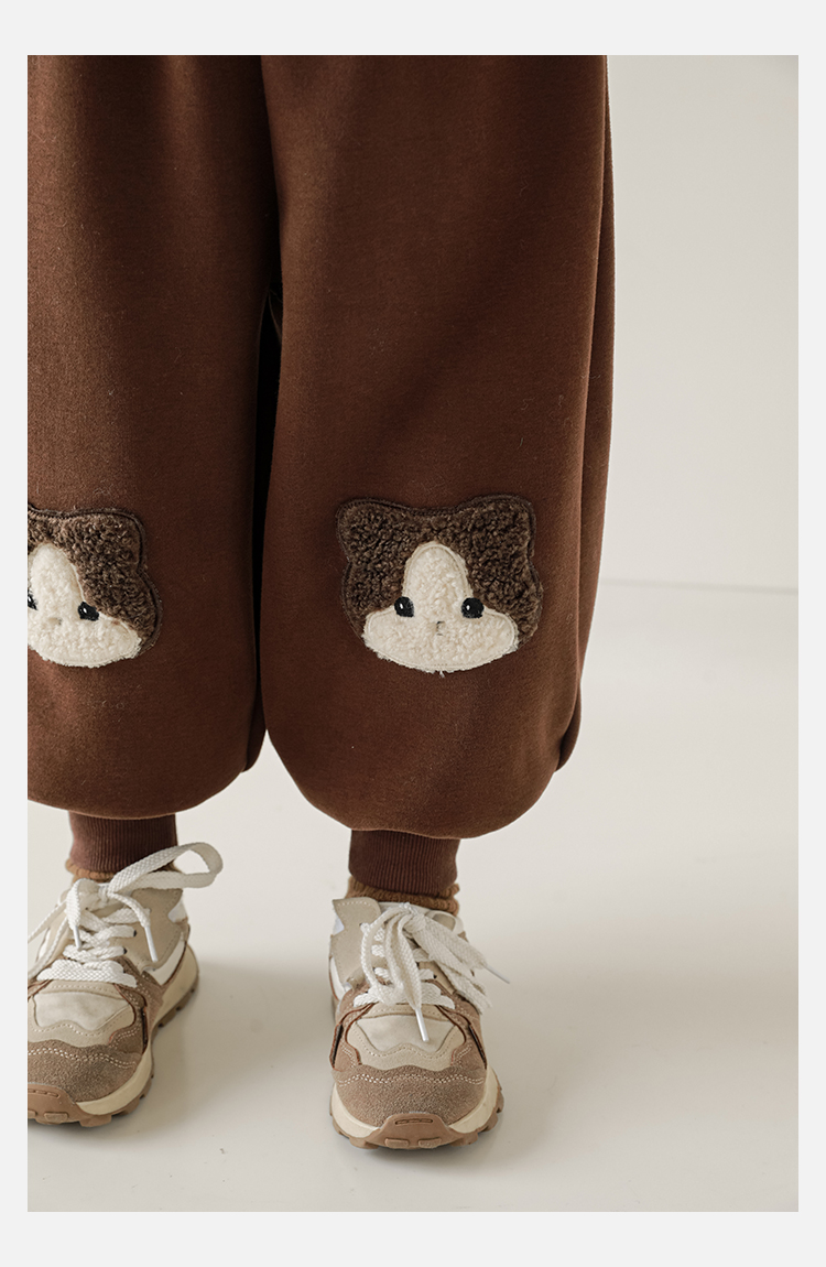 Wurib 소년 새끼 고양이 패치 로고 기모 두꺼운 발가락 캐주얼 바지 겨울 어린이 느슨한 바지 조수