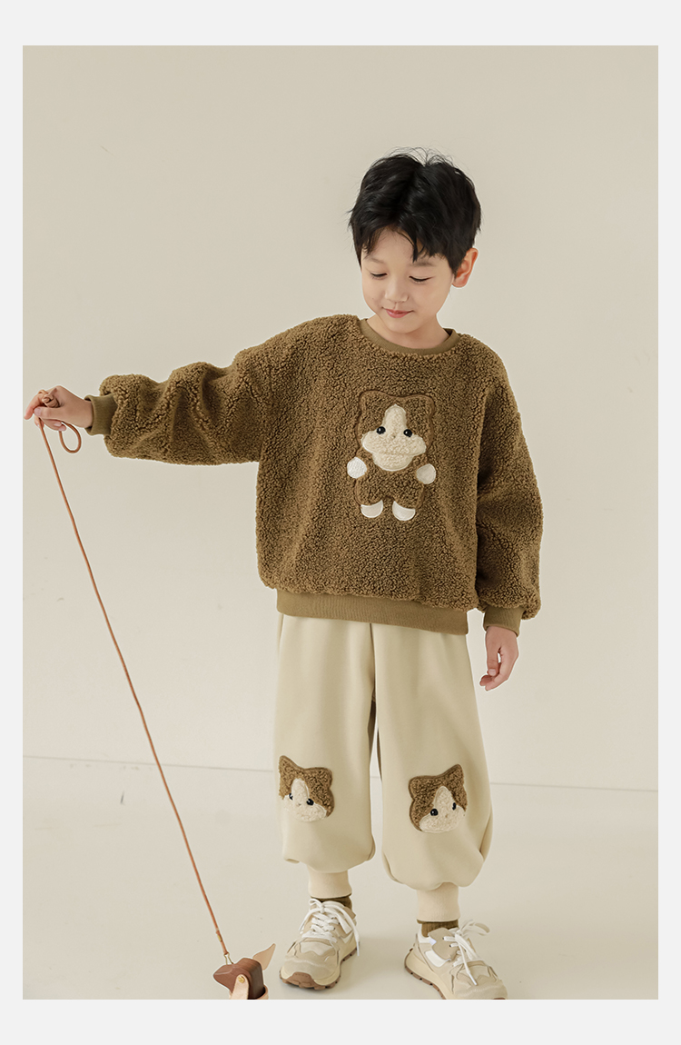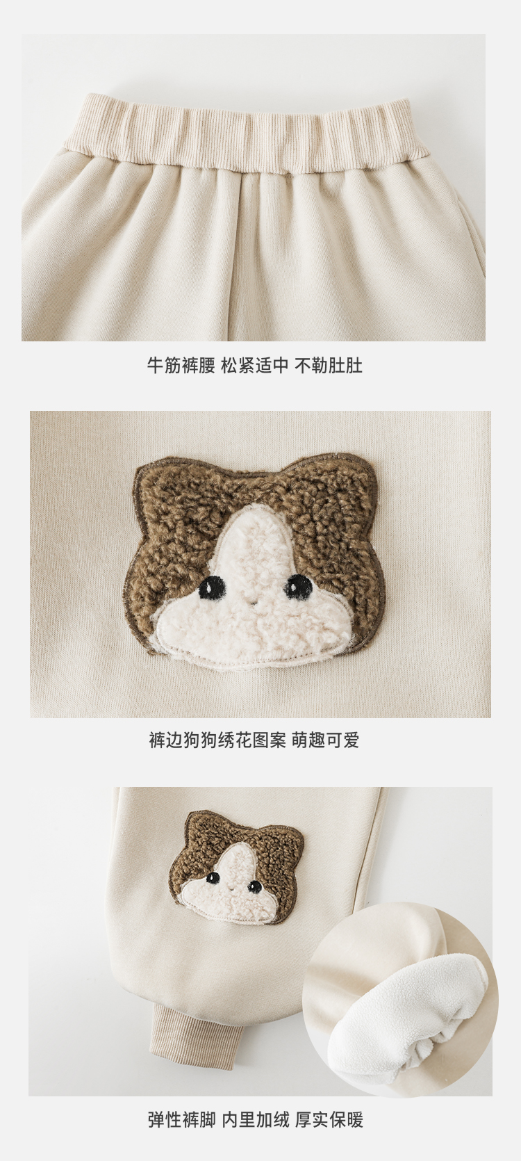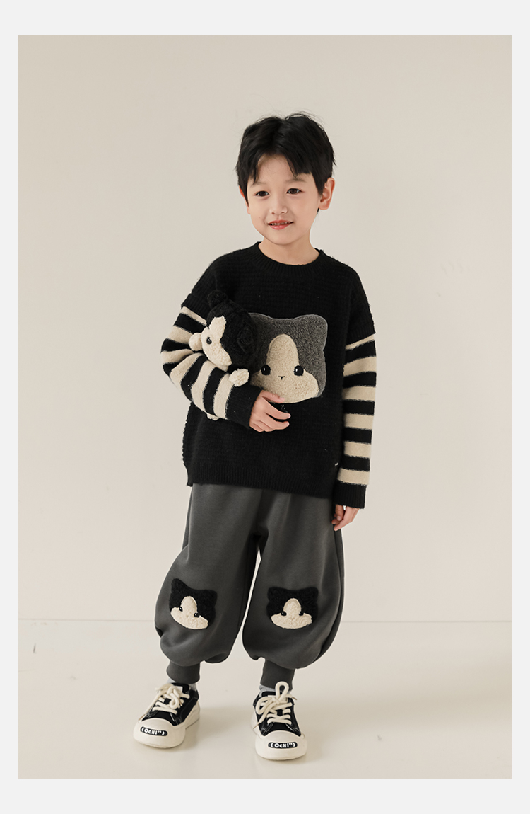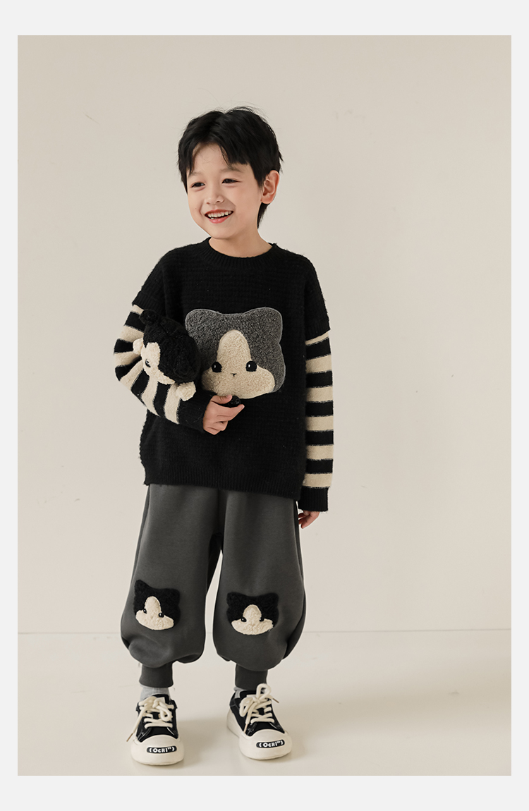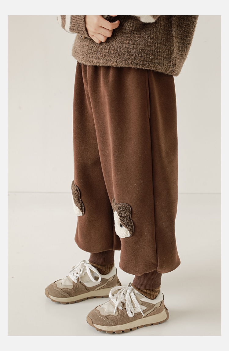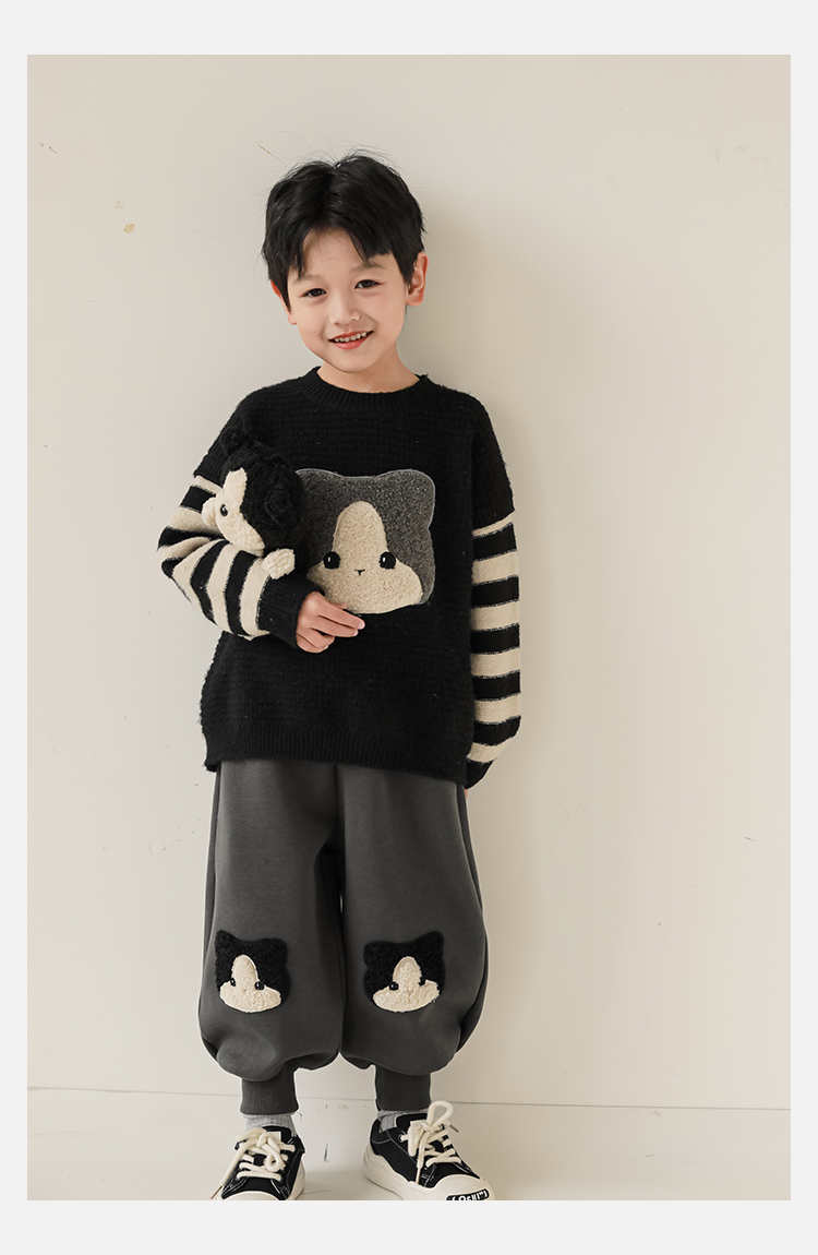Wurib 소년 새끼 고양이 패치 로고 기모 두꺼운 발가락 캐주얼 바지 겨울 어린이 느슨한 바지 조수