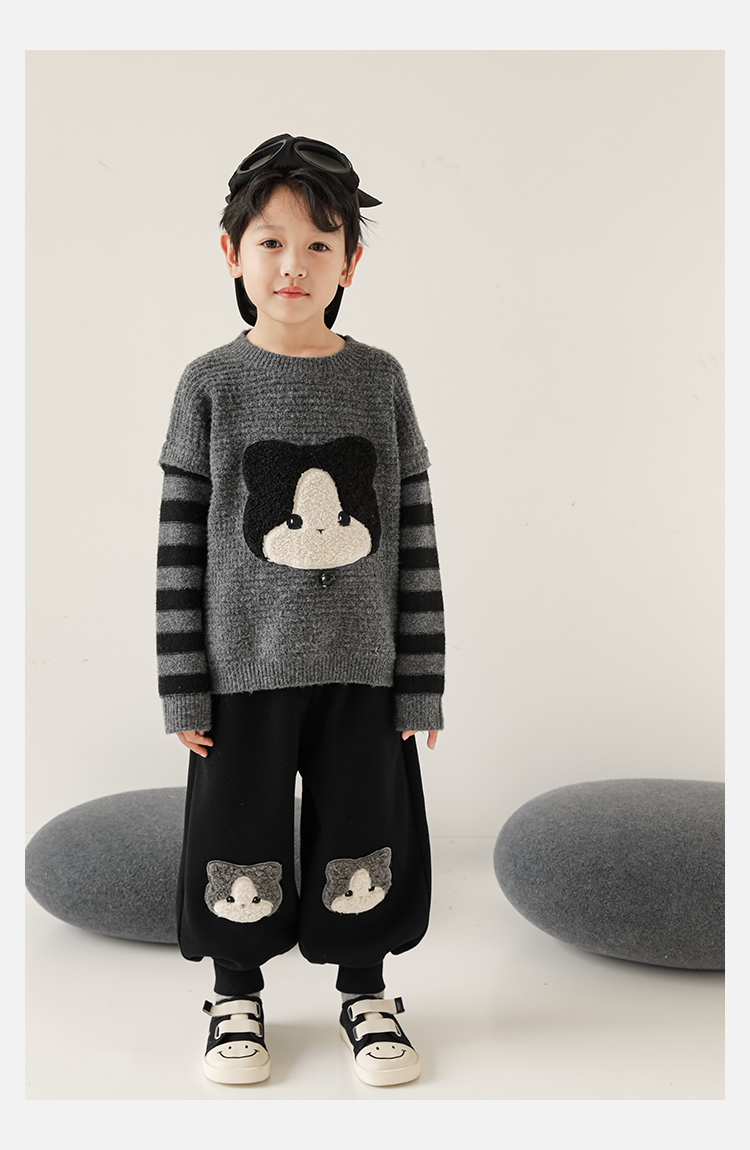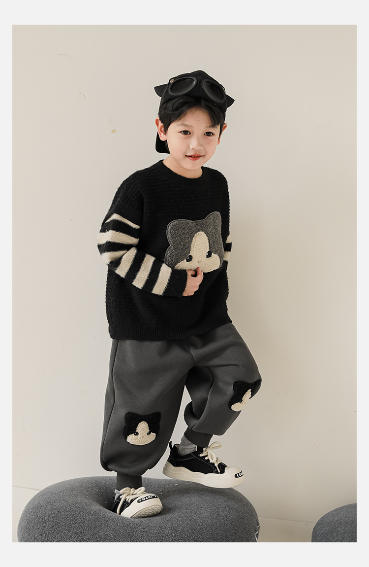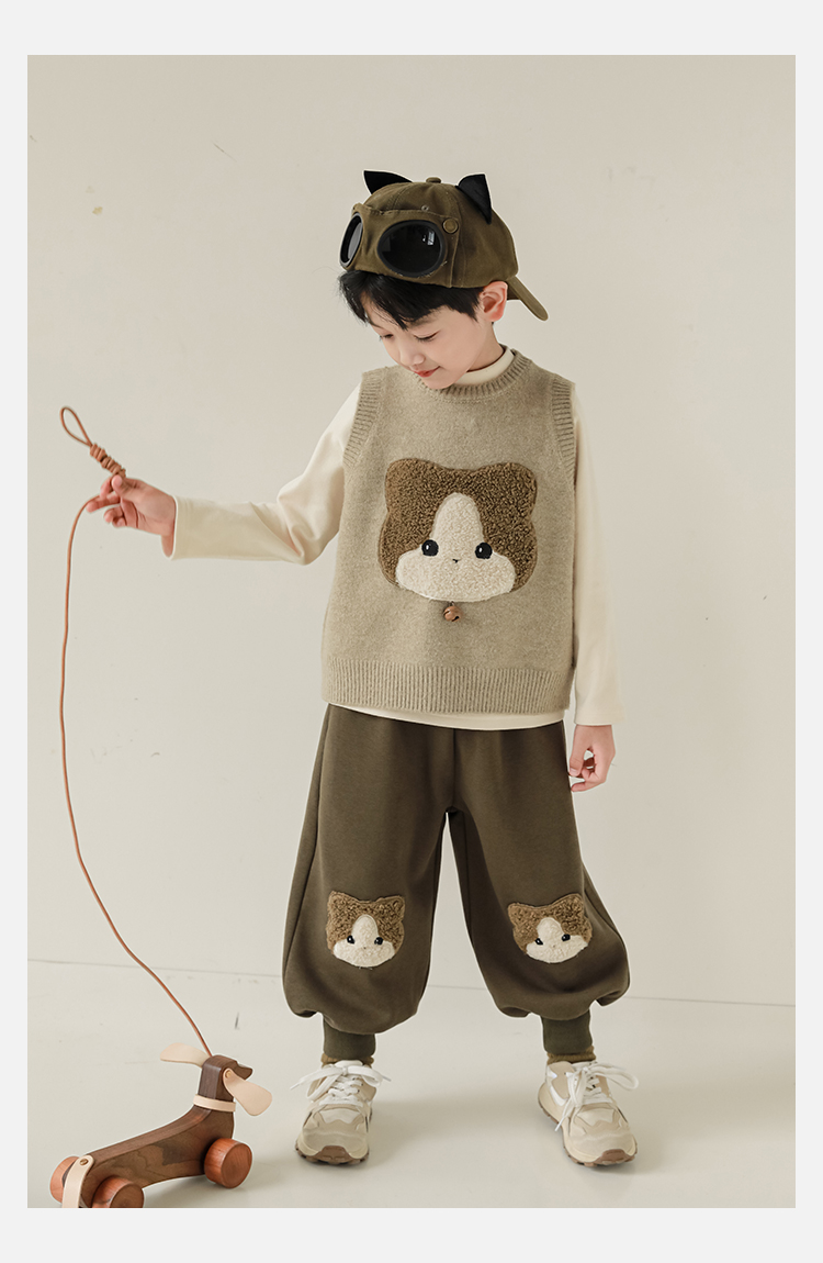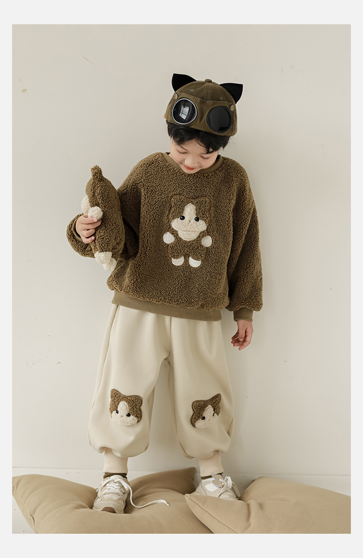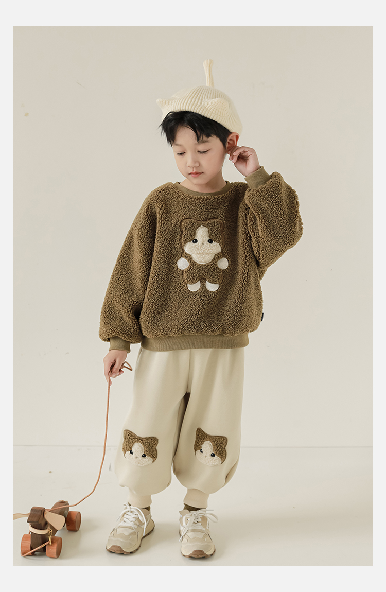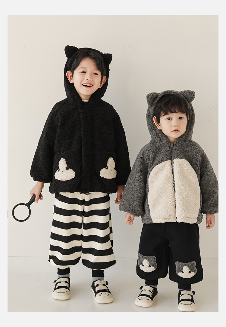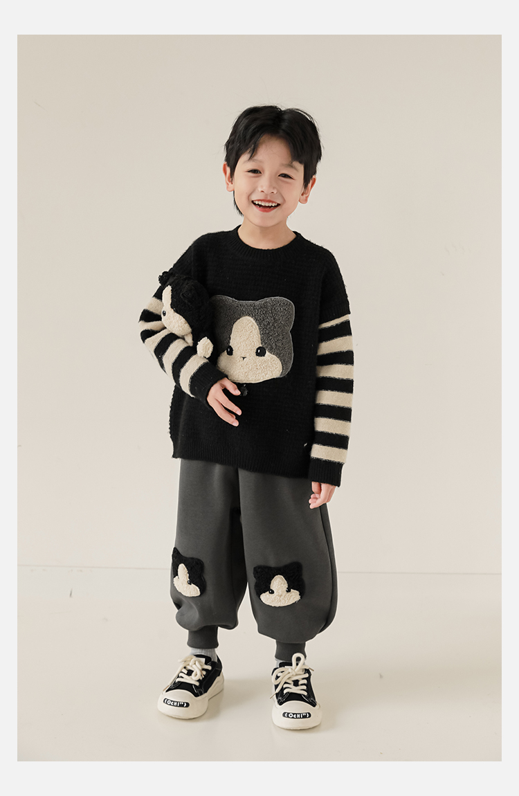 Wurib 소년 새끼 고양이 패치 로고 기모 두꺼운 발가락 캐주얼 바지 겨울 어린이 느슨한 바지 조수
