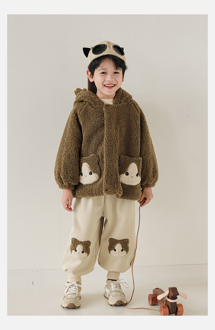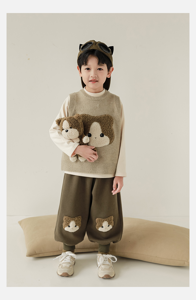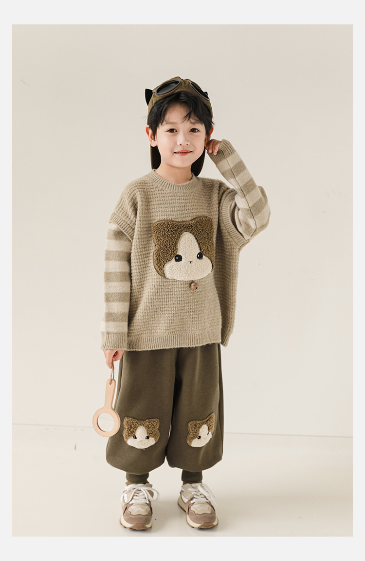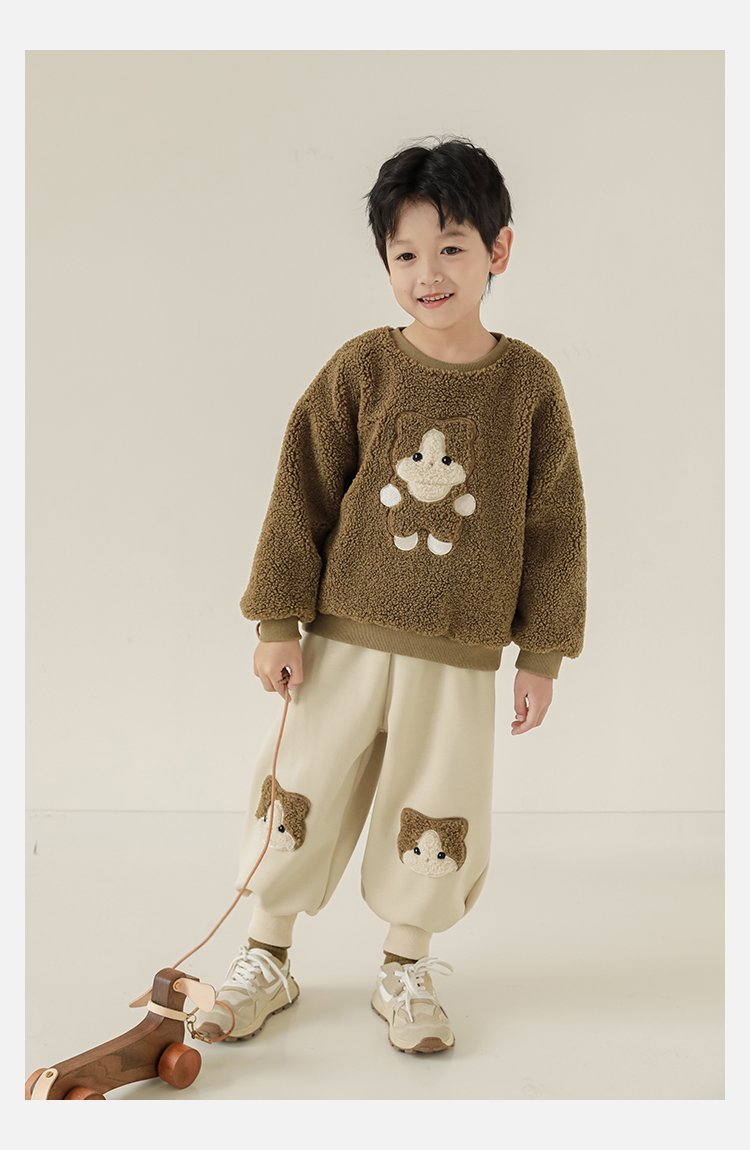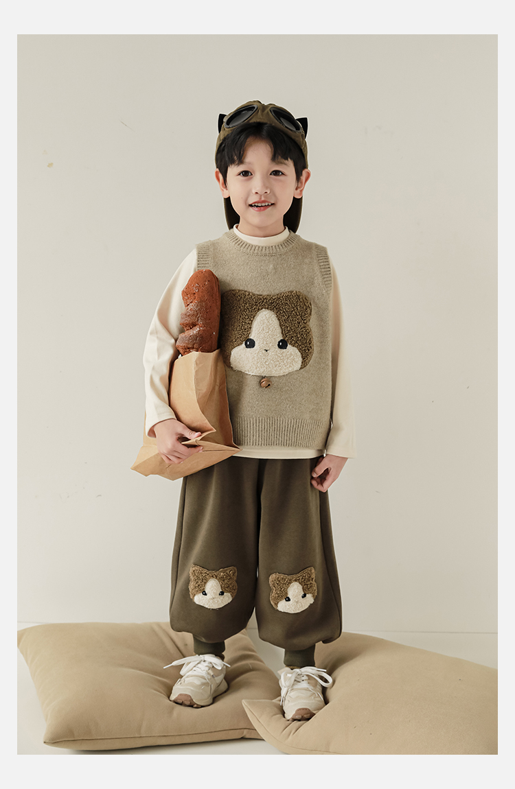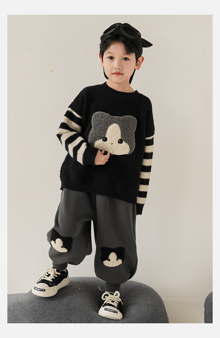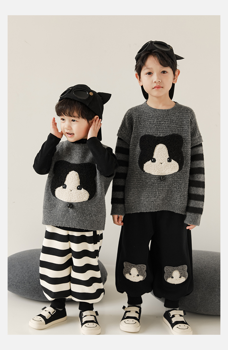 Wurib 소년 새끼 고양이 패치 로고 기모 두꺼운 발가락 캐주얼 바지 겨울 어린이 느슨한 바지 조수