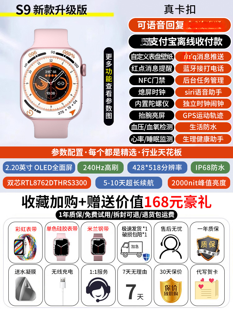 • S9Pro max [로즈핑크] 240HZ 재생률 + 전화 걸기 및 발신 + 무선 충전 + 메시지 푸시 + 오프라인 결제 + 스마트 아일랜드 업그레이드 + N