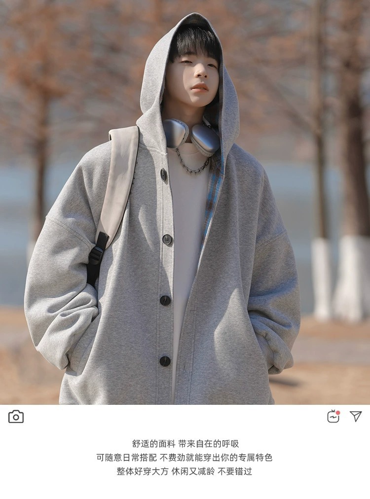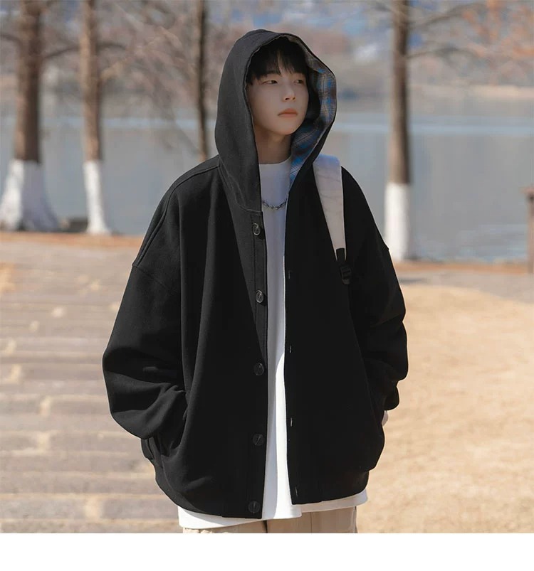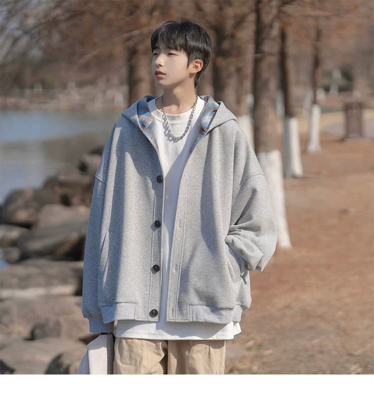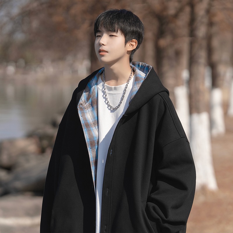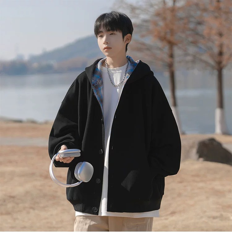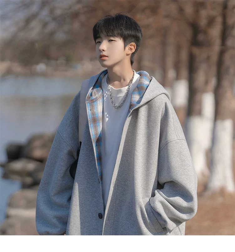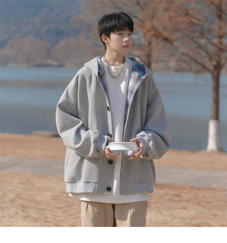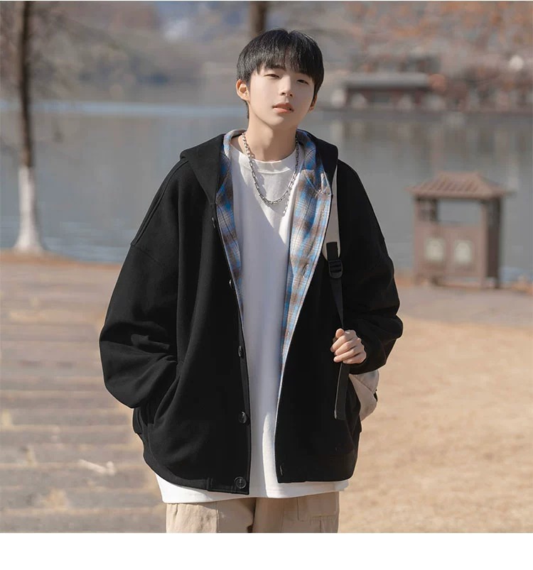 2024 패치 워크 격자 무늬 후드 재킷 남자 봄과 가을 한국 유행 하이 엔드 카디건 재킷 느슨한 플러스 사이즈 옷스토어 가기