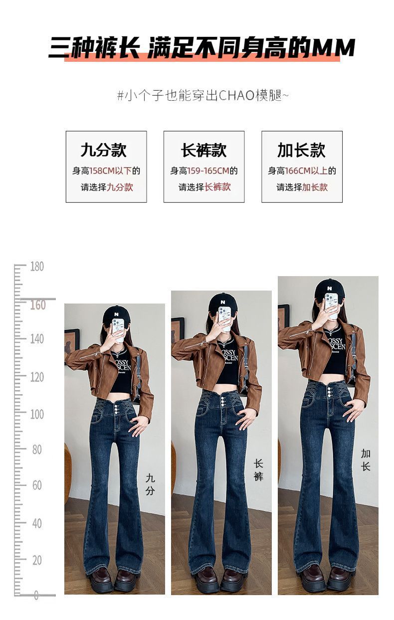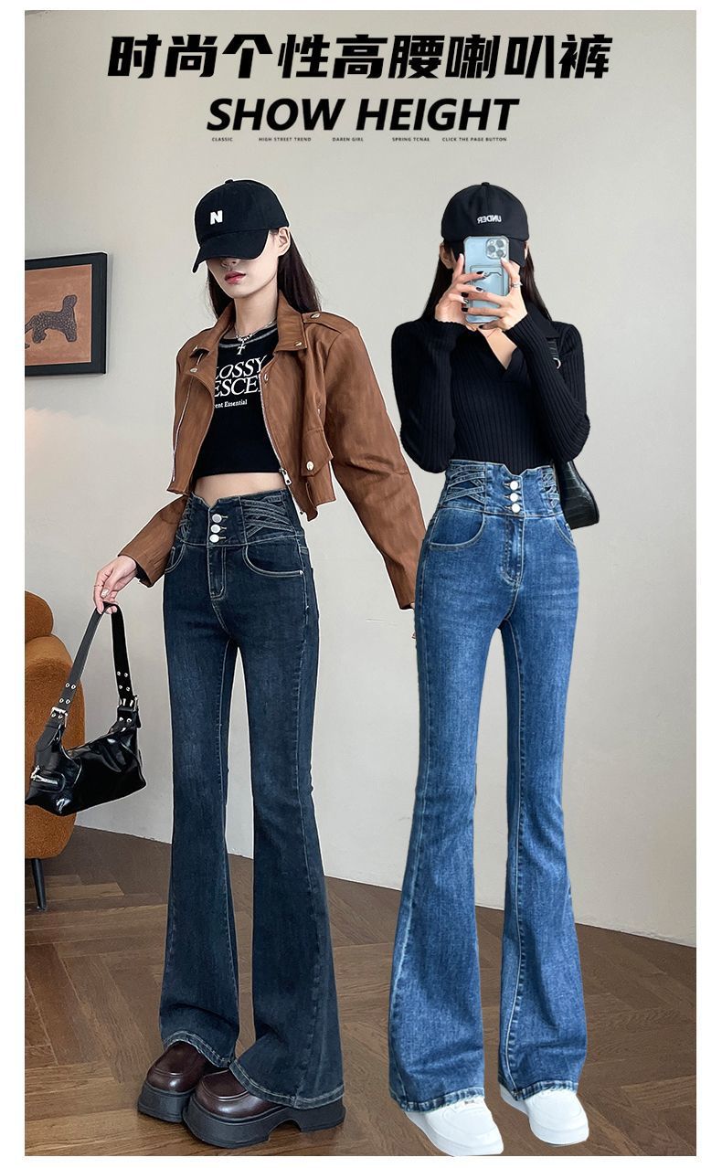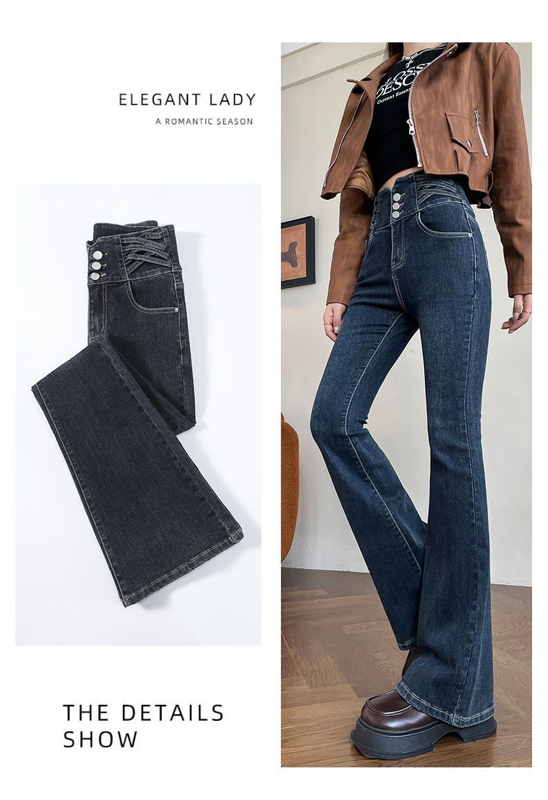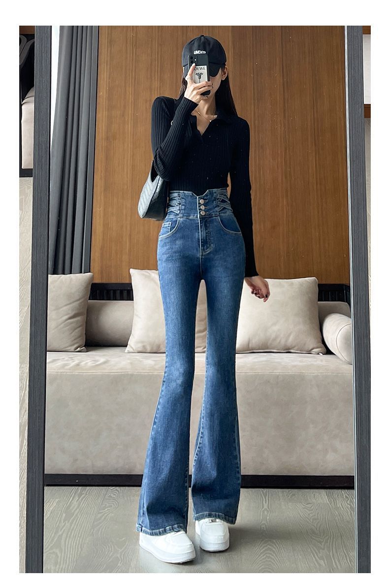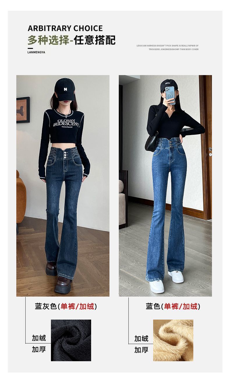 높은 허리 뿔 기모 두꺼운 청바지 여성용 스트레치 슬림 핏 슬리밍 디자인 말굽 바지스토어 가기
