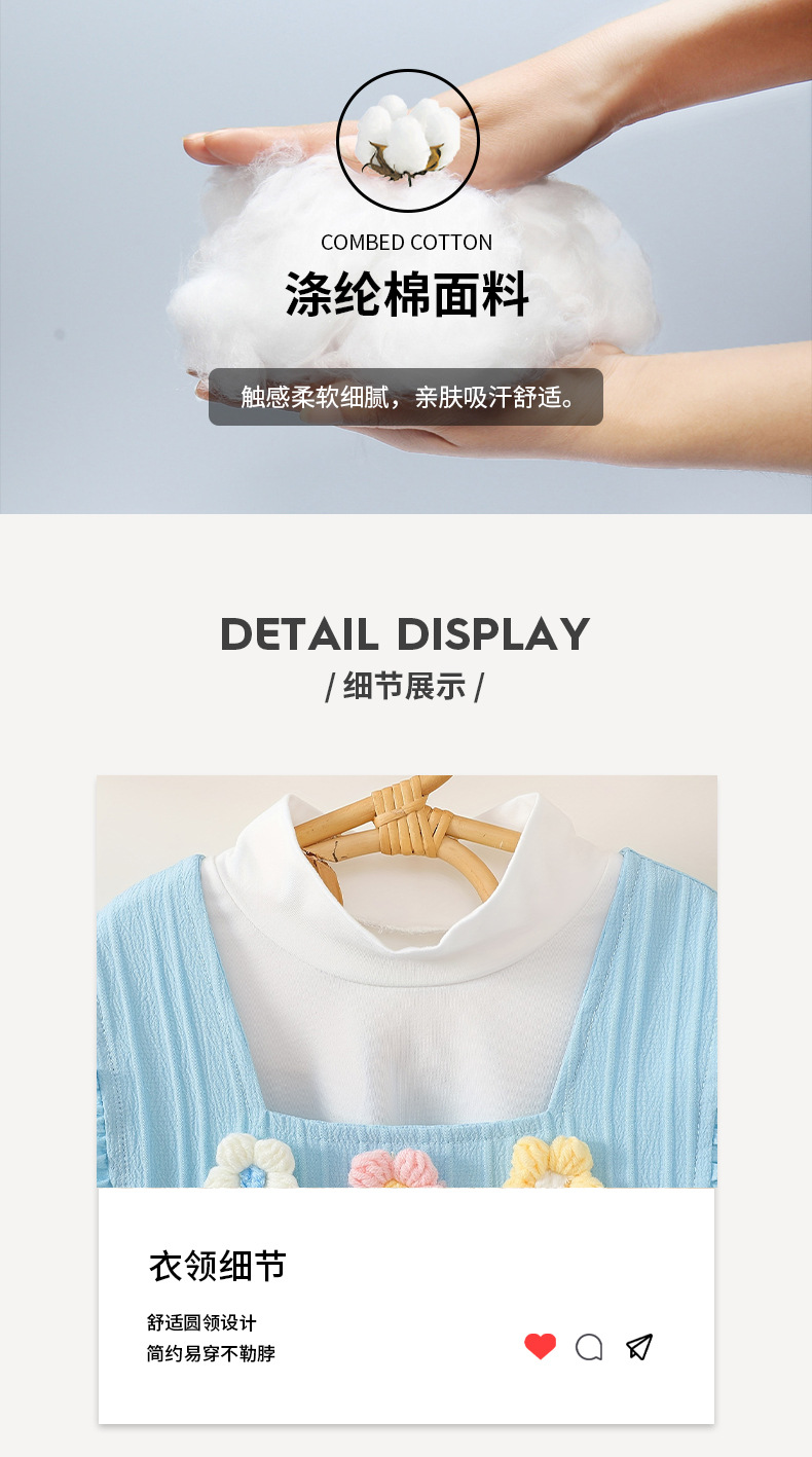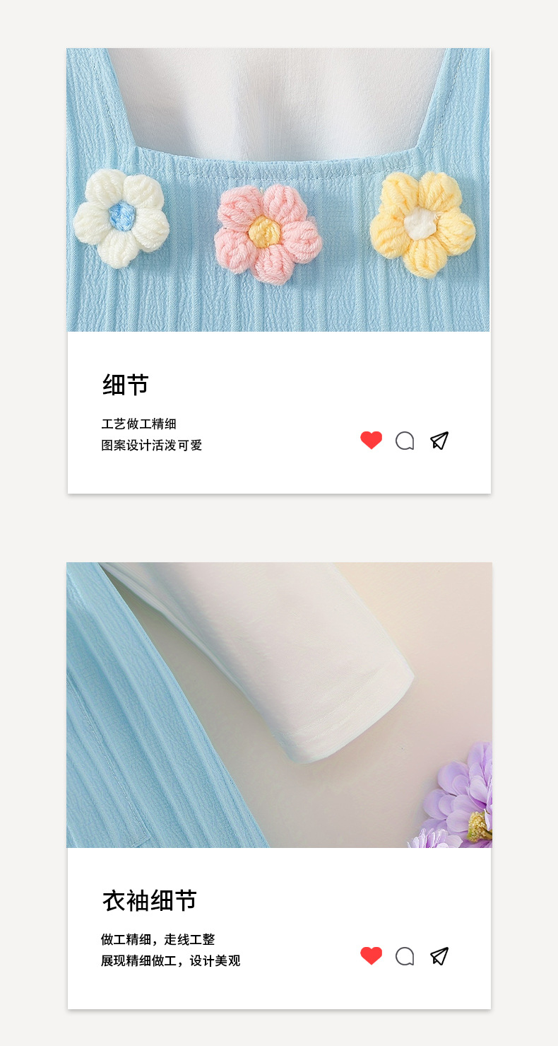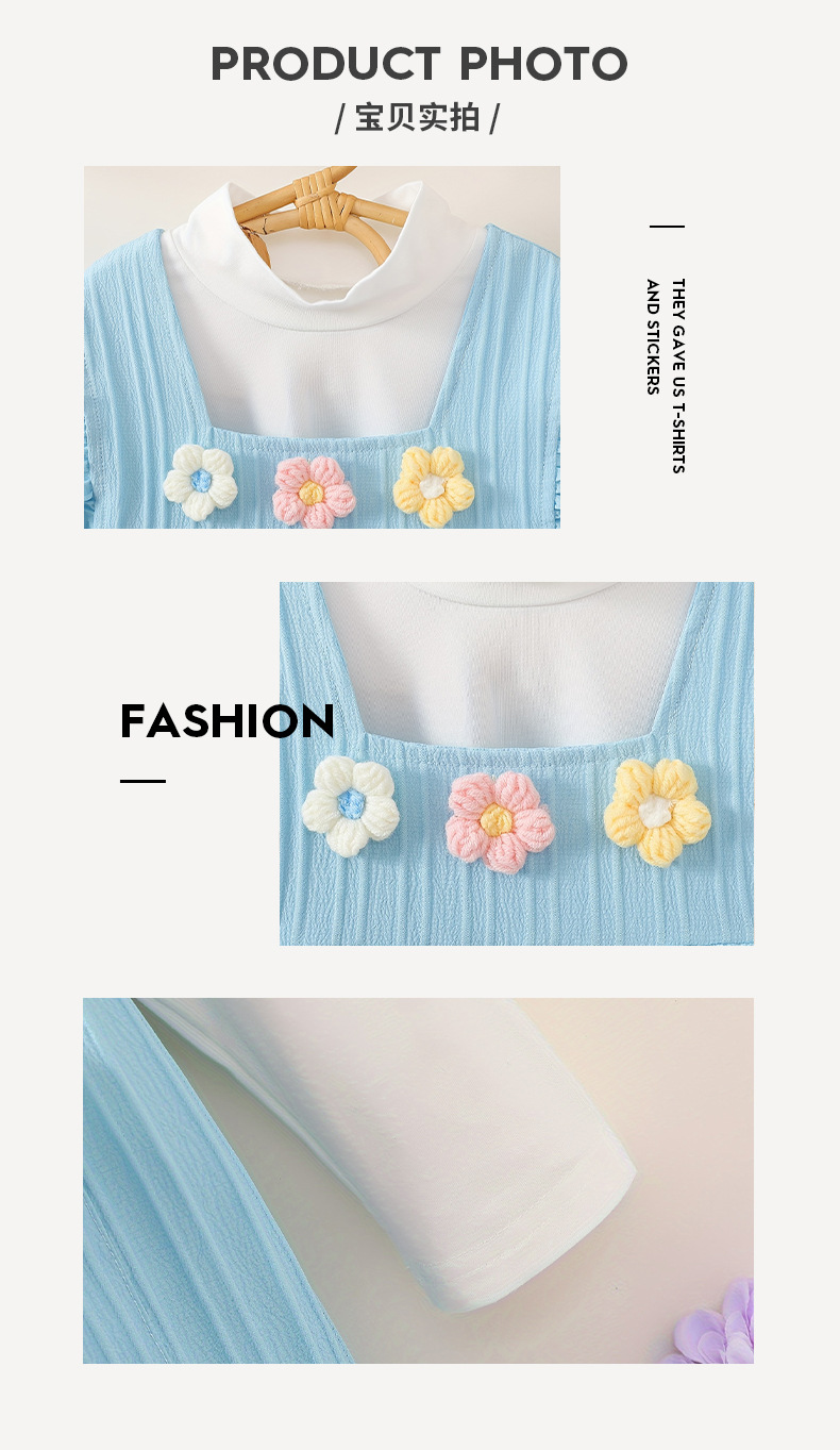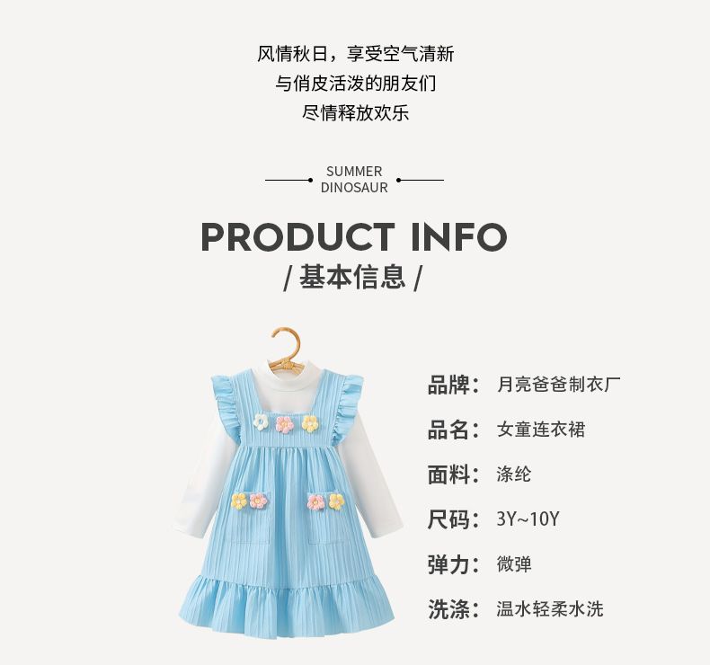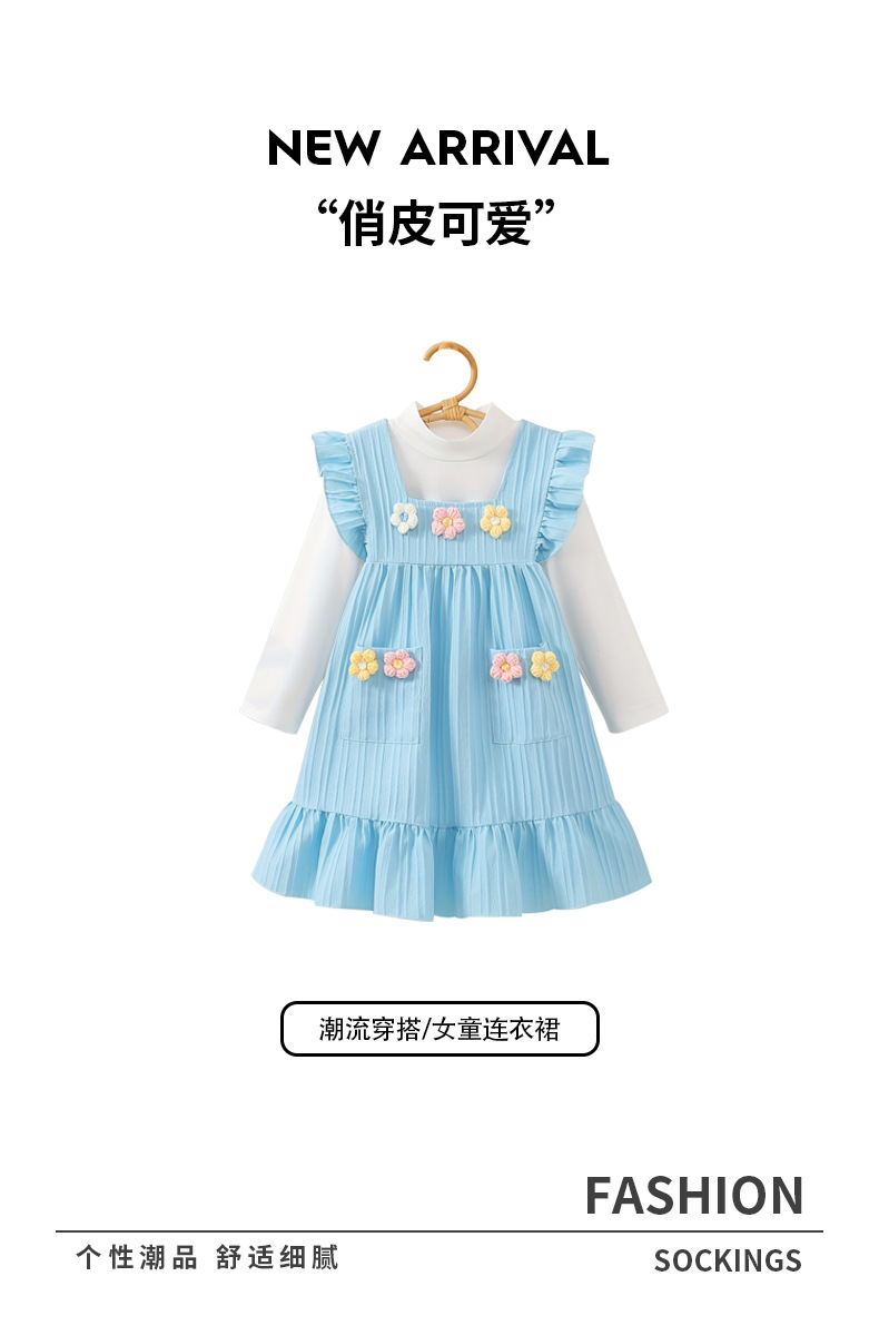가을 소녀 원피스 스카이 블루 귀여운 플라잉 슬리브 니트 3 차원 꽃 자수 긴 소매베이스 셔츠 투피스 세트