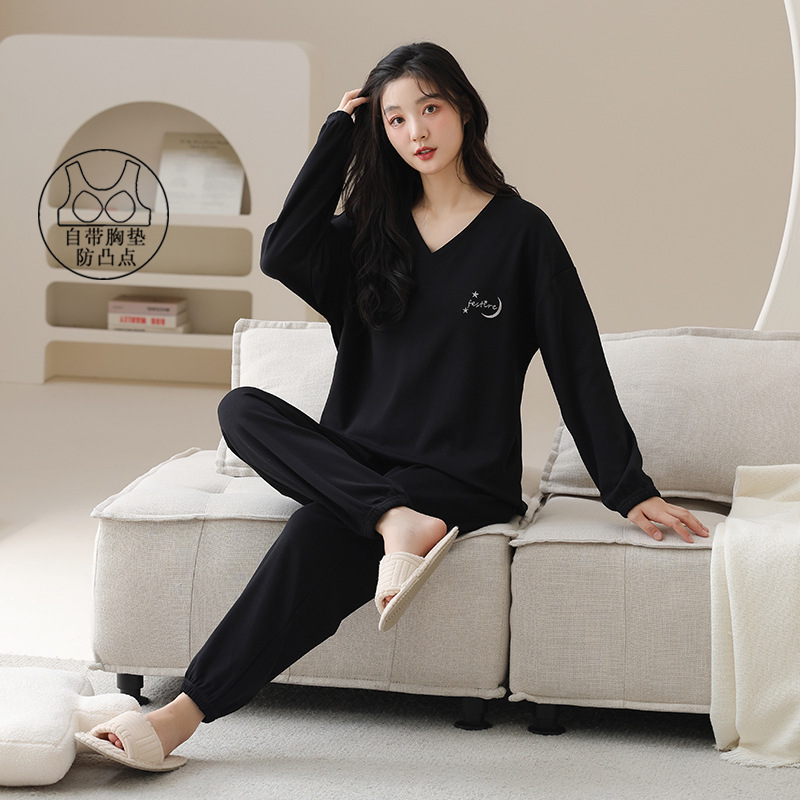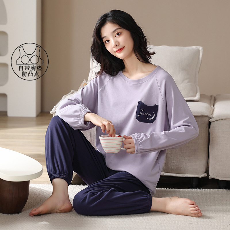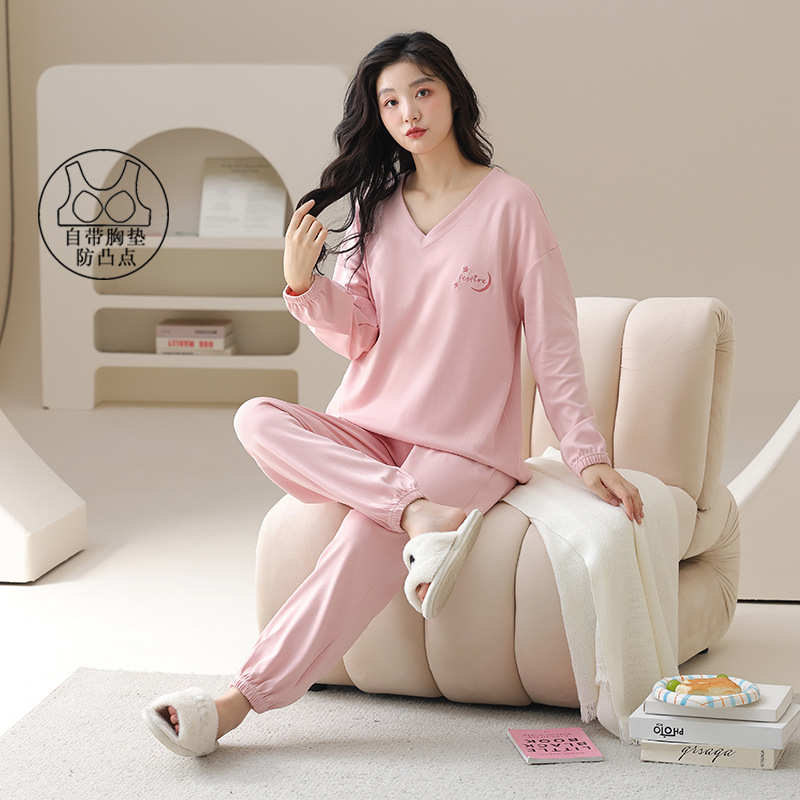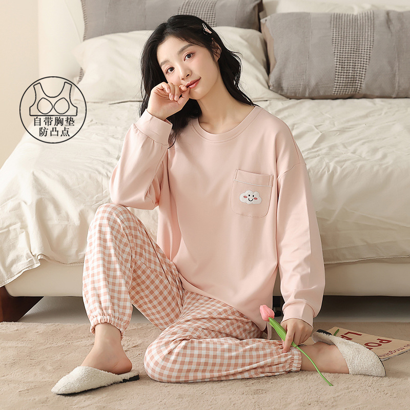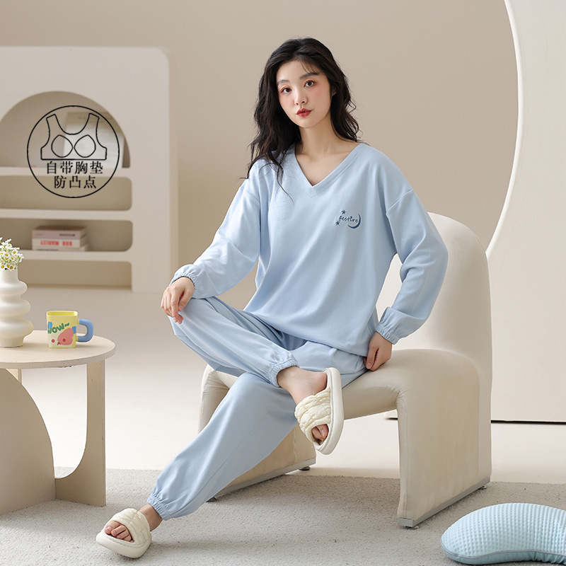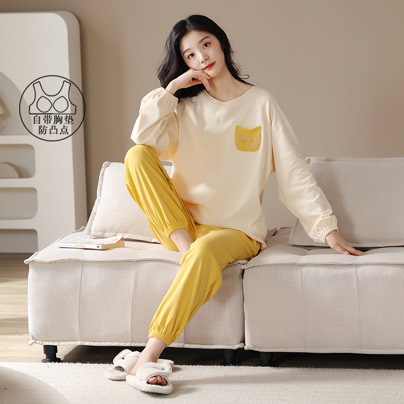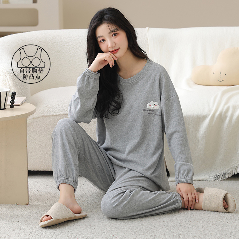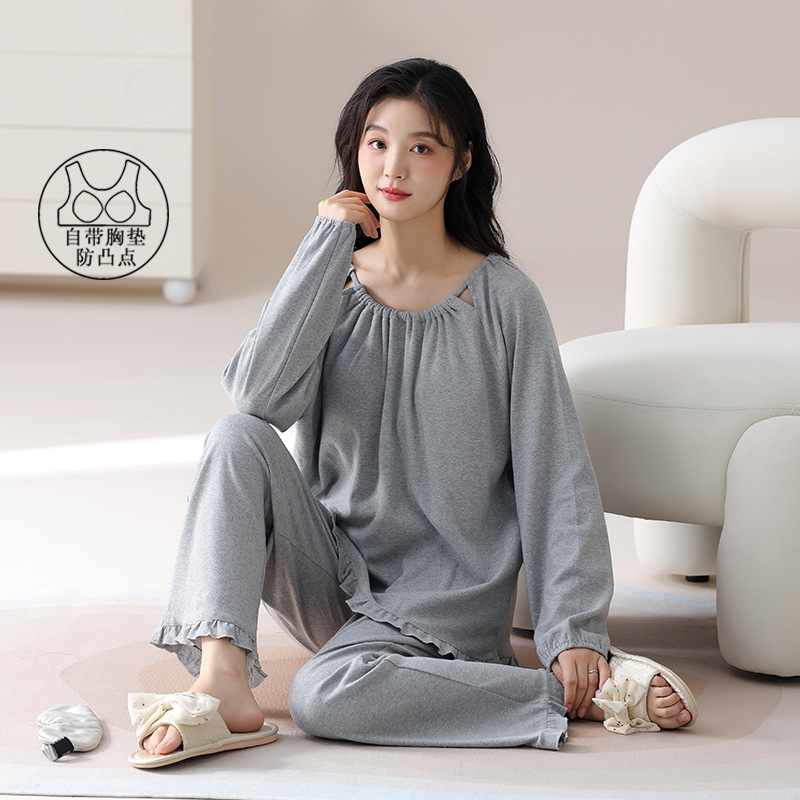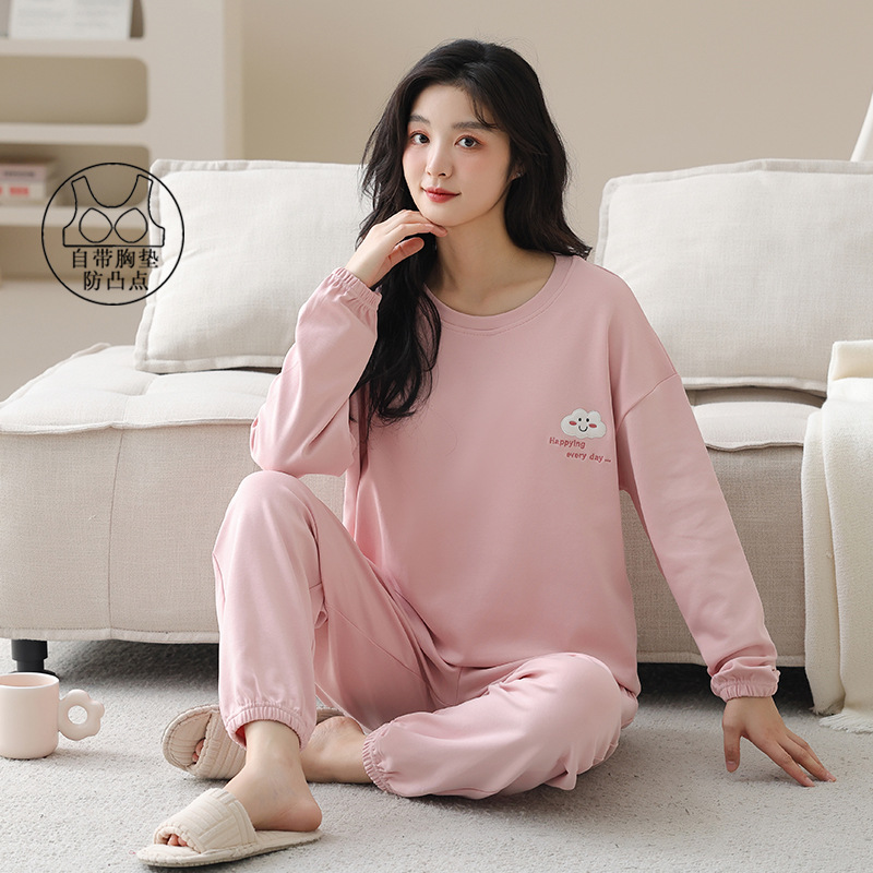 순면 잠옷 여자 가슴 패드 가을 단색 긴 소매 바지 요정 스타일 겉옷 느슨한 홈 의류 세트스토어 가기