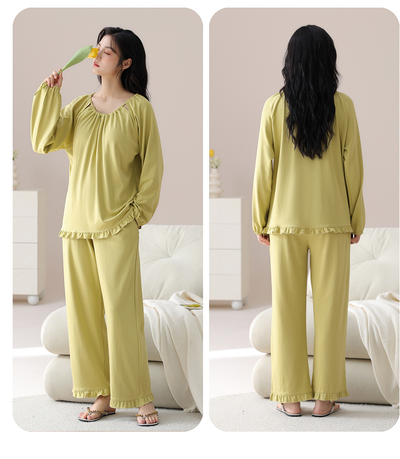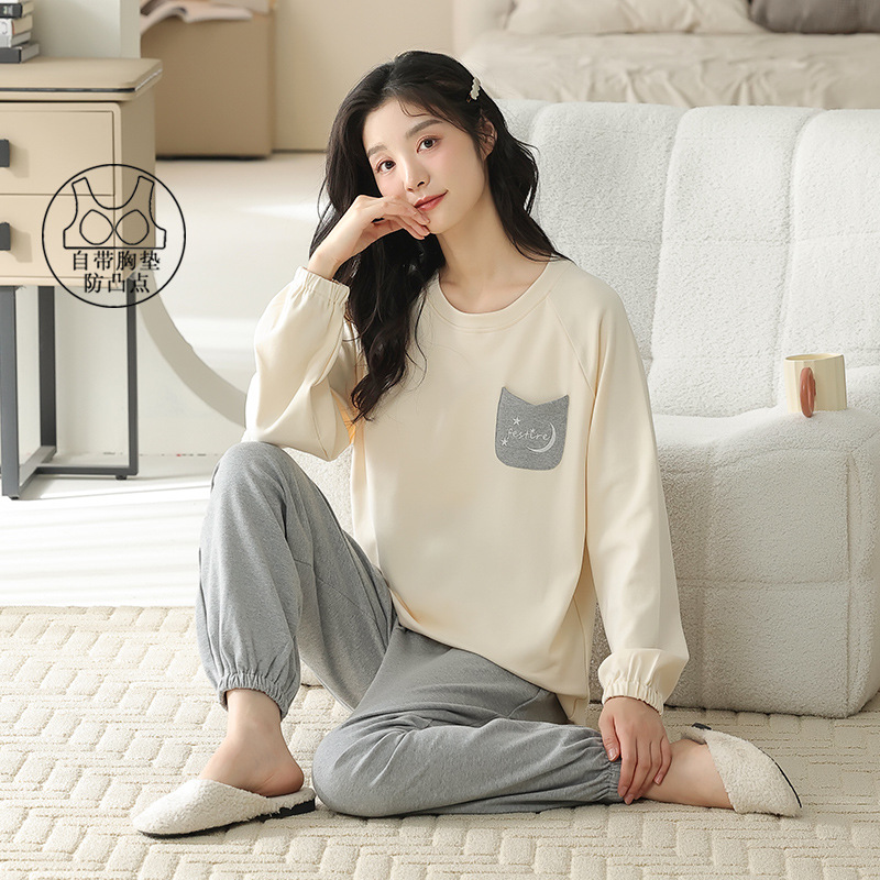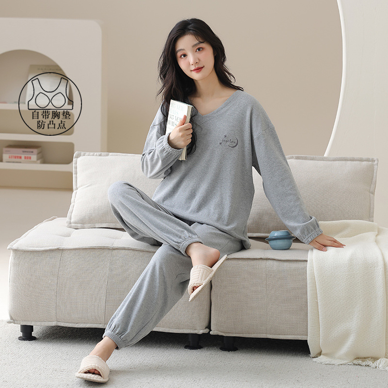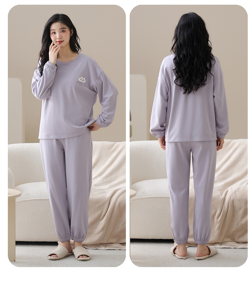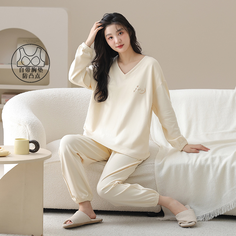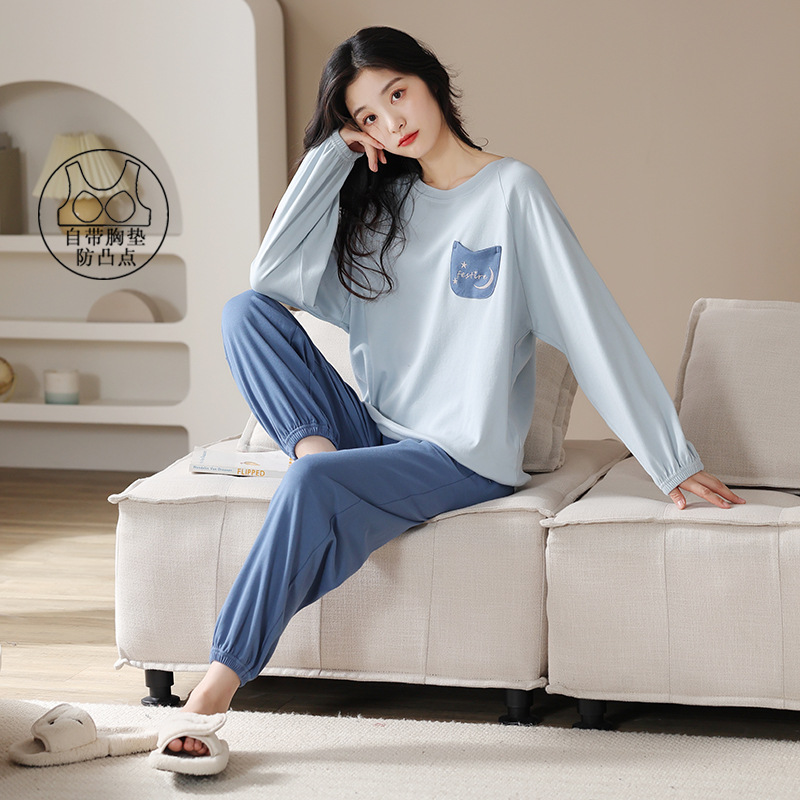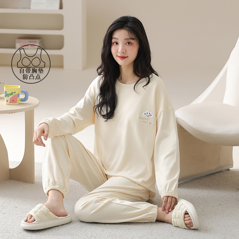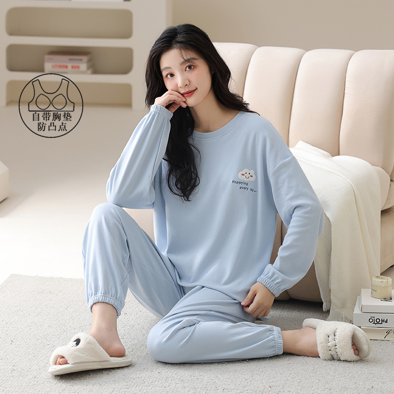 순면 잠옷 여자 가슴 패드 가을 단색 긴 소매 바지 요정 스타일 겉옷 느슨한 홈 의류 세트스토어 가기