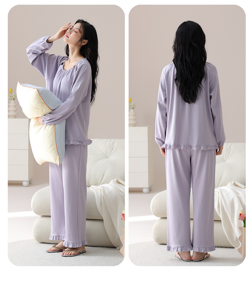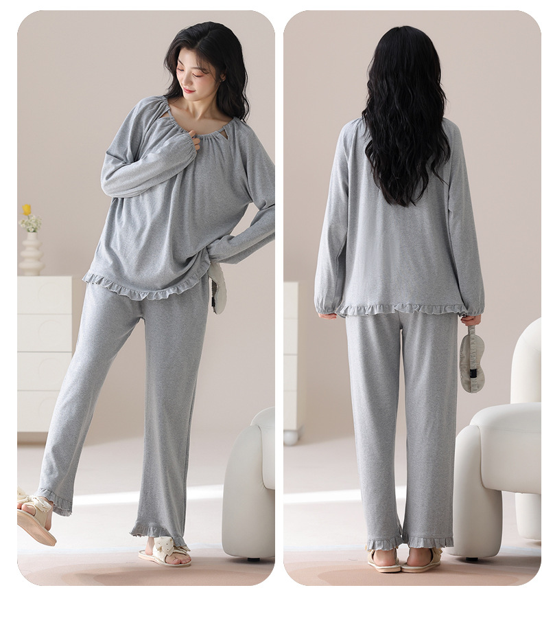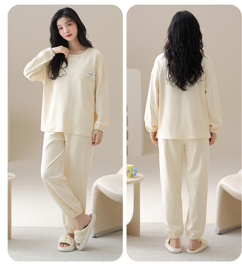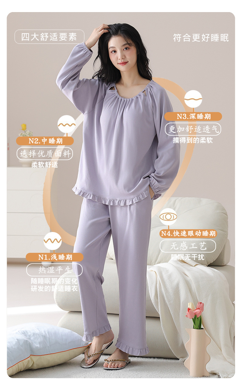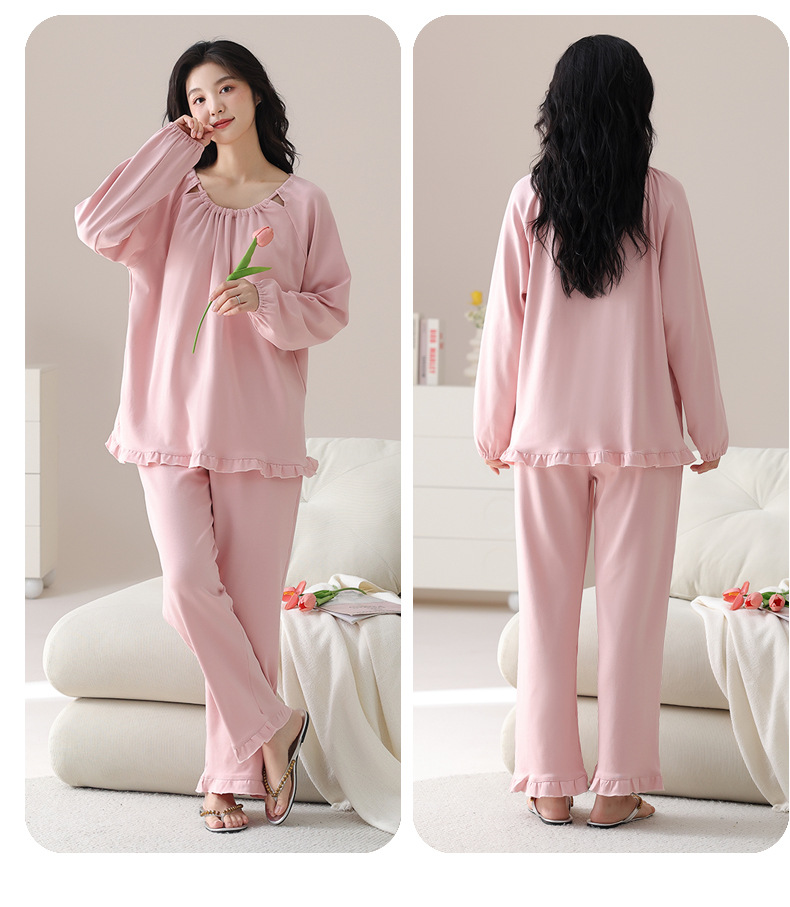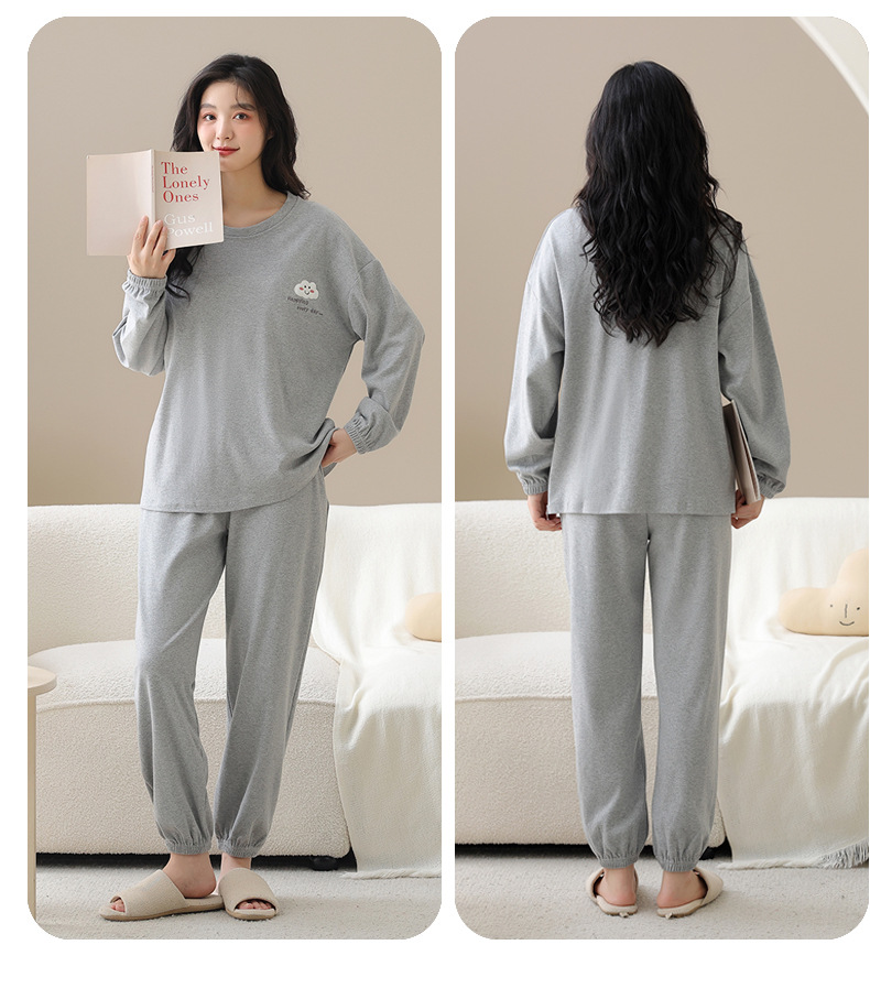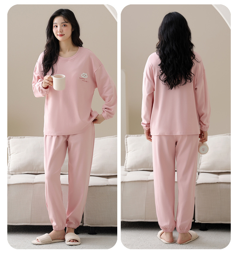 순면 잠옷 여자 가슴 패드 가을 단색 긴 소매 바지 요정 스타일 겉옷 느슨한 홈 의류 세트스토어 가기