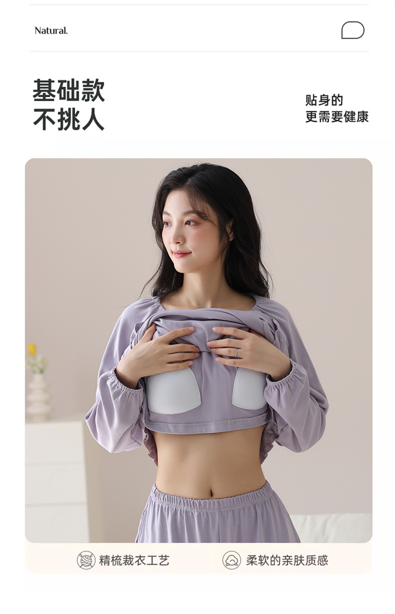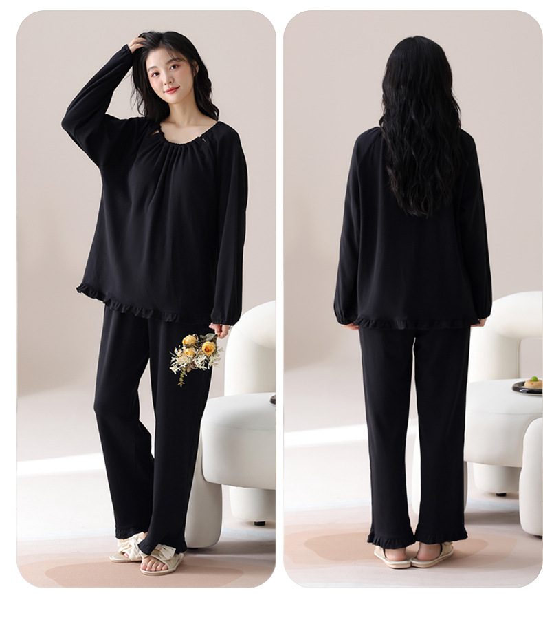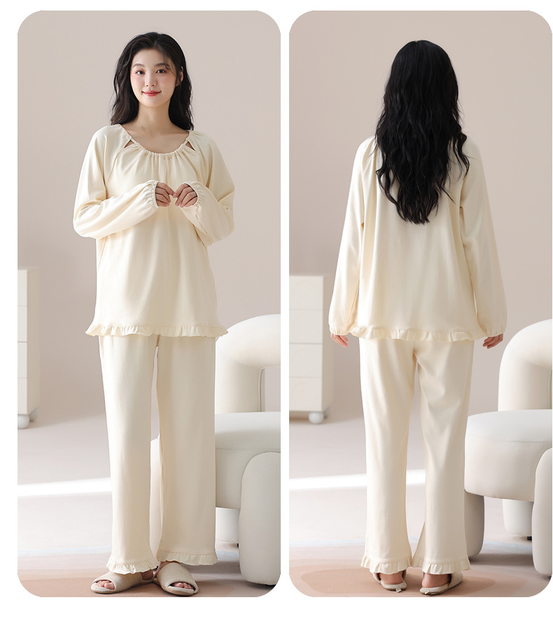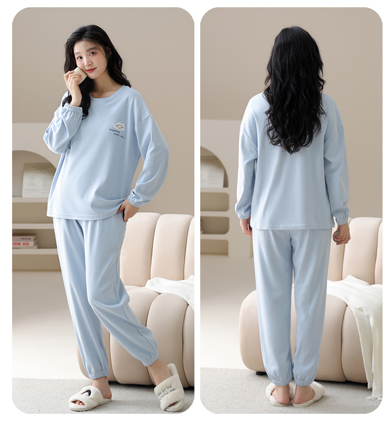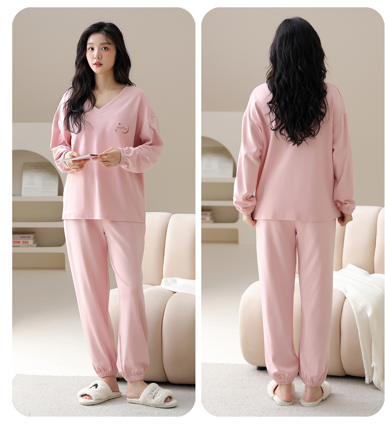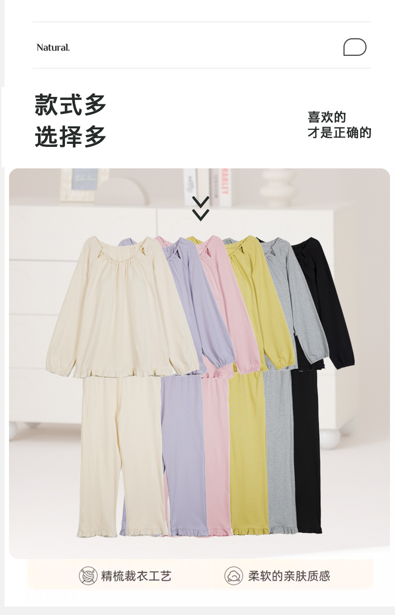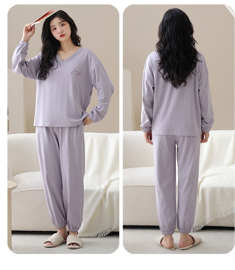 순면 잠옷 여자 가슴 패드 가을 단색 긴 소매 바지 요정 스타일 겉옷 느슨한 홈 의류 세트스토어 가기